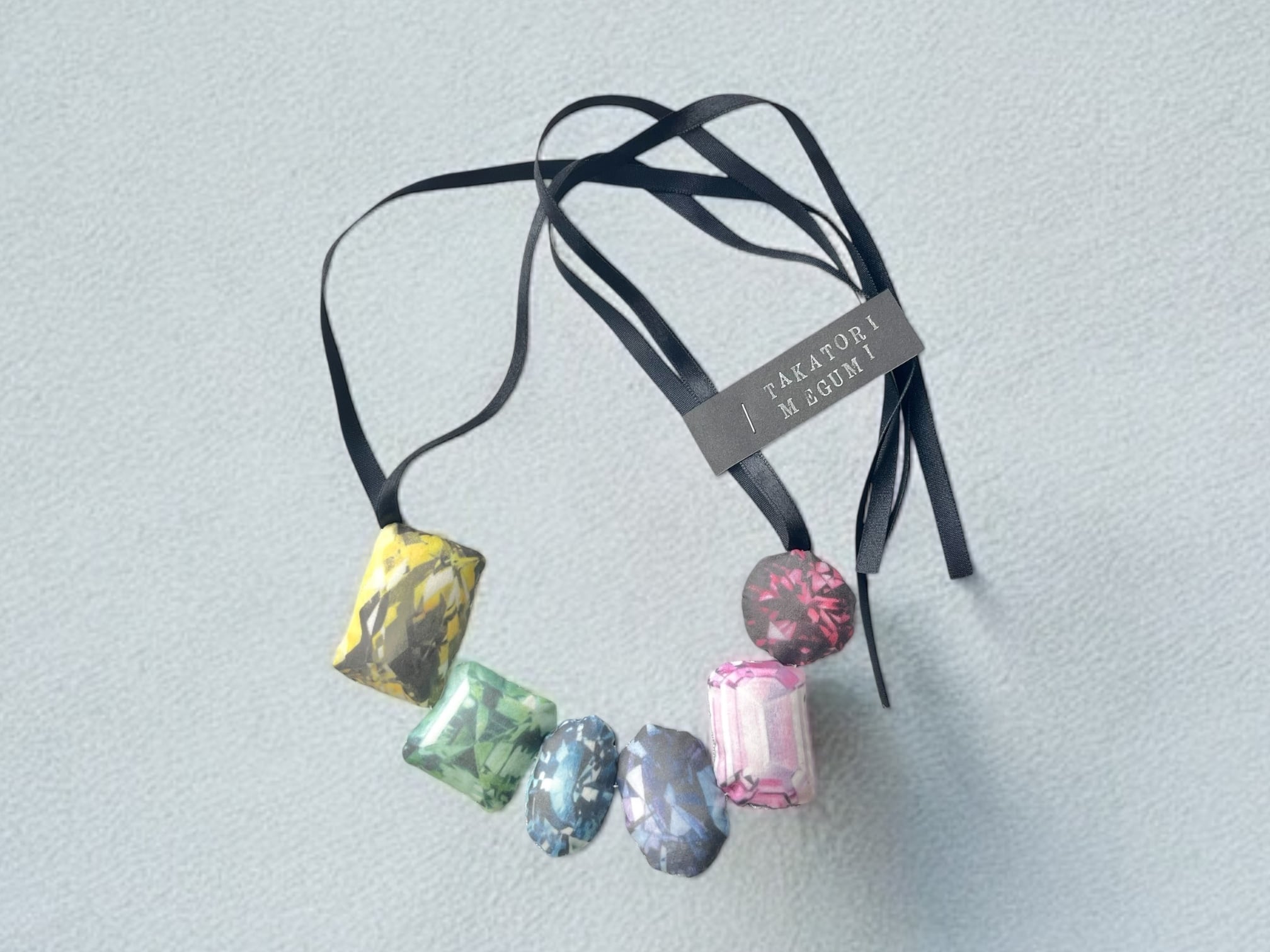 takatori megumiさんが、実際に描かれたものをもとに、布に写し、一つ一つ手縫いで仕上げられているビジューモチーフのネックレス