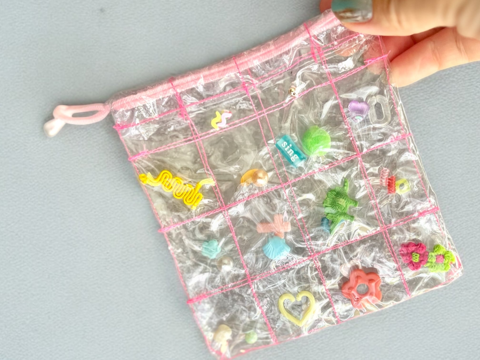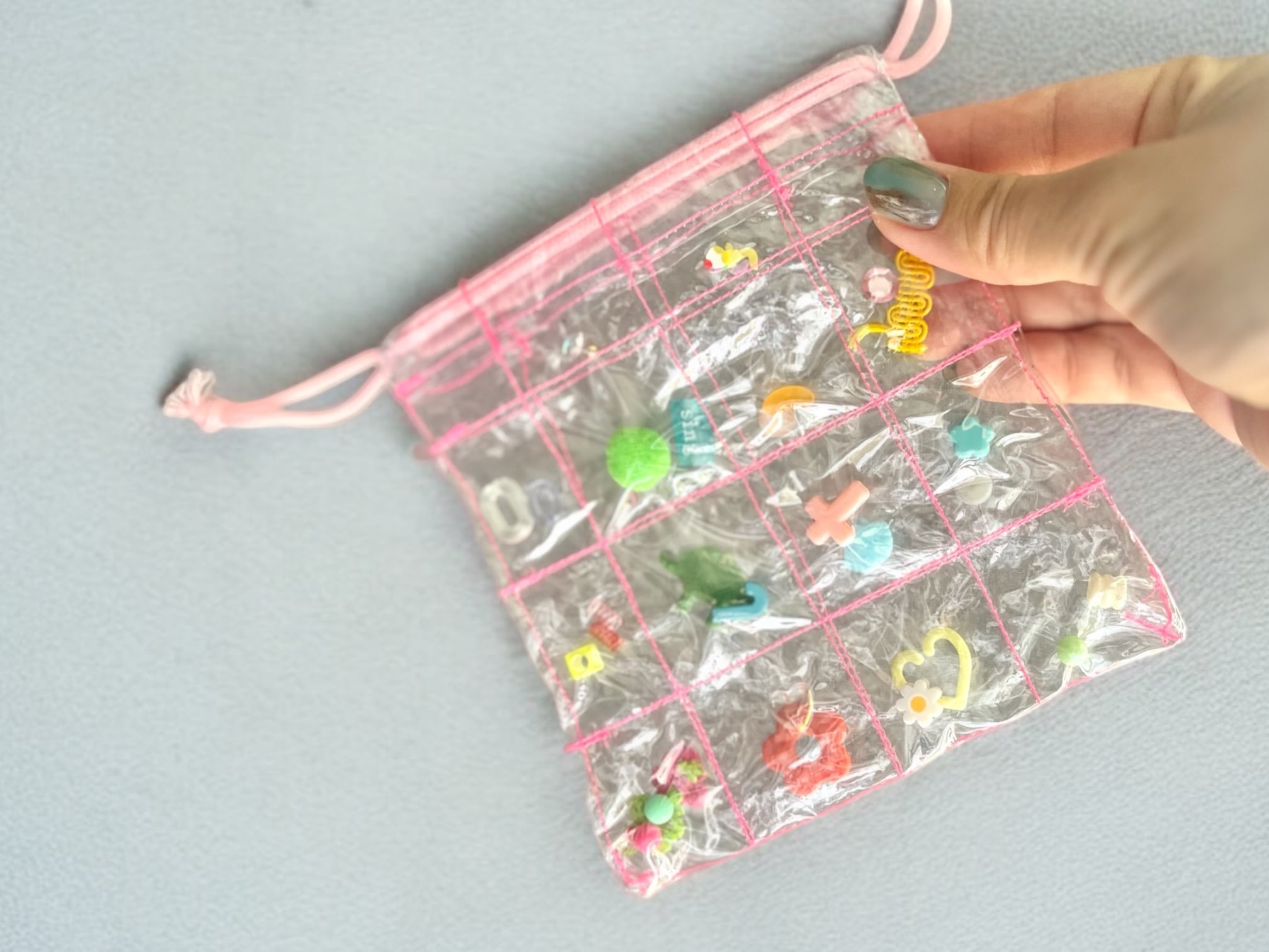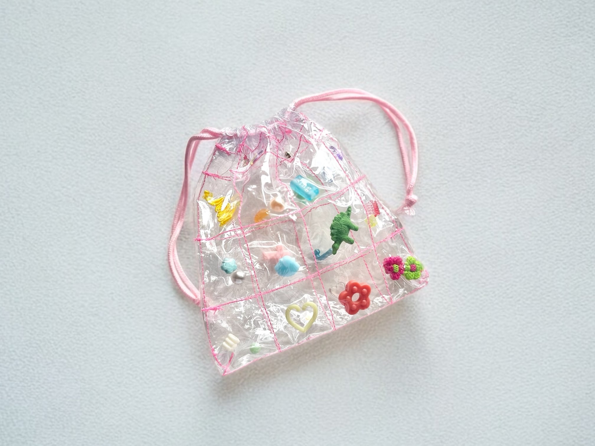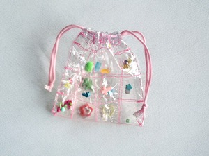 小さなおもちゃパーツやビーズ、消しゴムなどが沢山散りばめられた巾着ポーチ