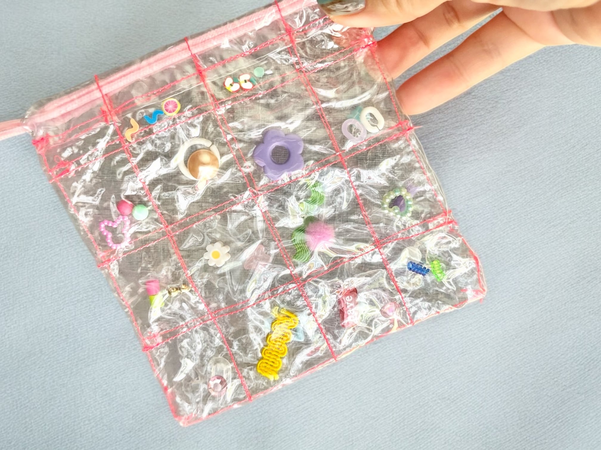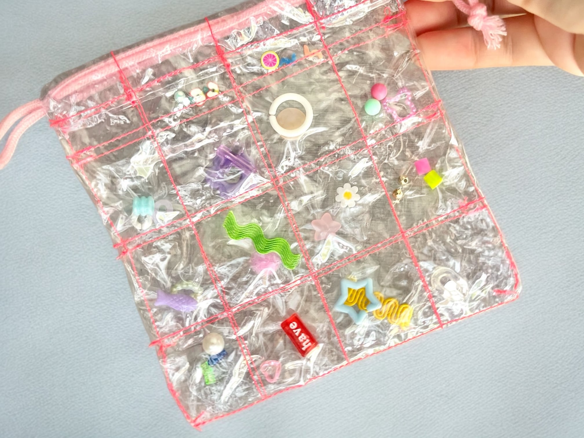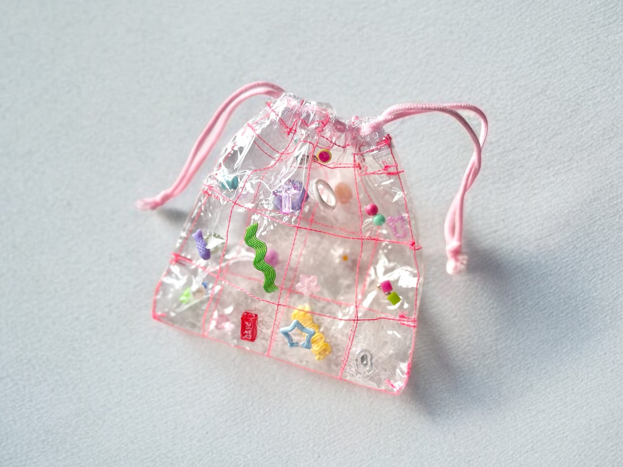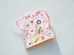 小さなおもちゃパーツやビーズ、消しゴムなどが沢山散りばめられた巾着ポーチ
