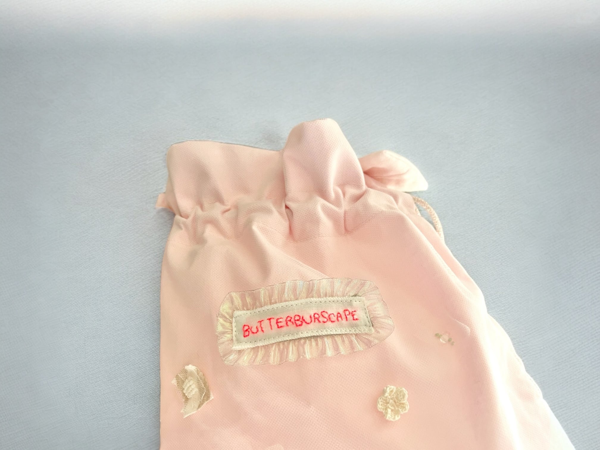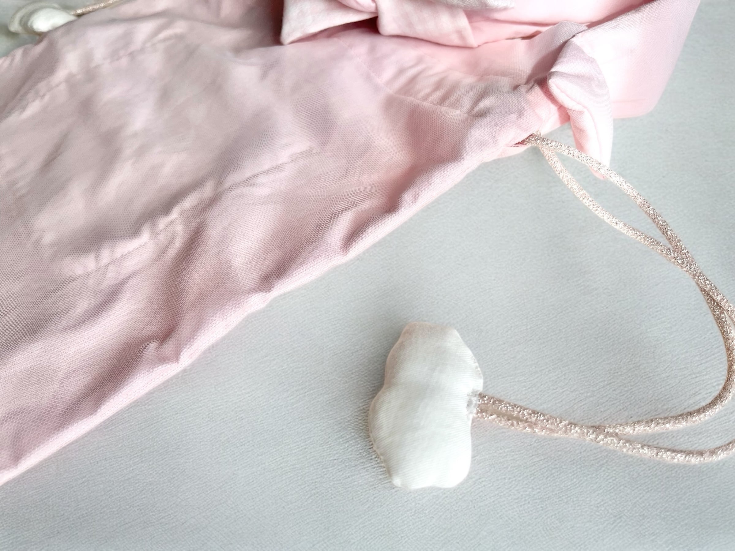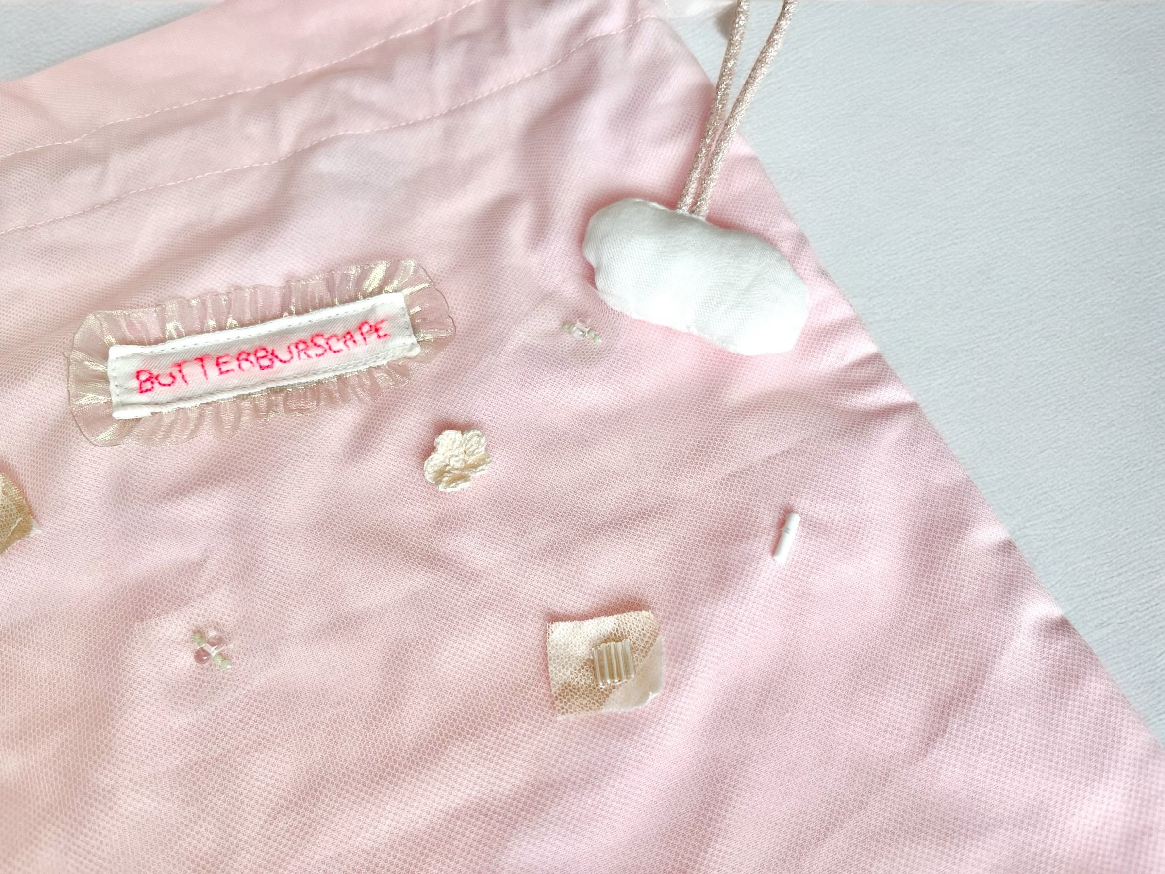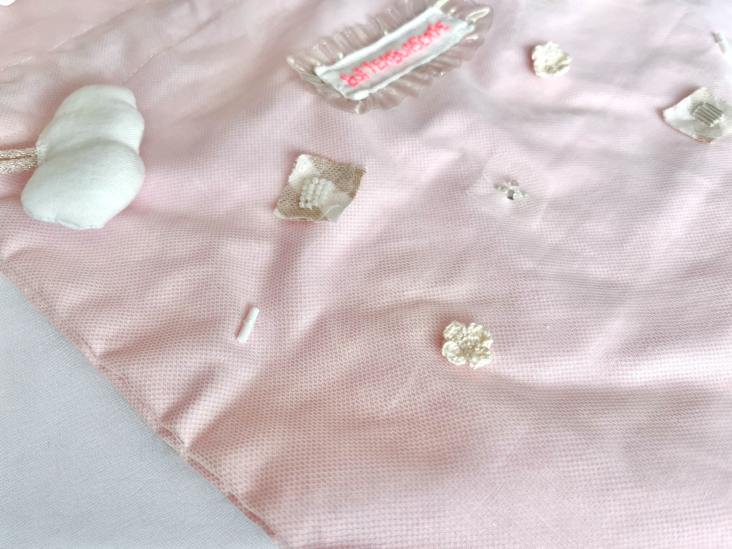 淡いピンクの布部分はチュールが重ねられています。とても繊細で細かいところに作家様の愛が感じられる一点です。