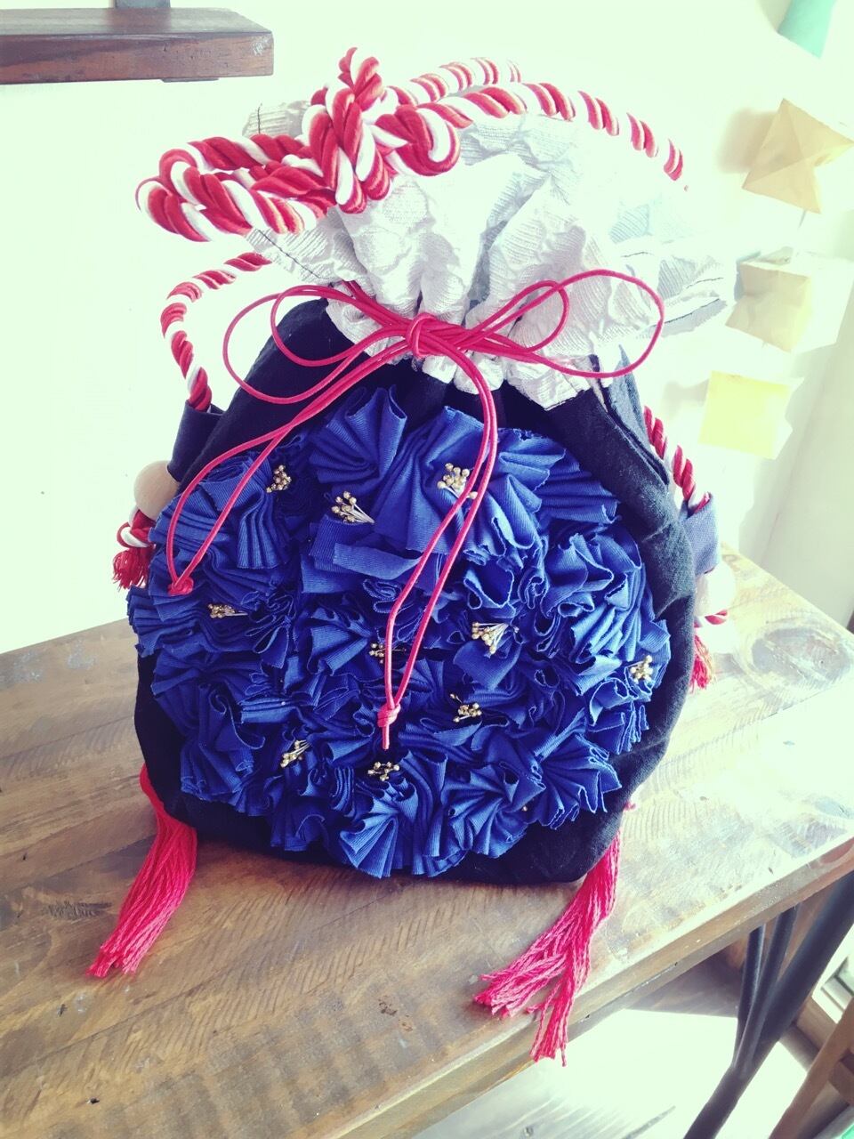 素材:ベルベッド、蝋引きコード、ロープ、ニット、花芯、ウッドビーズ、チャイナボタン、糸