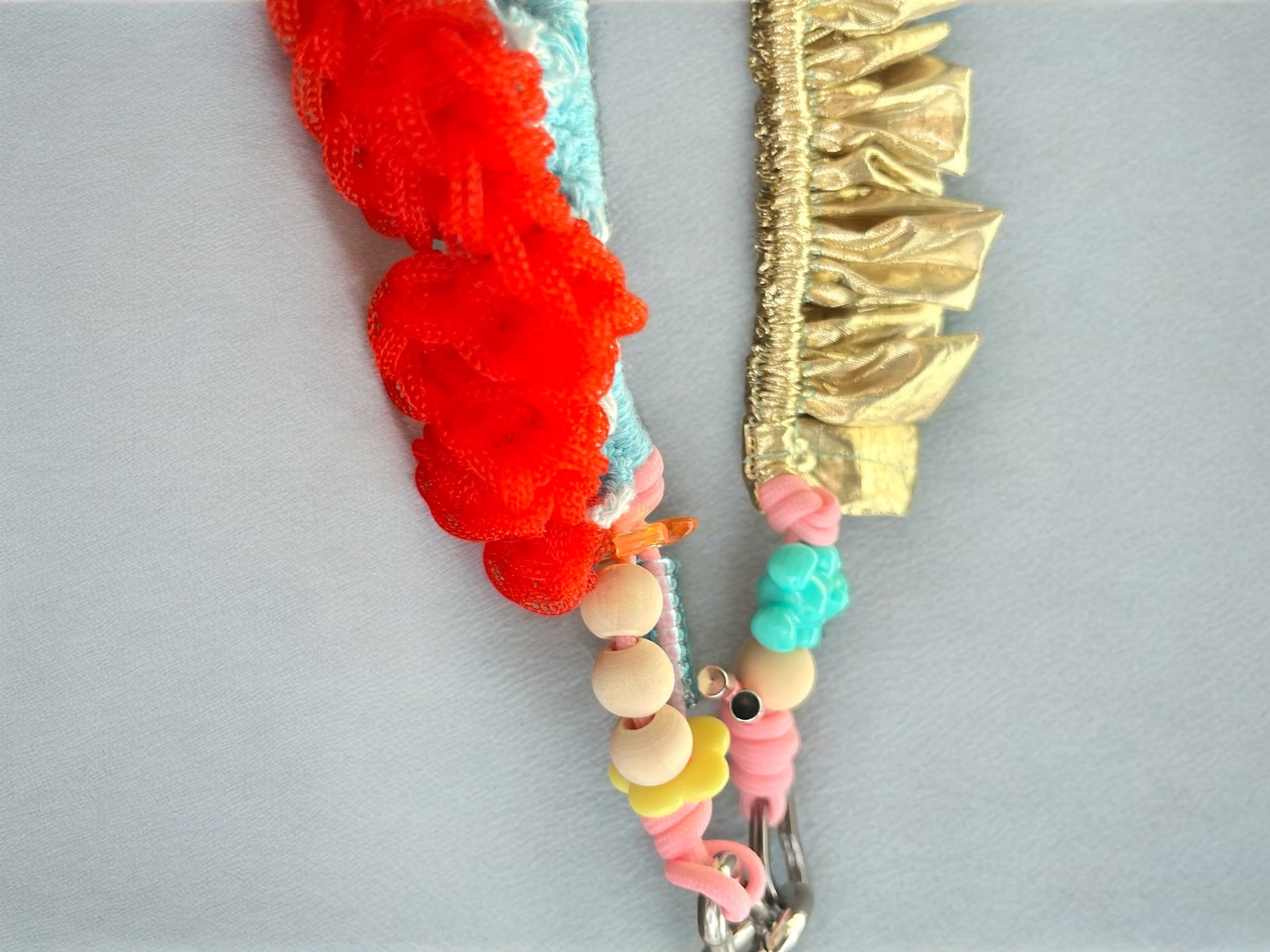 オーガンジーやサテン、くるくるしたチューブのような素材など、カラフルな異素材の組み合わせにプラスチックパーツなども入ったかわいいストラップです。