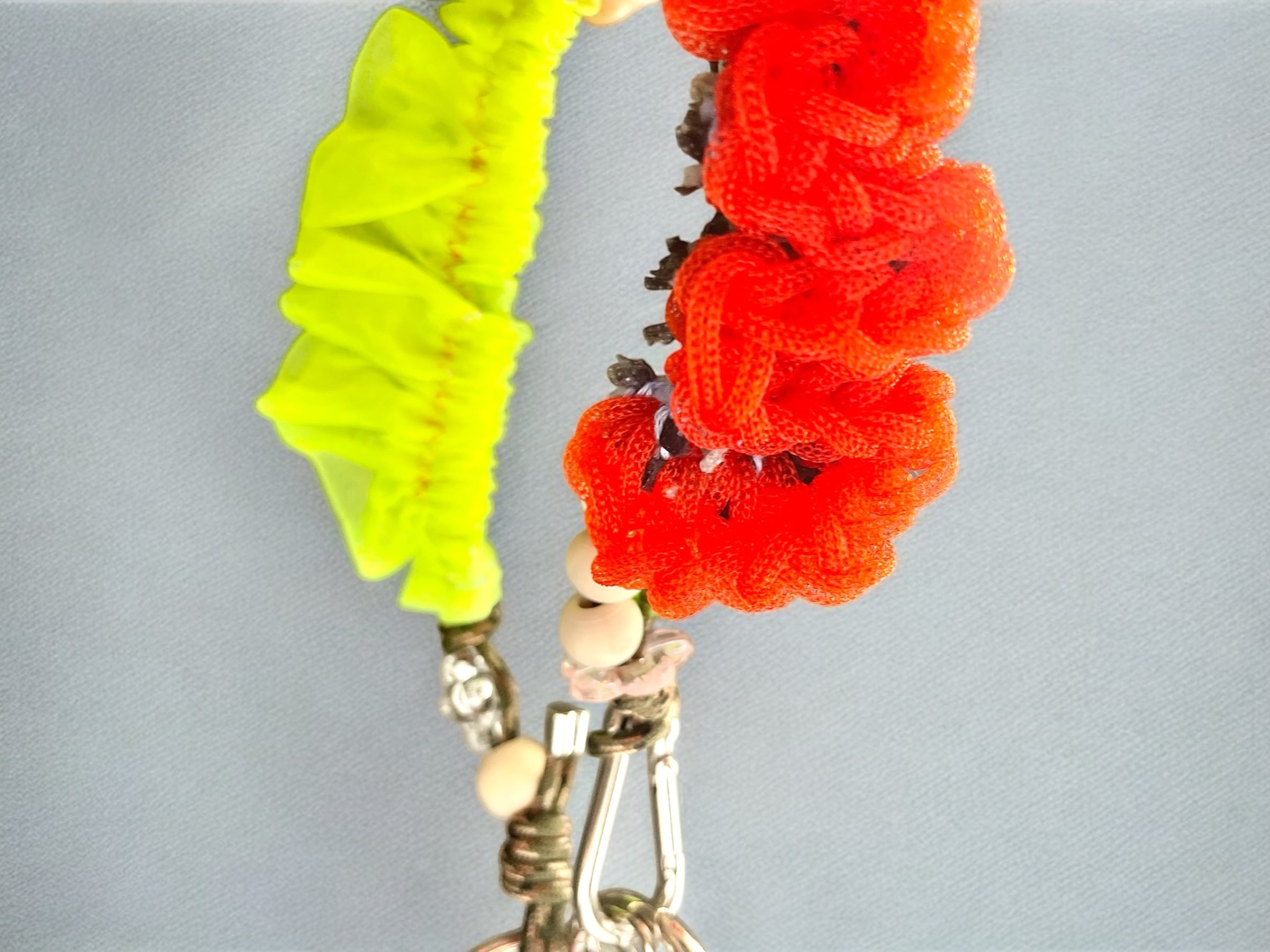 オーガンジーやサテン、くるくるしたチューブのような素材など、カラフルな異素材の組み合わせにプラスチックパーツなども入ったかわいいストラップです。