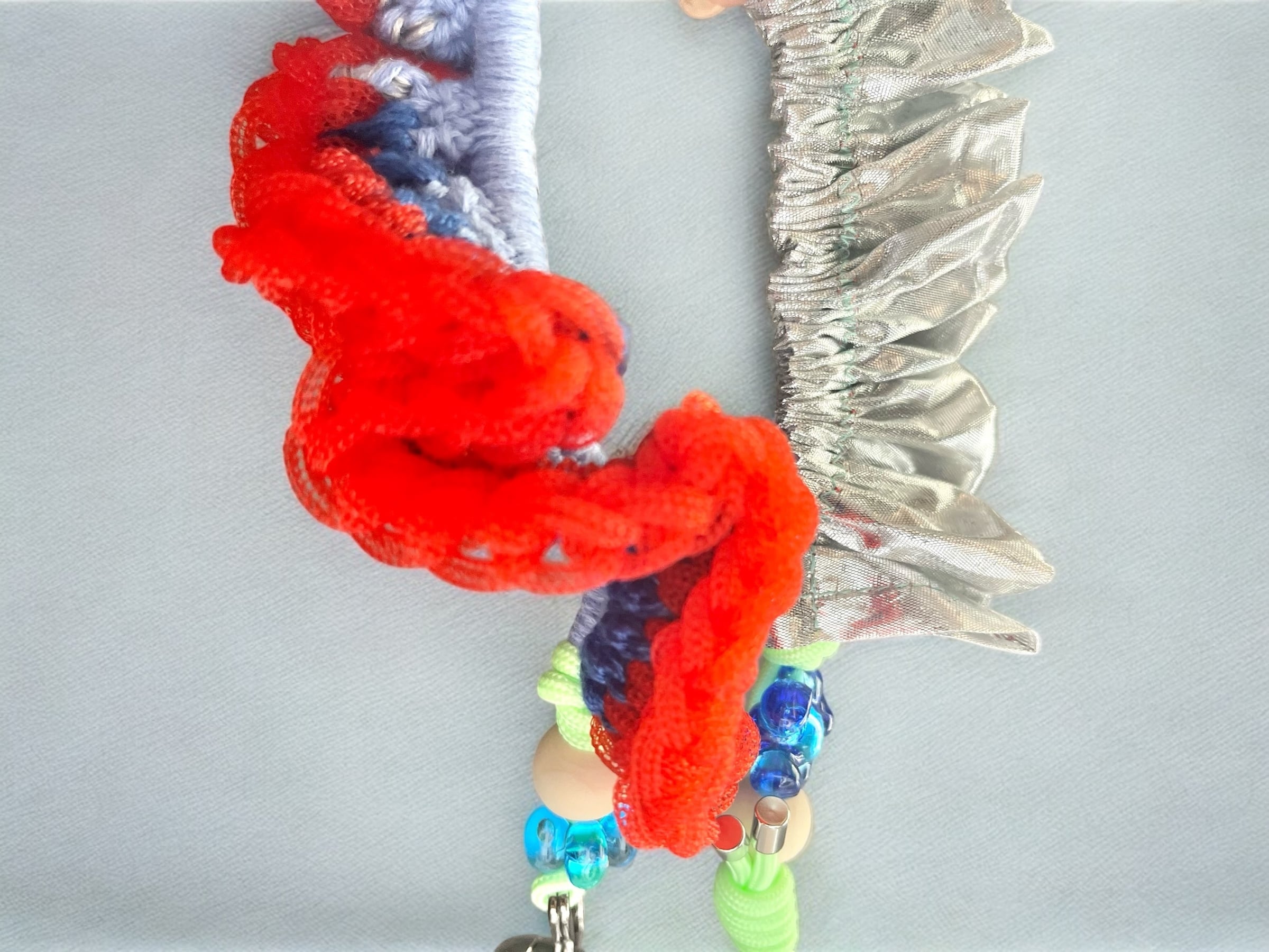 オーガンジーやサテン、くるくるしたチューブのような素材など、カラフルな異素材の組み合わせにプラスチックパーツなども入ったかわいいストラップです。