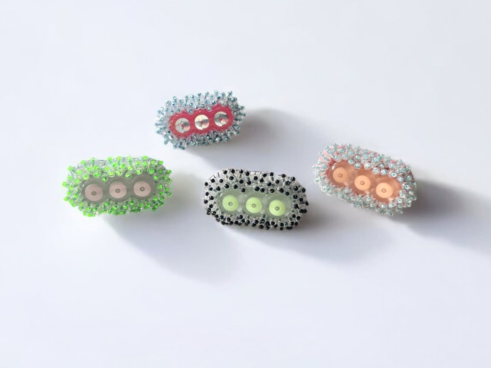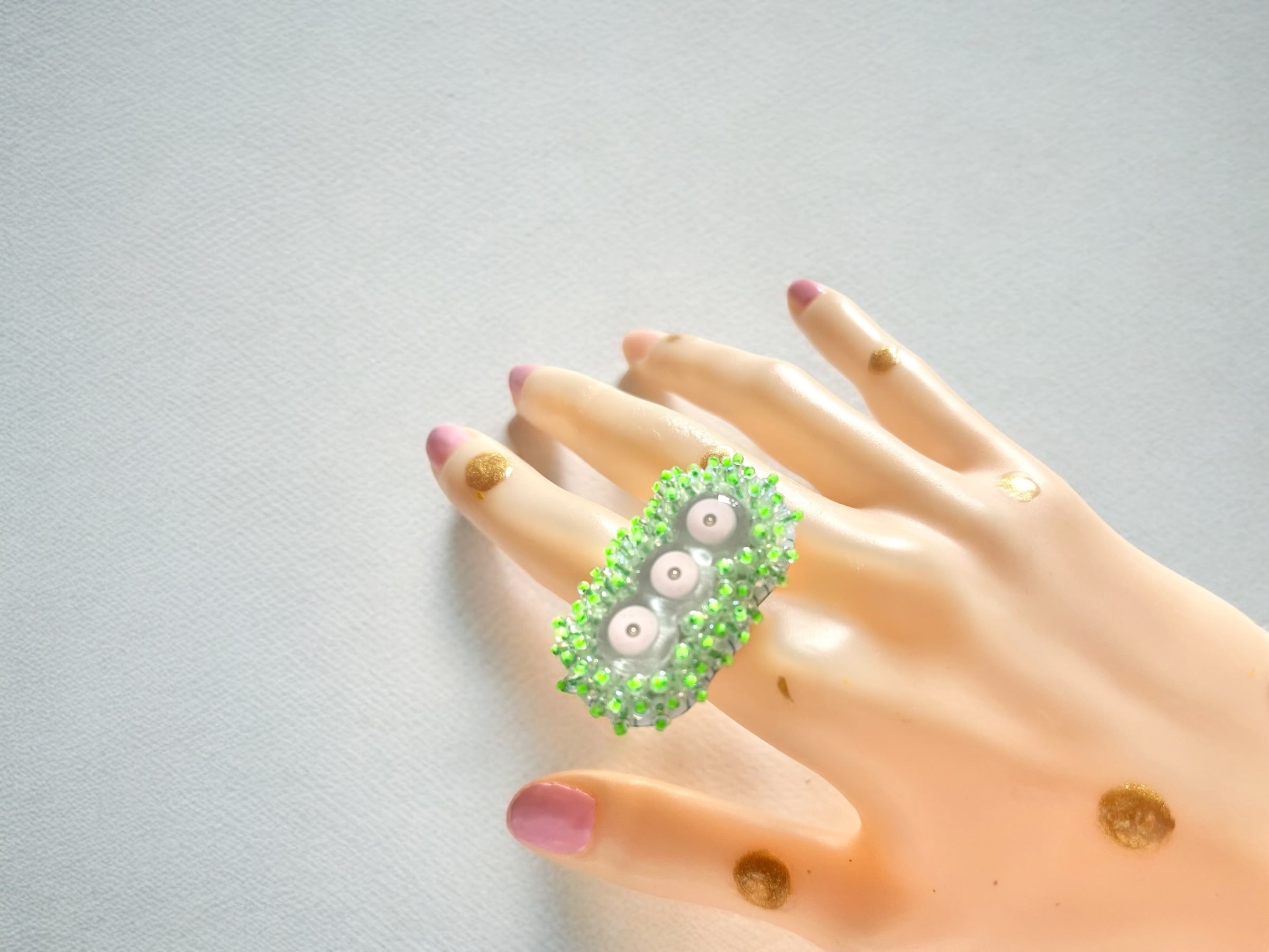 きらりと光る三ツ目のモジャ花リング