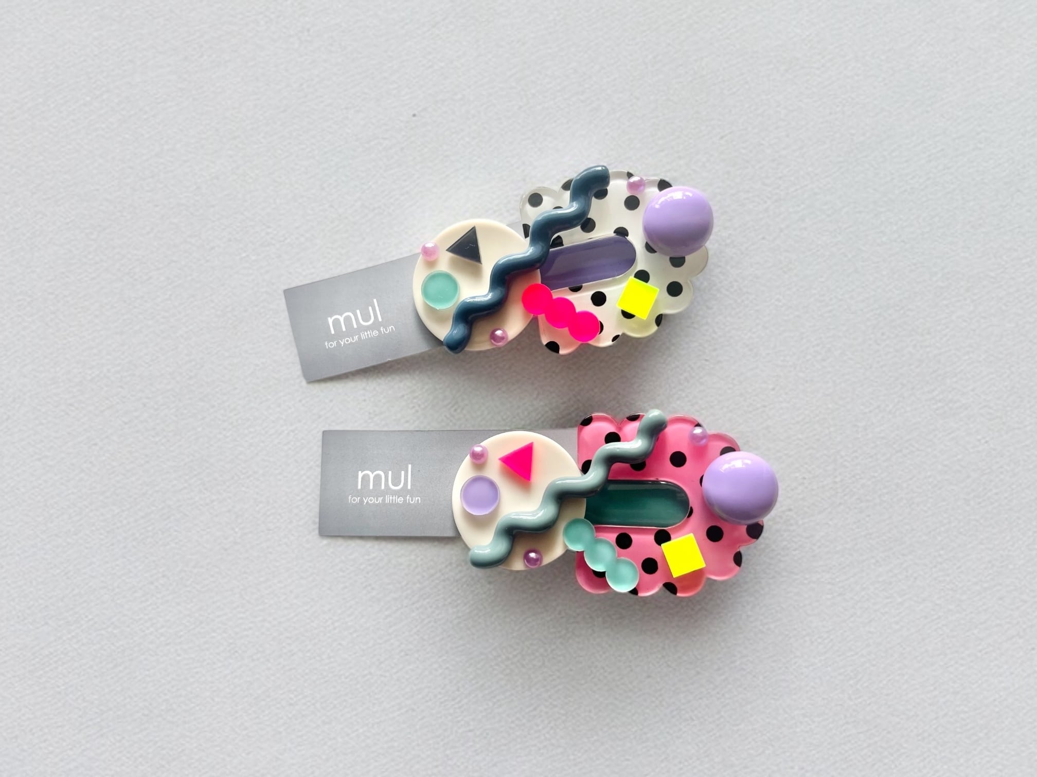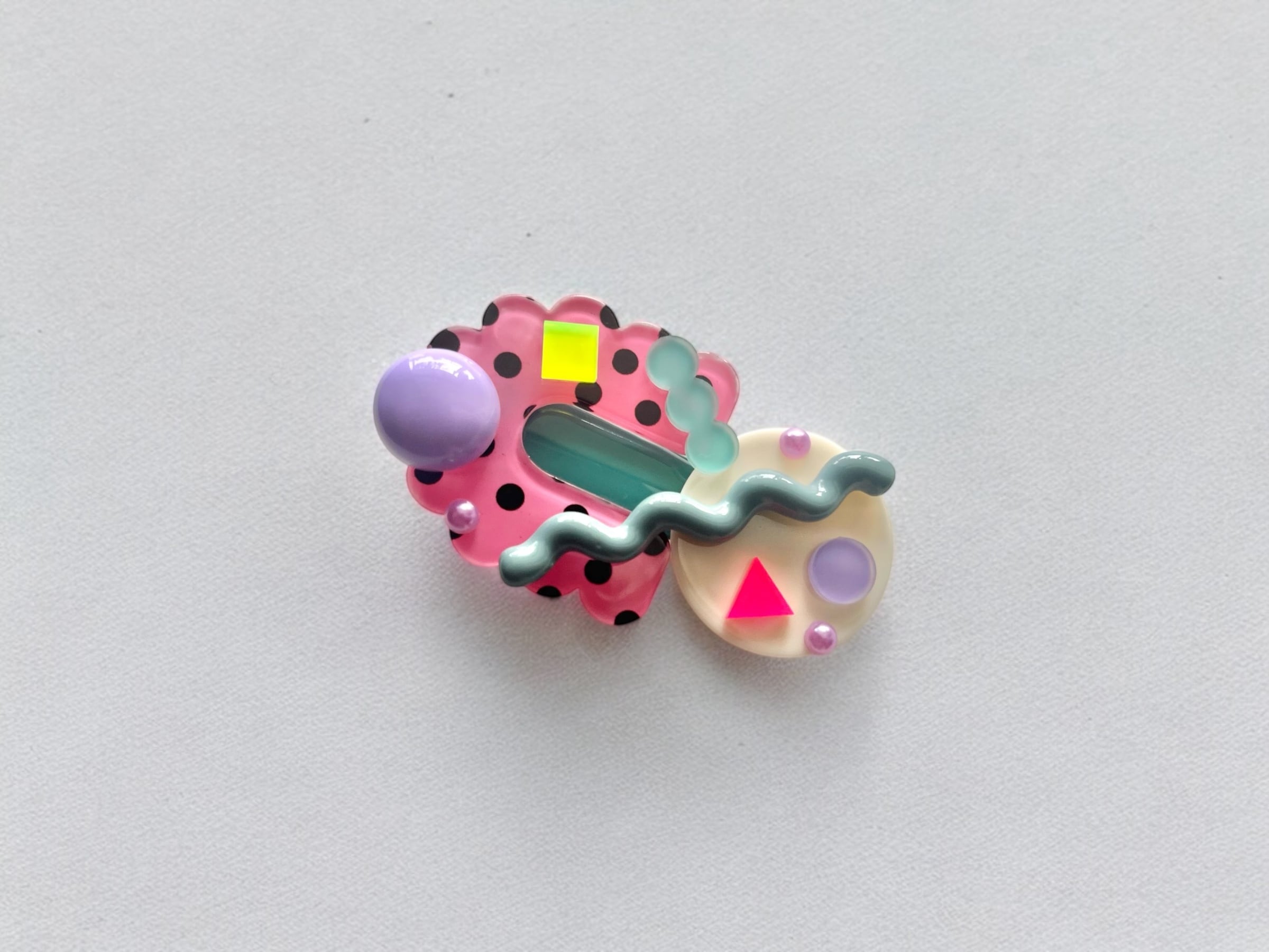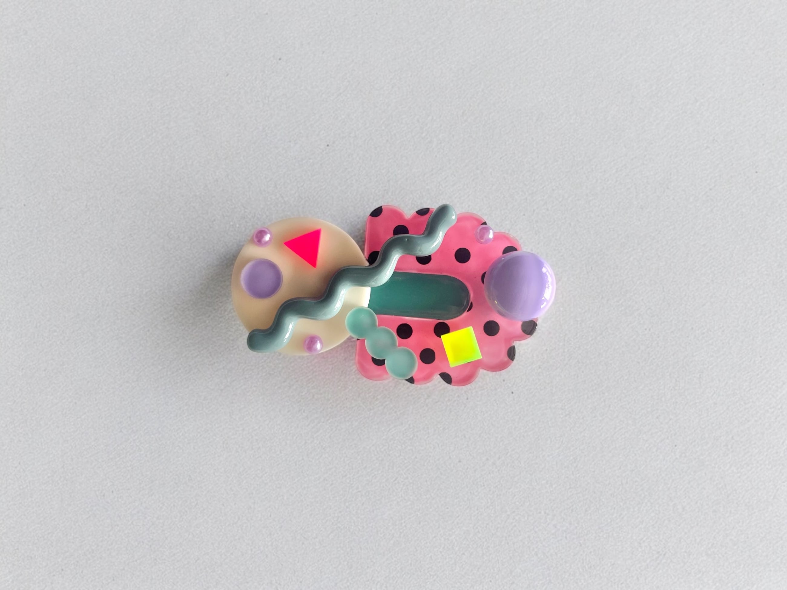 ドットパーツや丸パーツに異形のパーツの組み合わせがとてもユニークなヘアクリップ