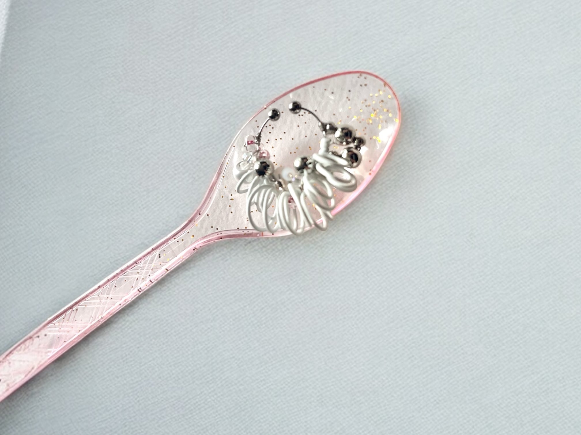 シルバーやピンクのビーズにホワイトのぐるぐる