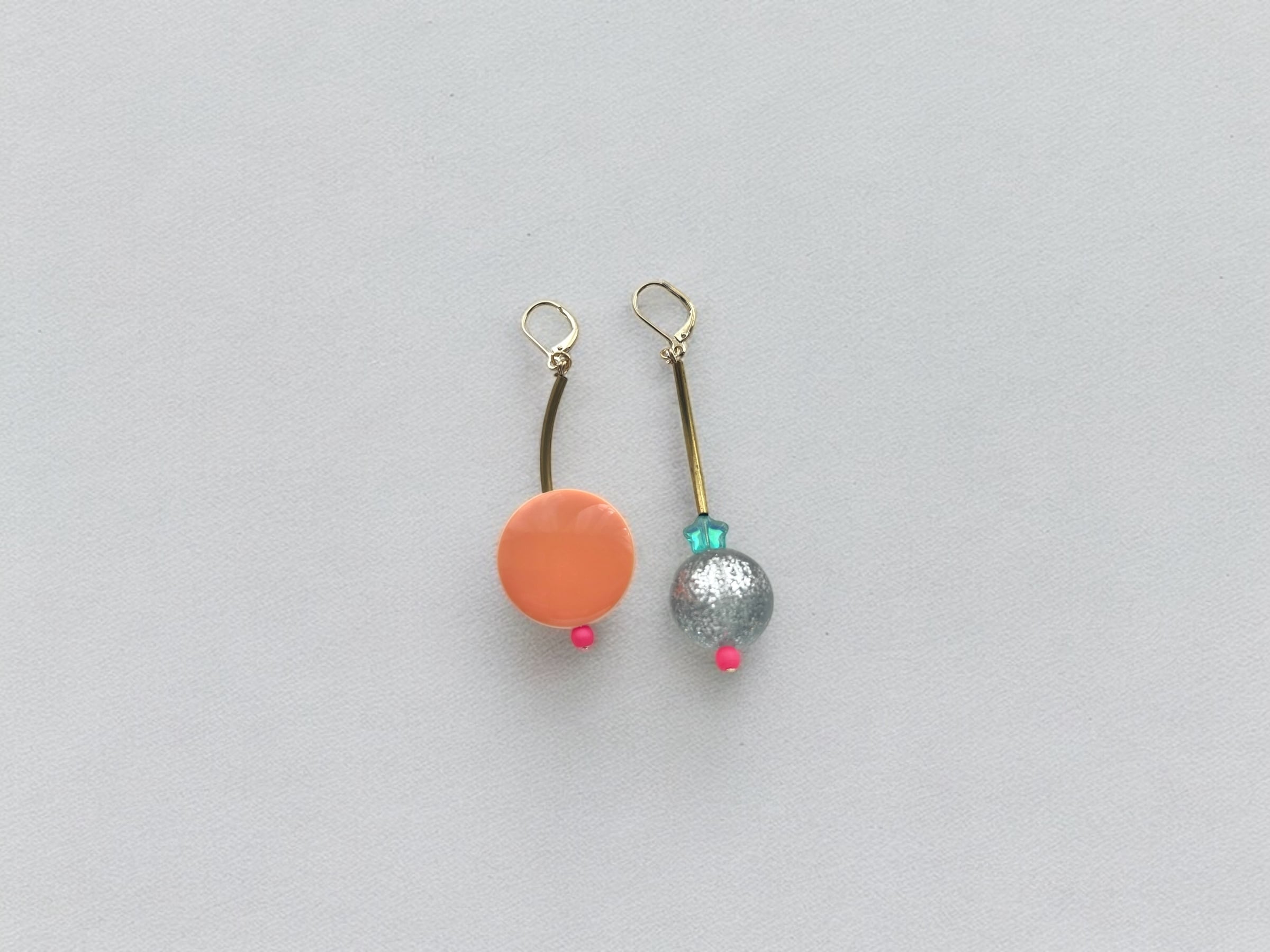 オレンジ×ピンクのデッドストックビーズや星形のチェコビーズなどを合わせたおしゃれでかわいいピアス