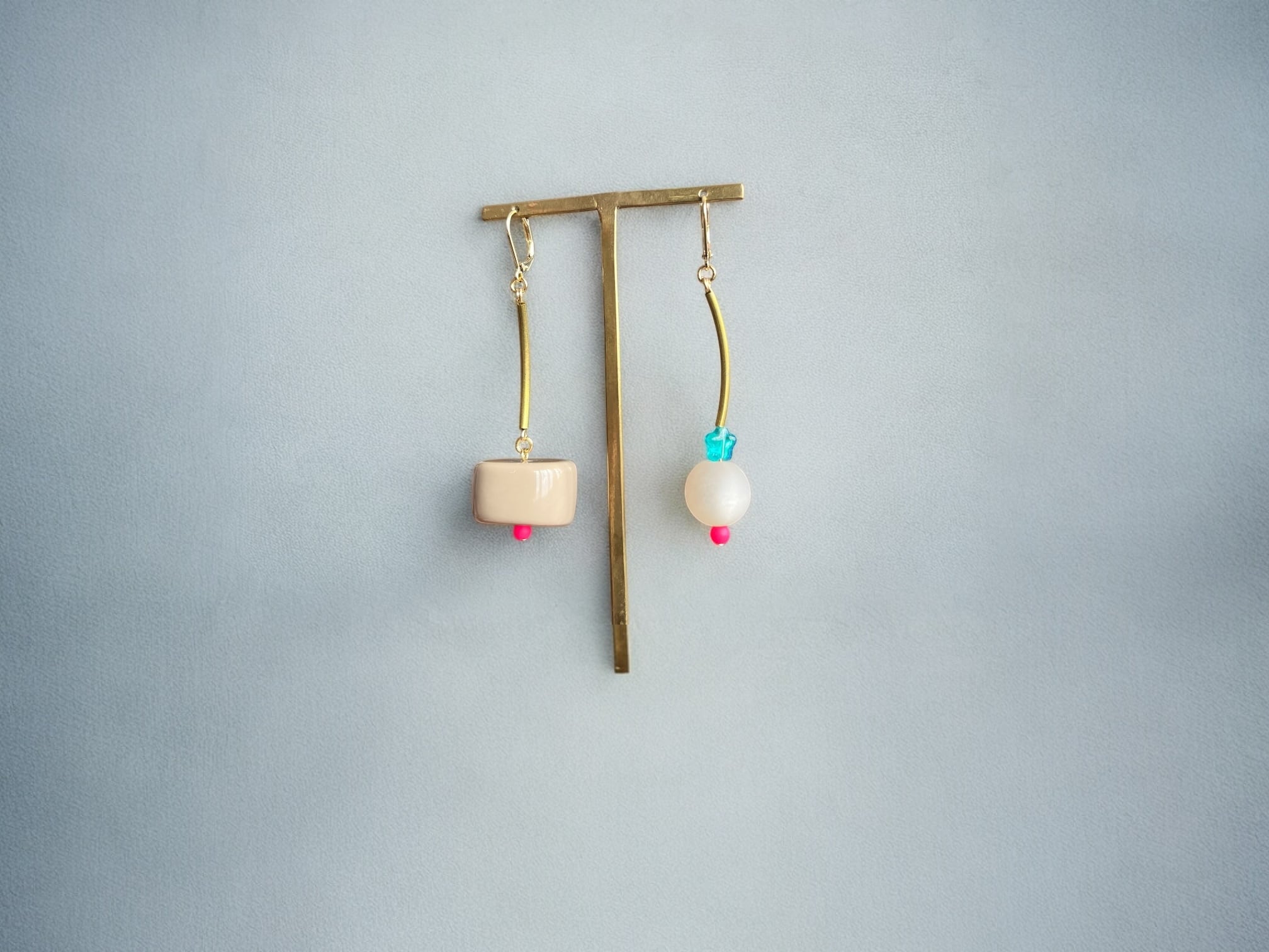 おしゃれな形のページュのヴィンテージ ビーズや星形のチェコビーズの組み合わせが素敵なピアスです。