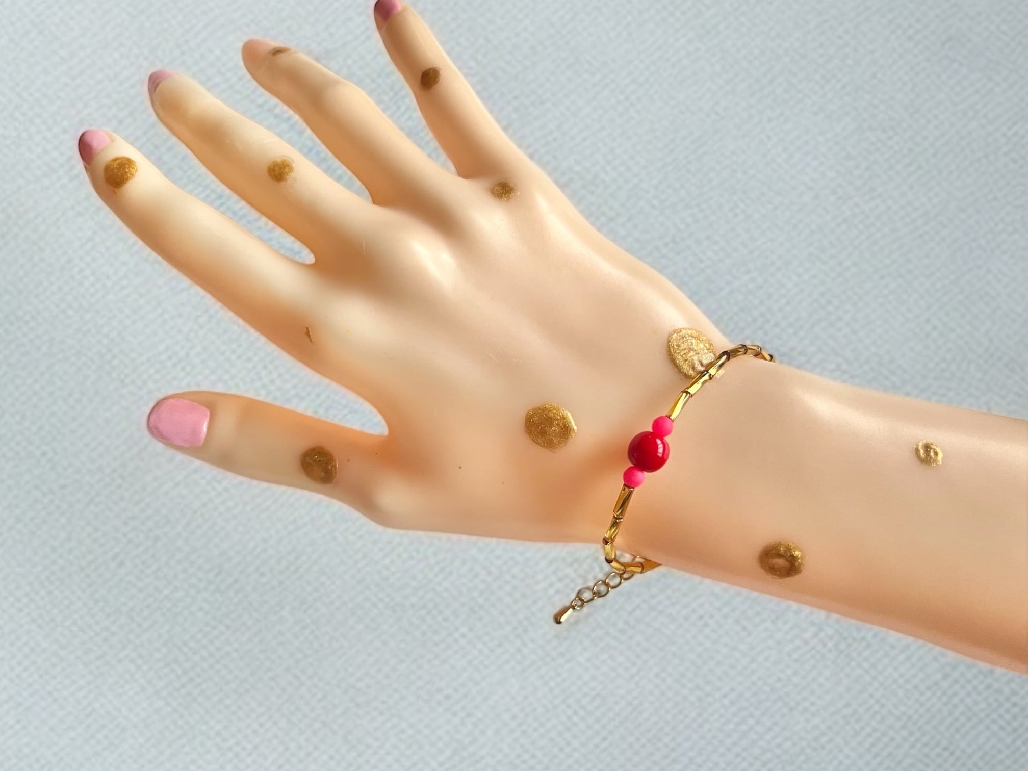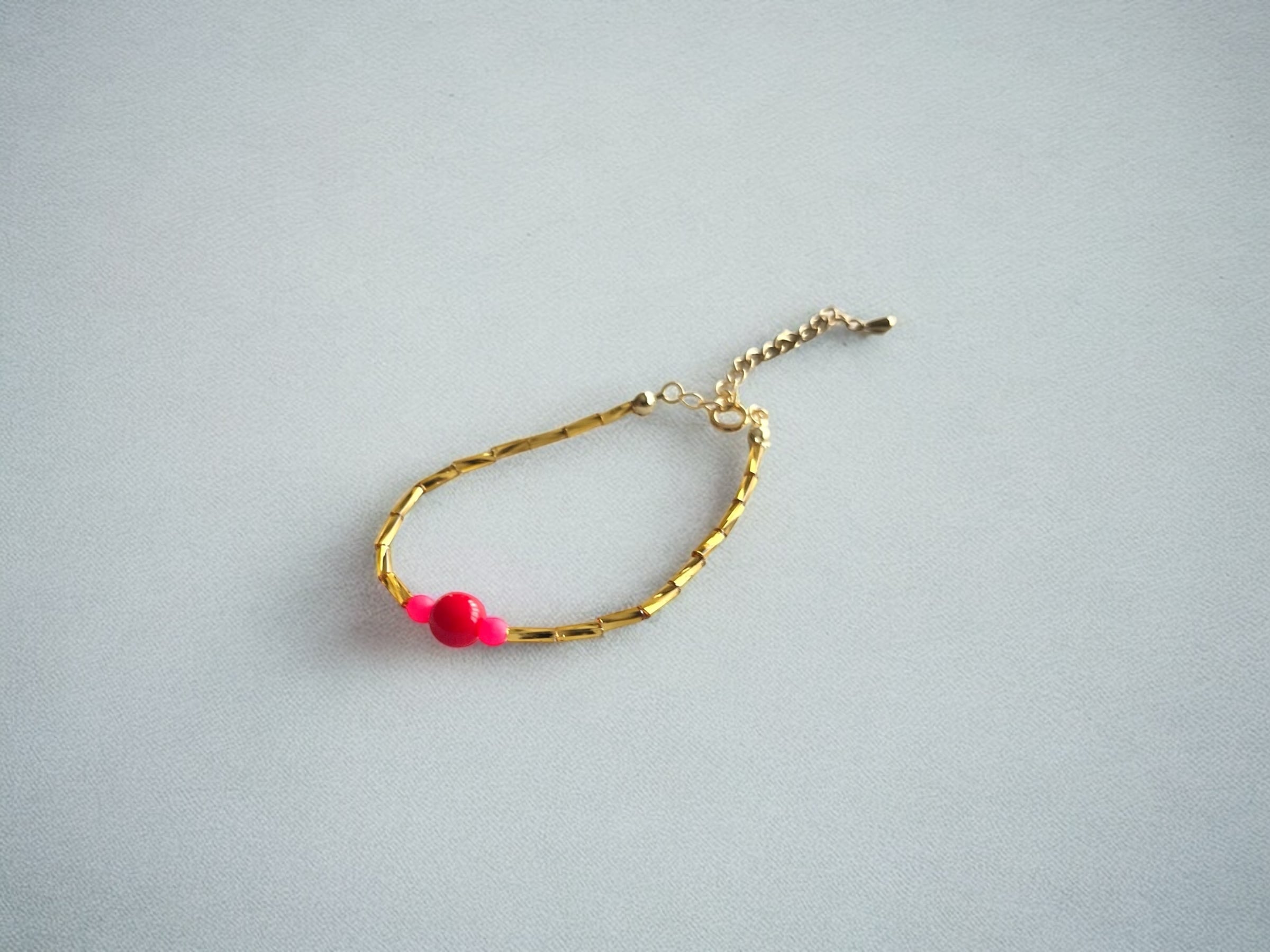 チェコ製のゴールドビーズはツイストがかかっていてきらきらと反射します。