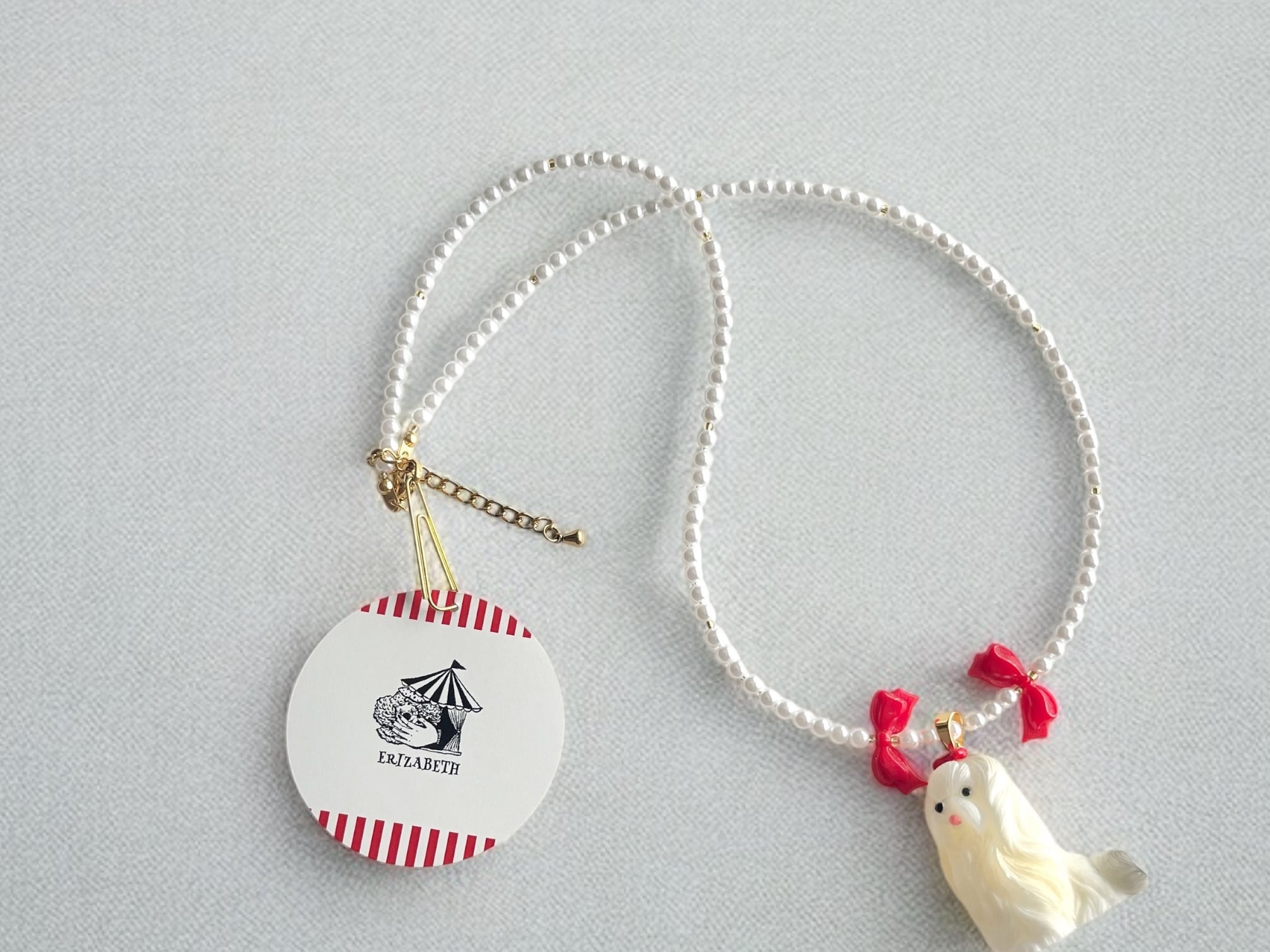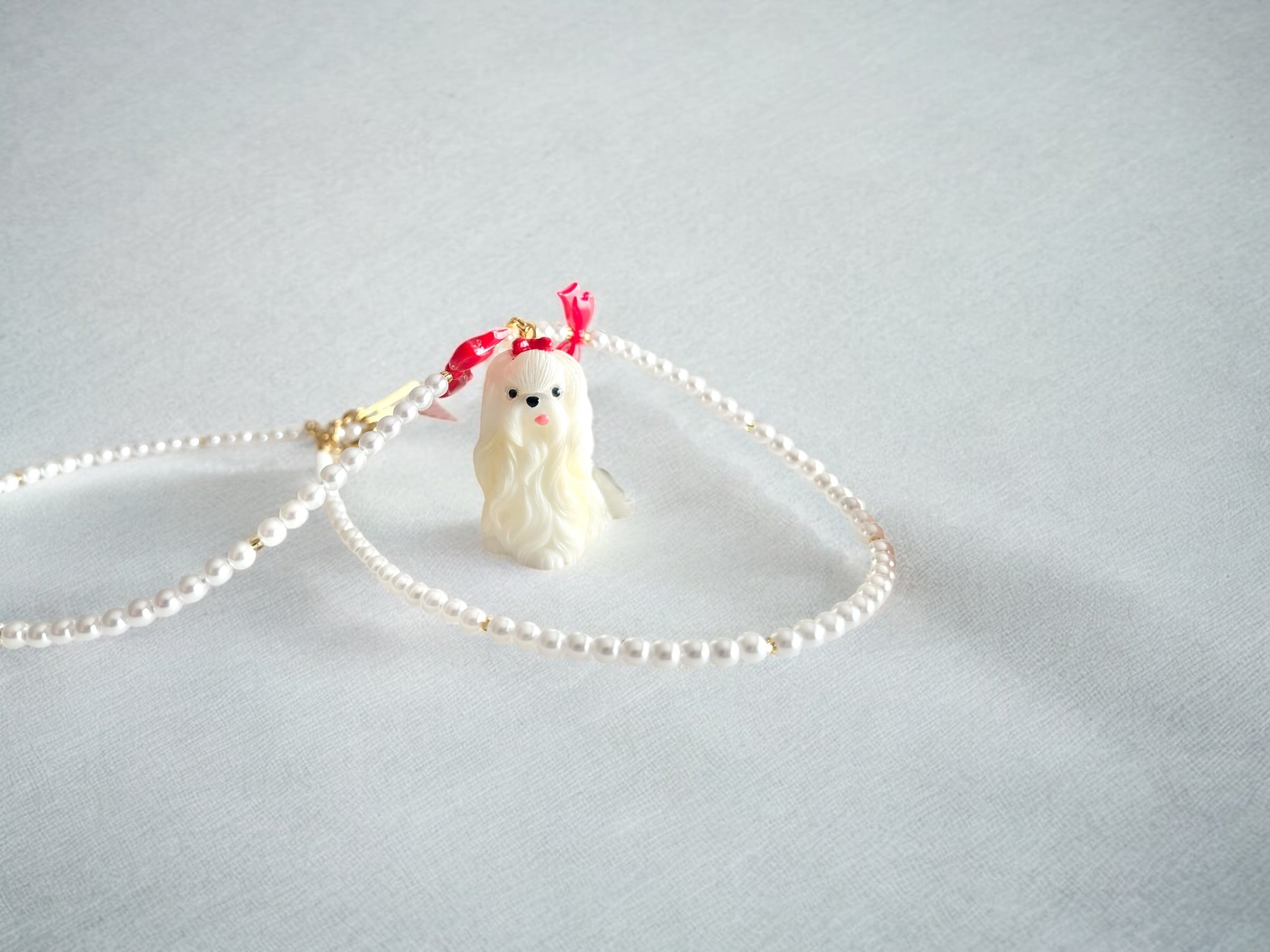 可愛らしいマルチーズとホワイトパーツ、レッドリボンの組み合わせ