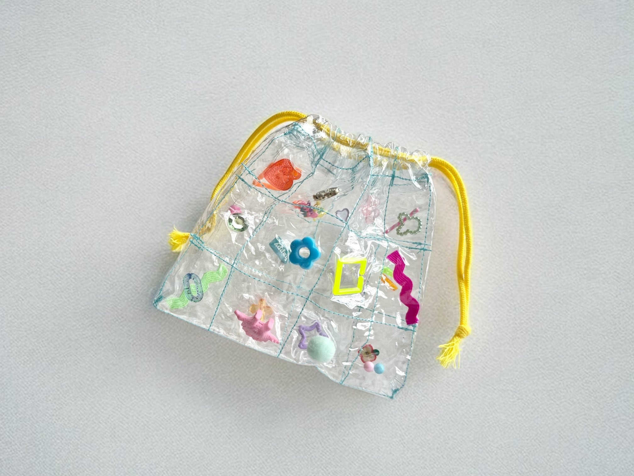 小さなおもちゃパーツやビーズ、消しゴムなどが沢山散りばめられた巾着ポーチ