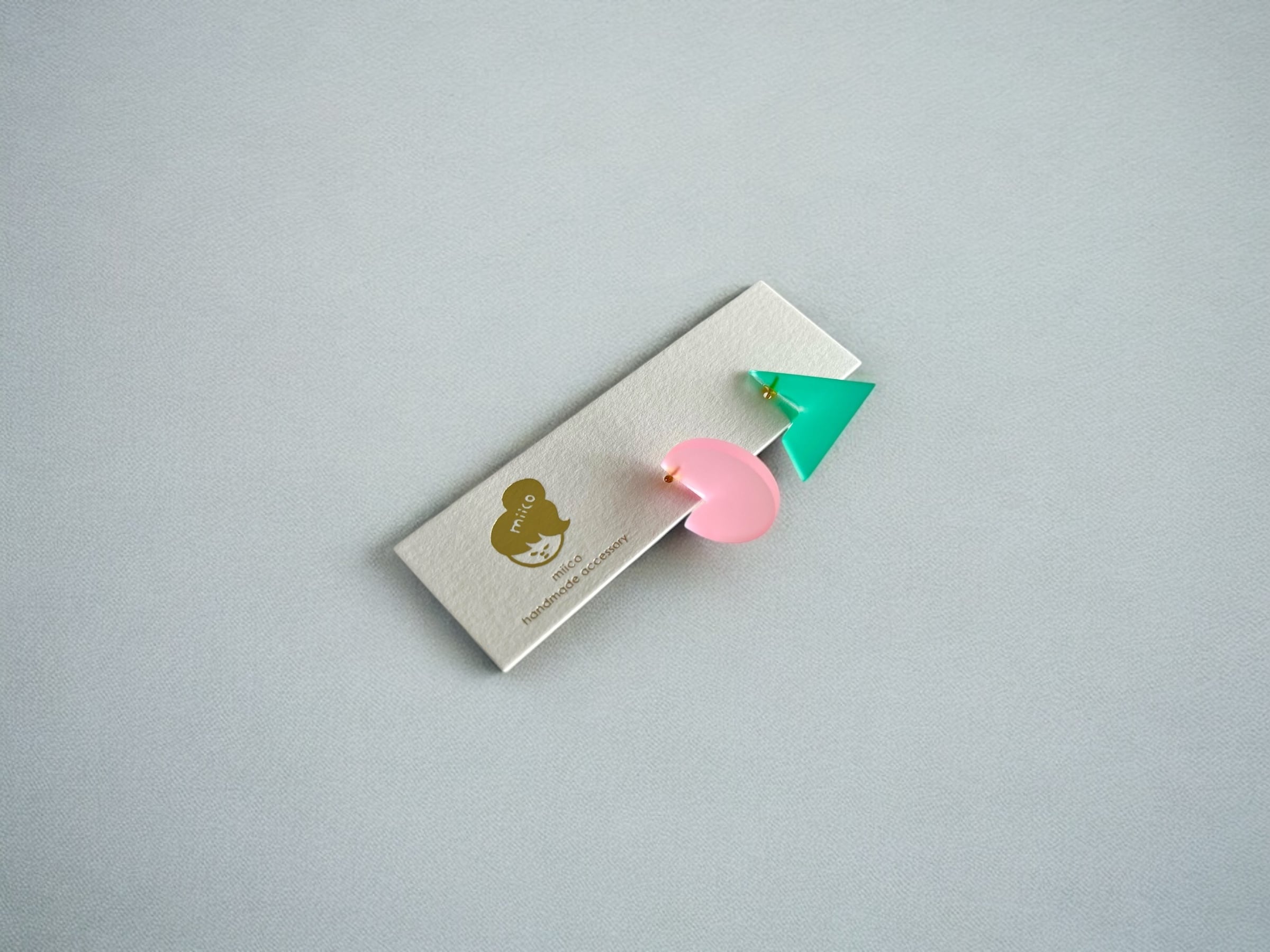 ピンクの◯、グリーンの△の組み合わせのかわいいピアス