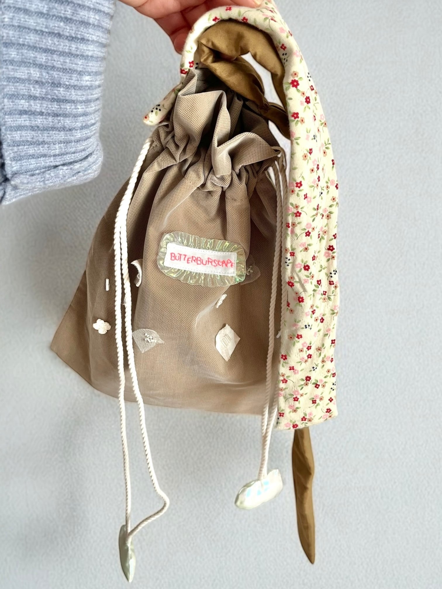 メインの茶色い布部分はチュールが重ねられています。とても繊細で細かいところに作家様の愛が感じられる一点です。