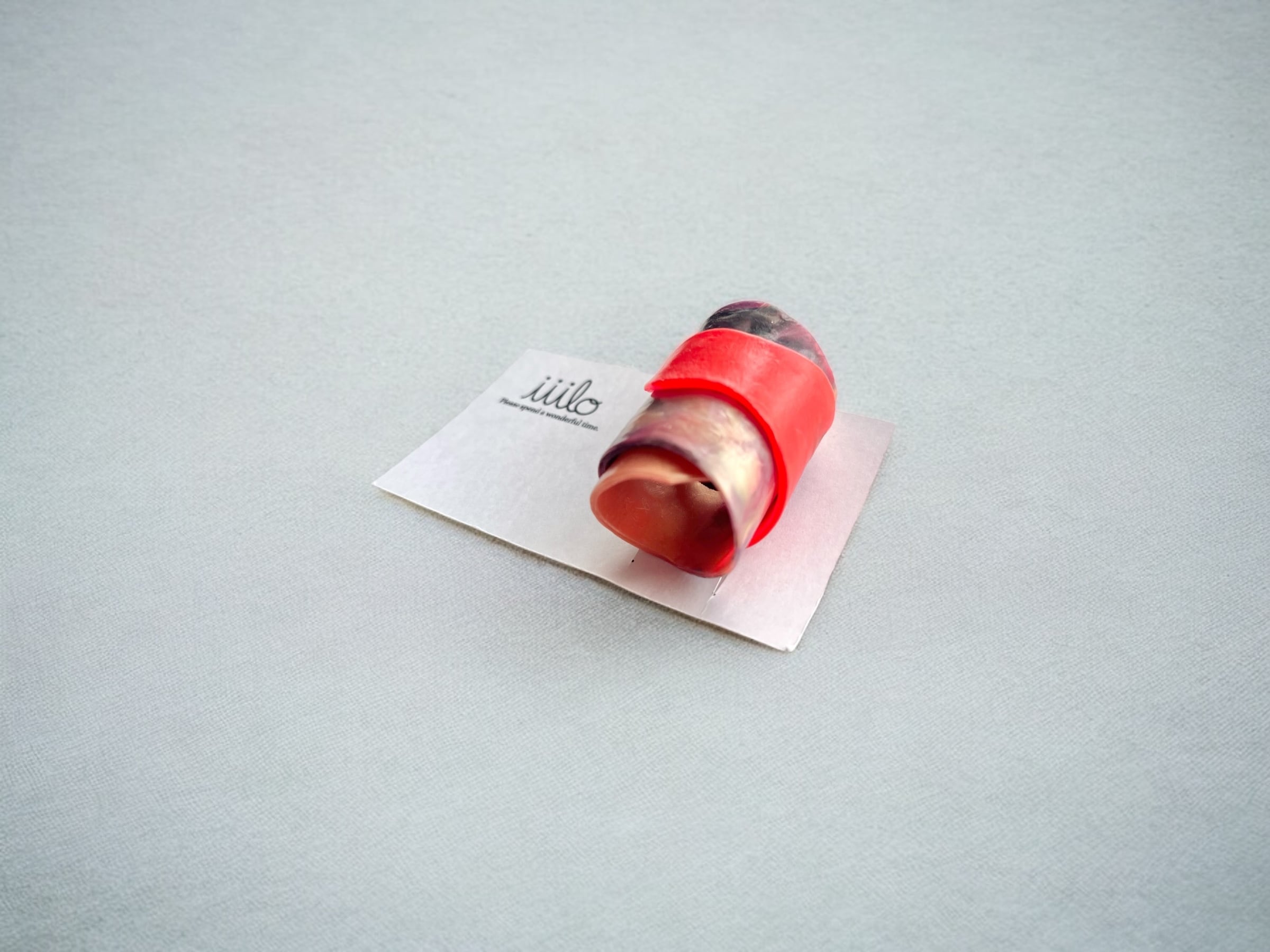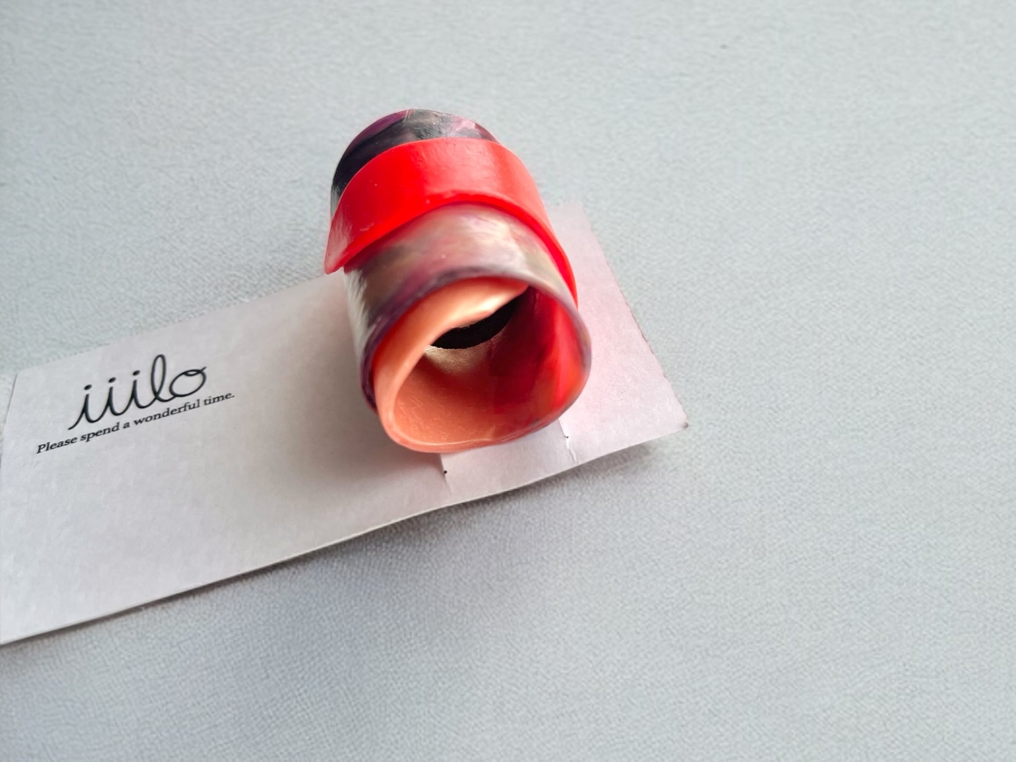 巻き付け部分は発色のいいレッド、パールトーンのサーモンカラーやベージュ、パープル、ブラックのグラデーション