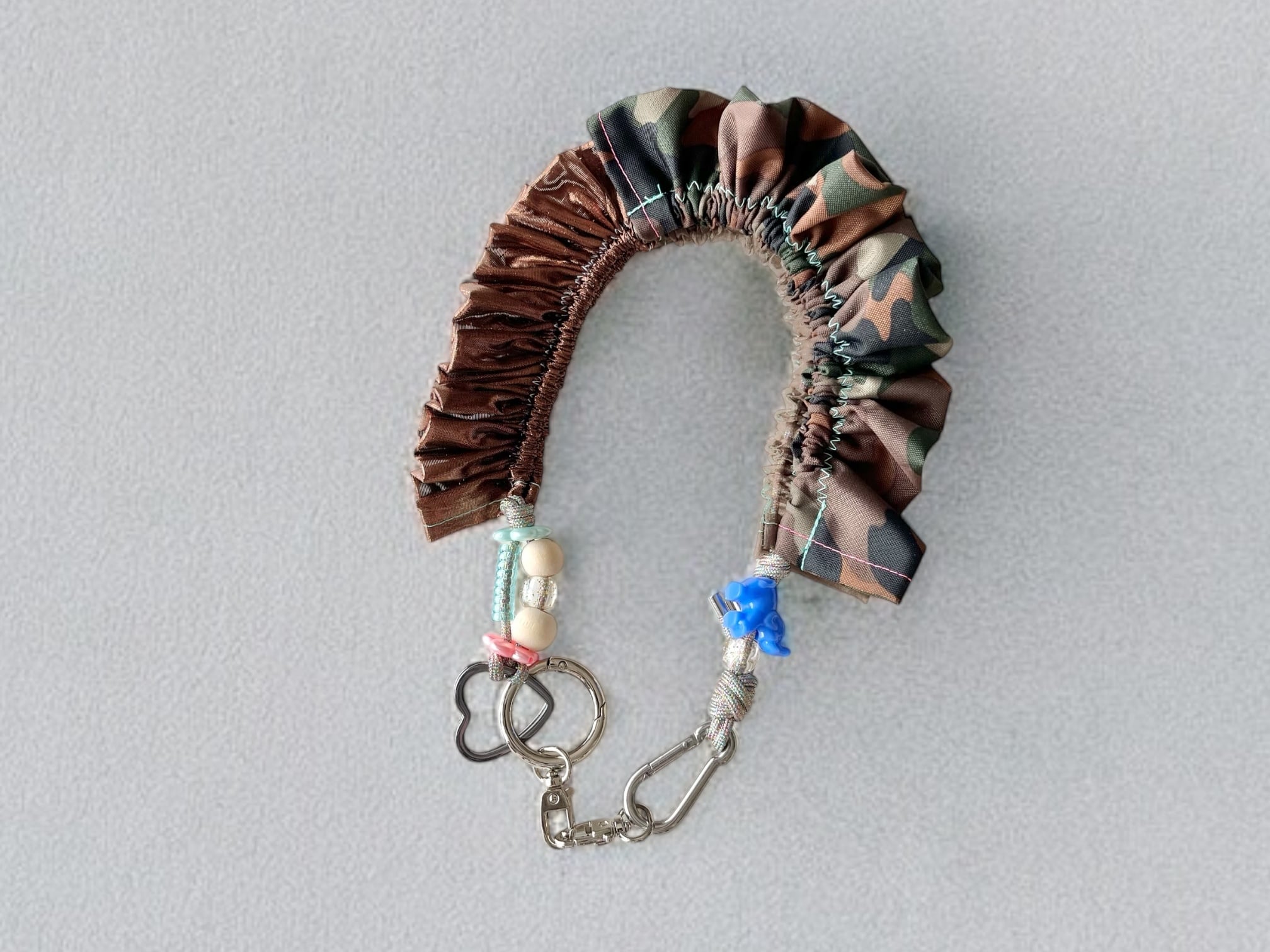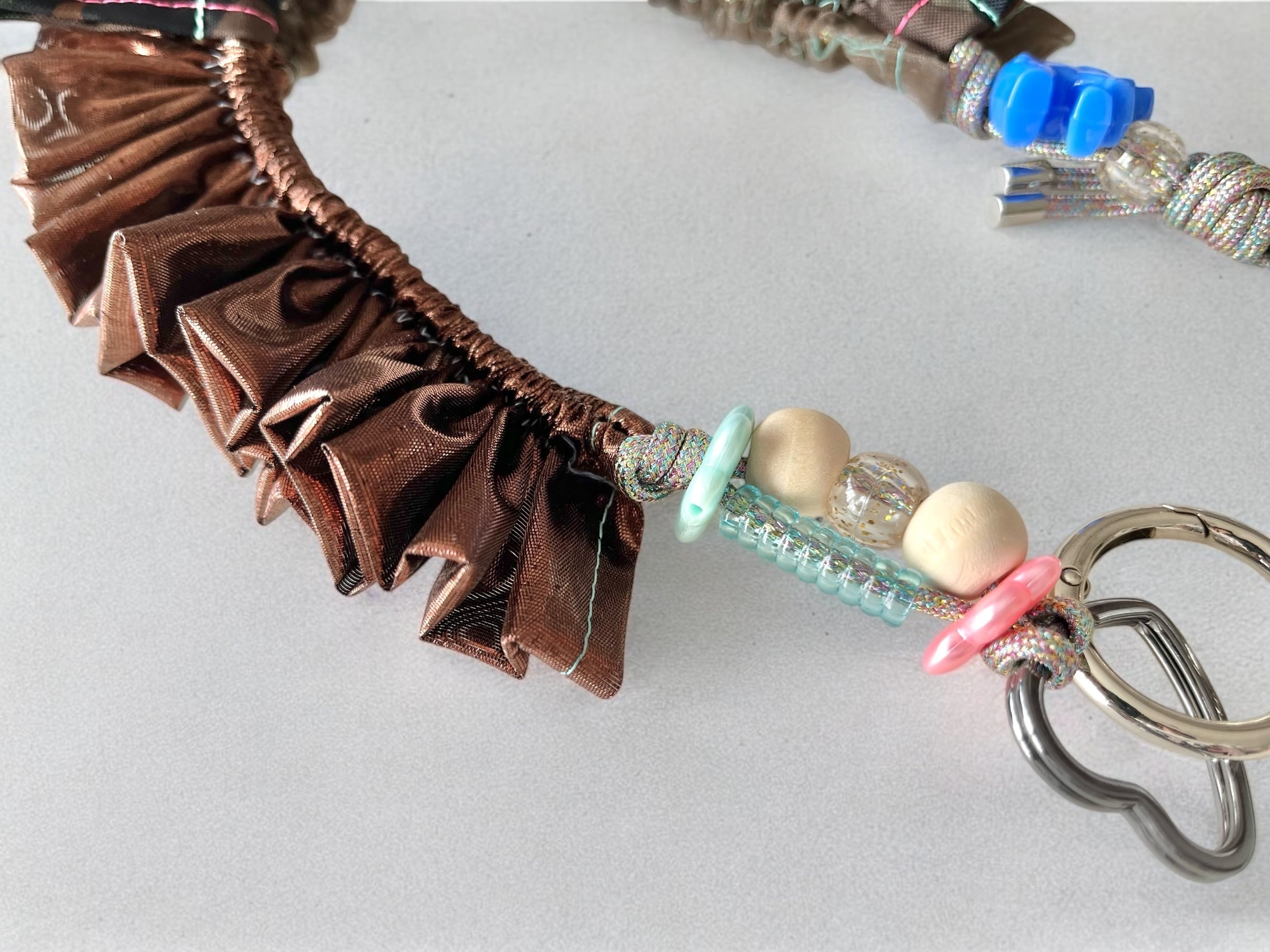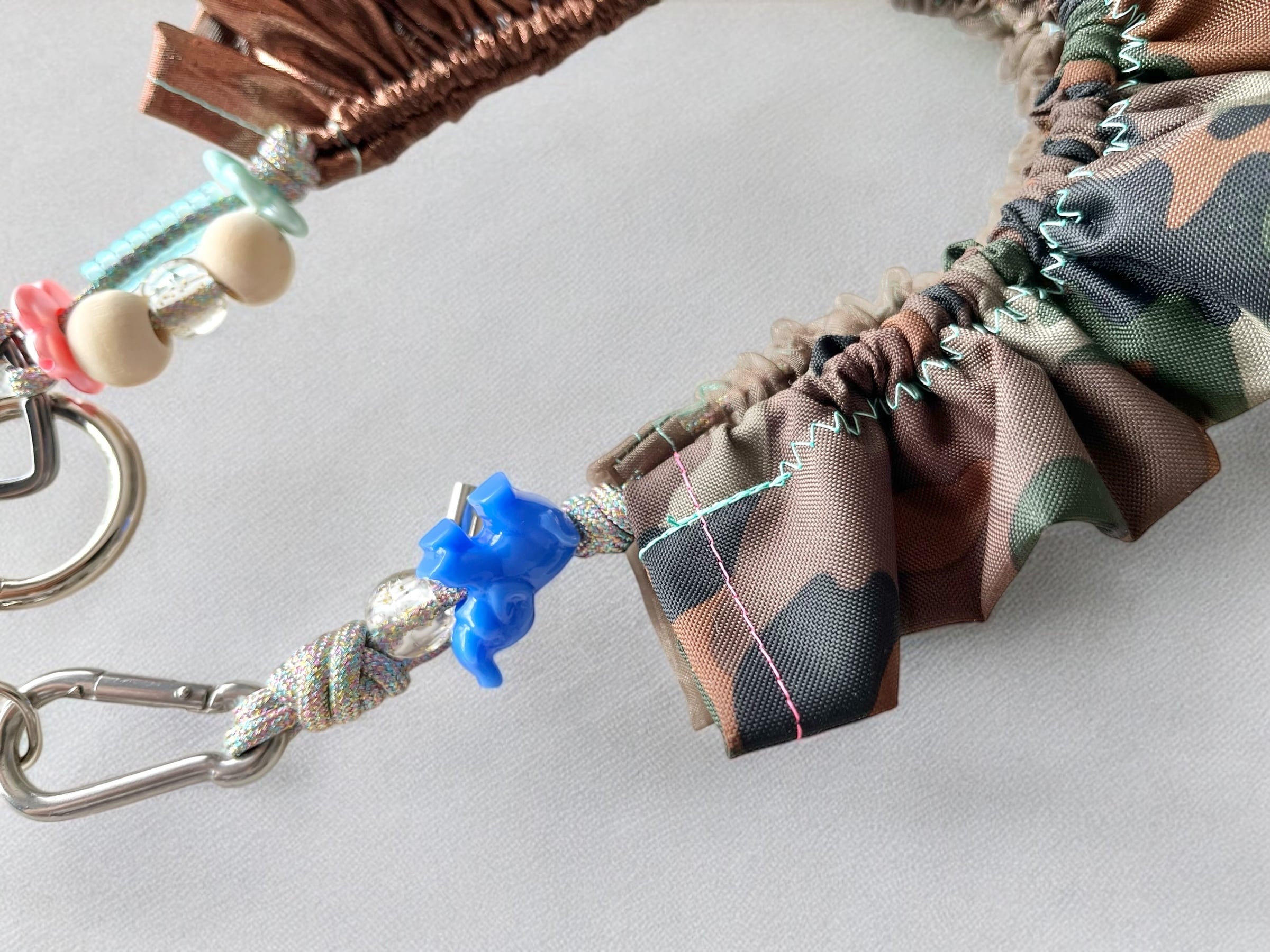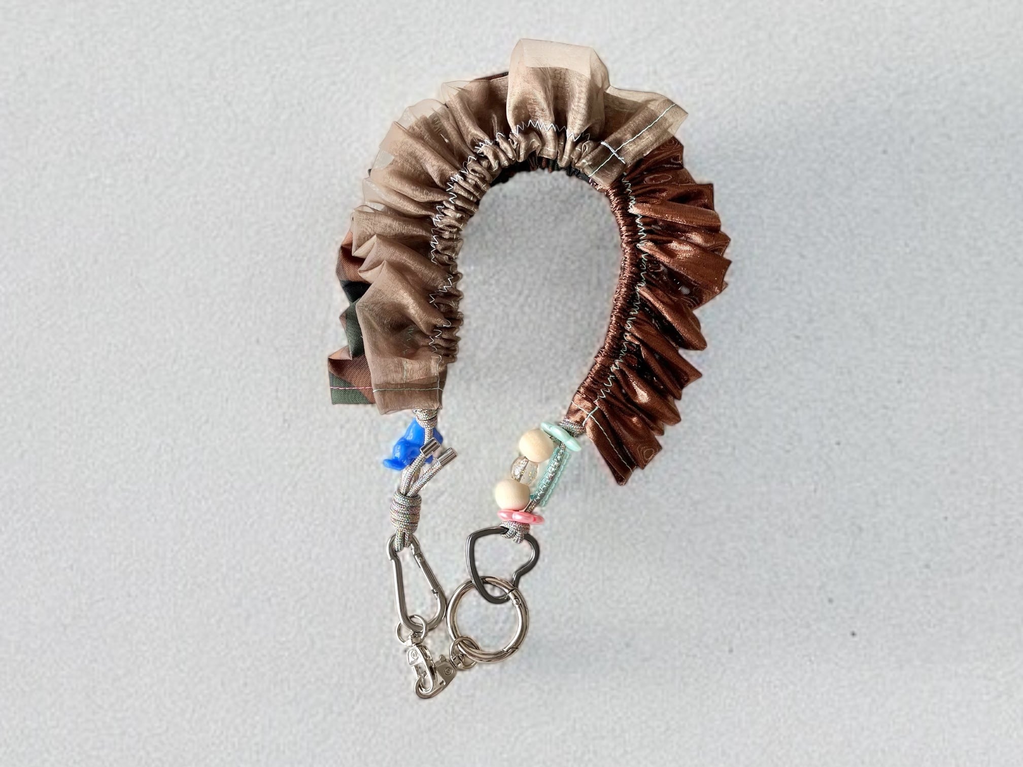 オーガンジーやサテン、くるくるしたチューブのような素材など、カラフルな異素材の組み合わせにプラスチックパーツなども入ったかわいいストラップです。