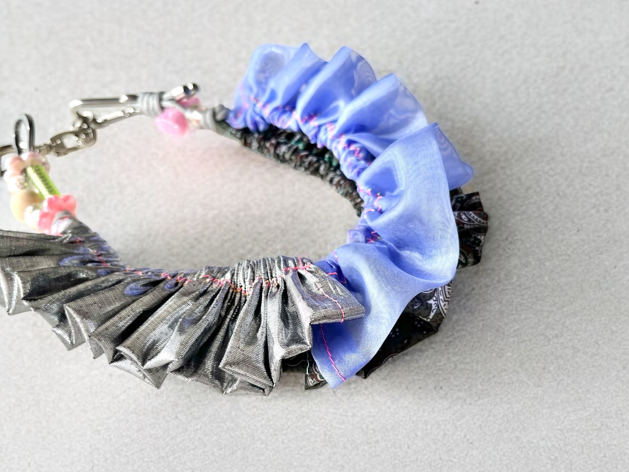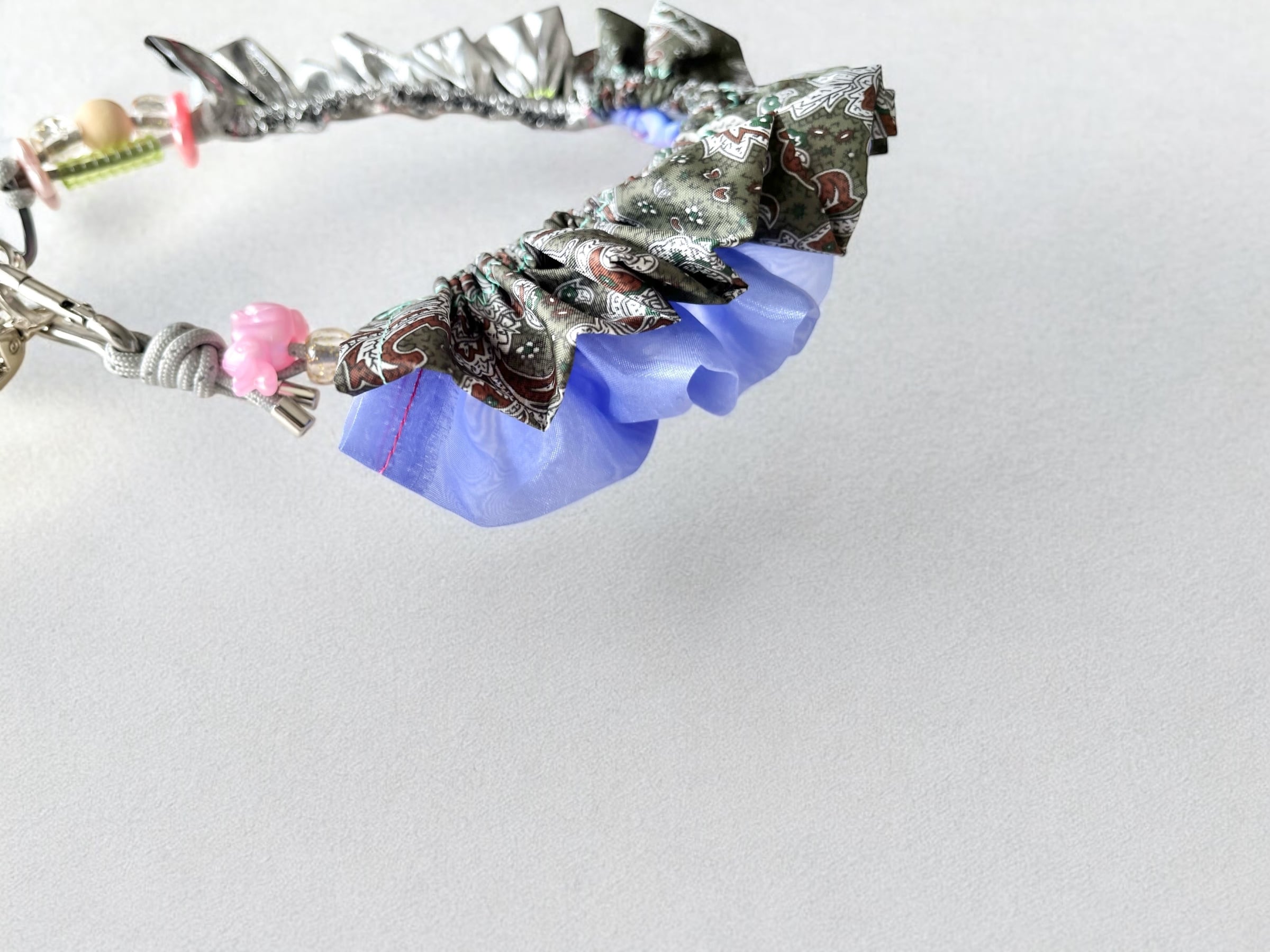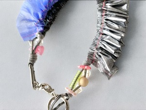 オーガンジーやサテン、くるくるしたチューブのような素材など、カラフルな異素材の組み合わせにプラスチックパーツなども入ったかわいいストラップです。
