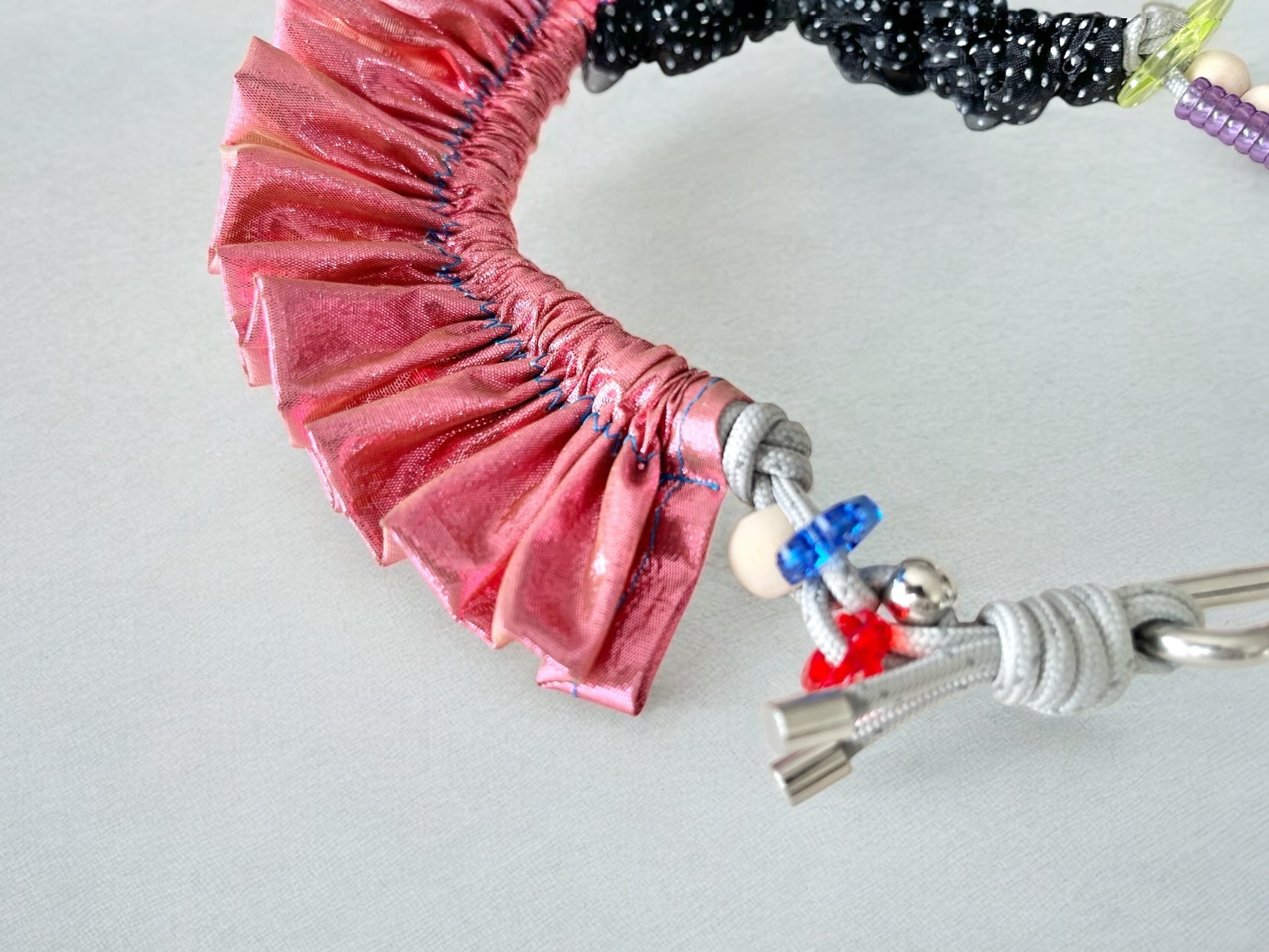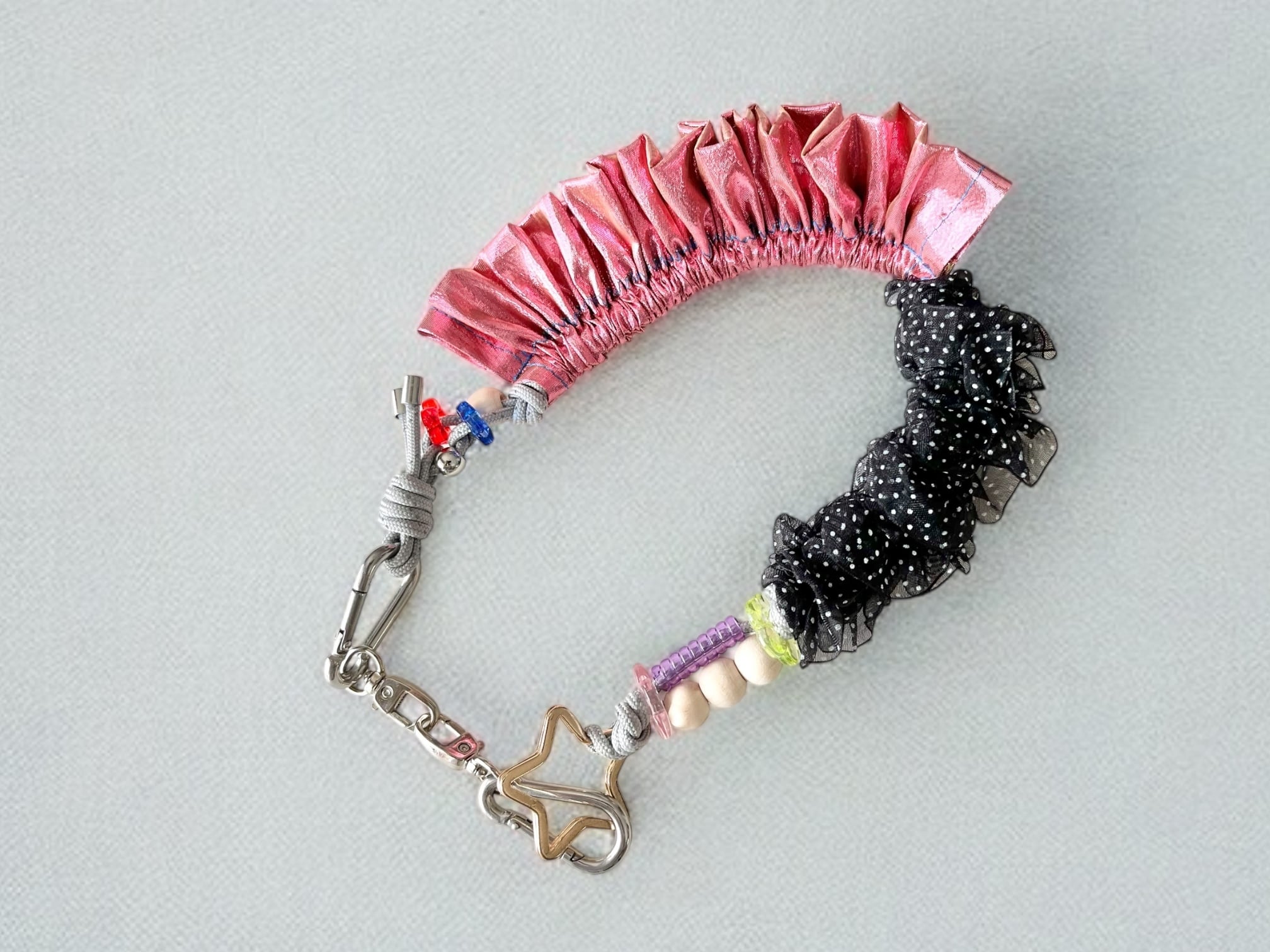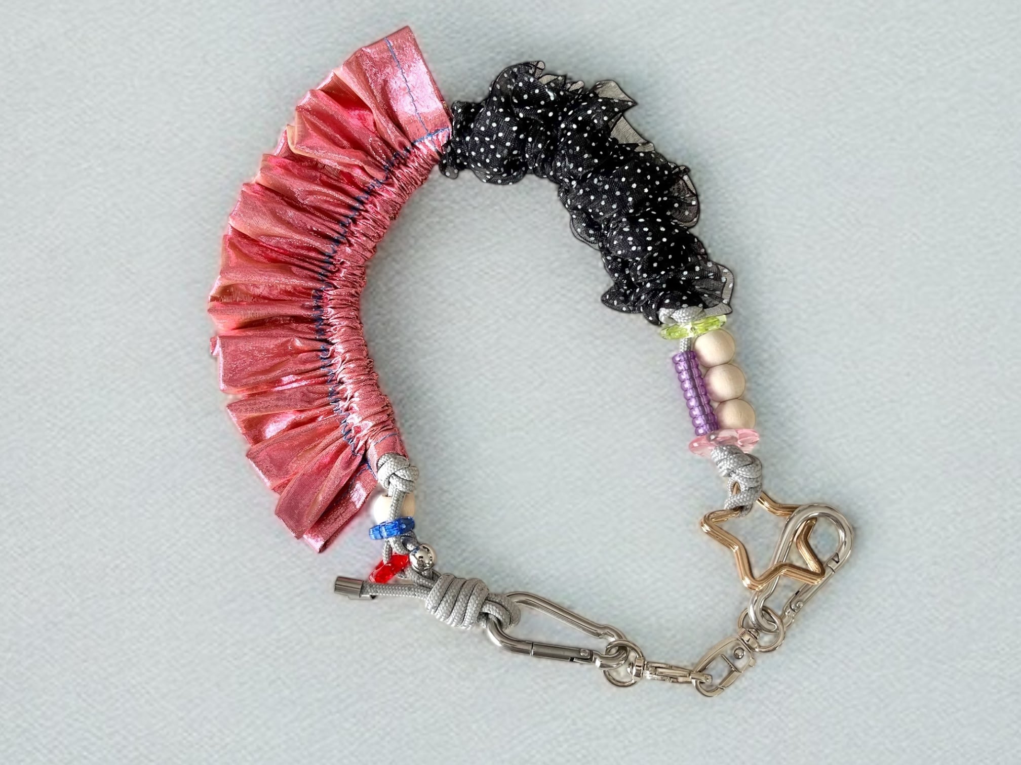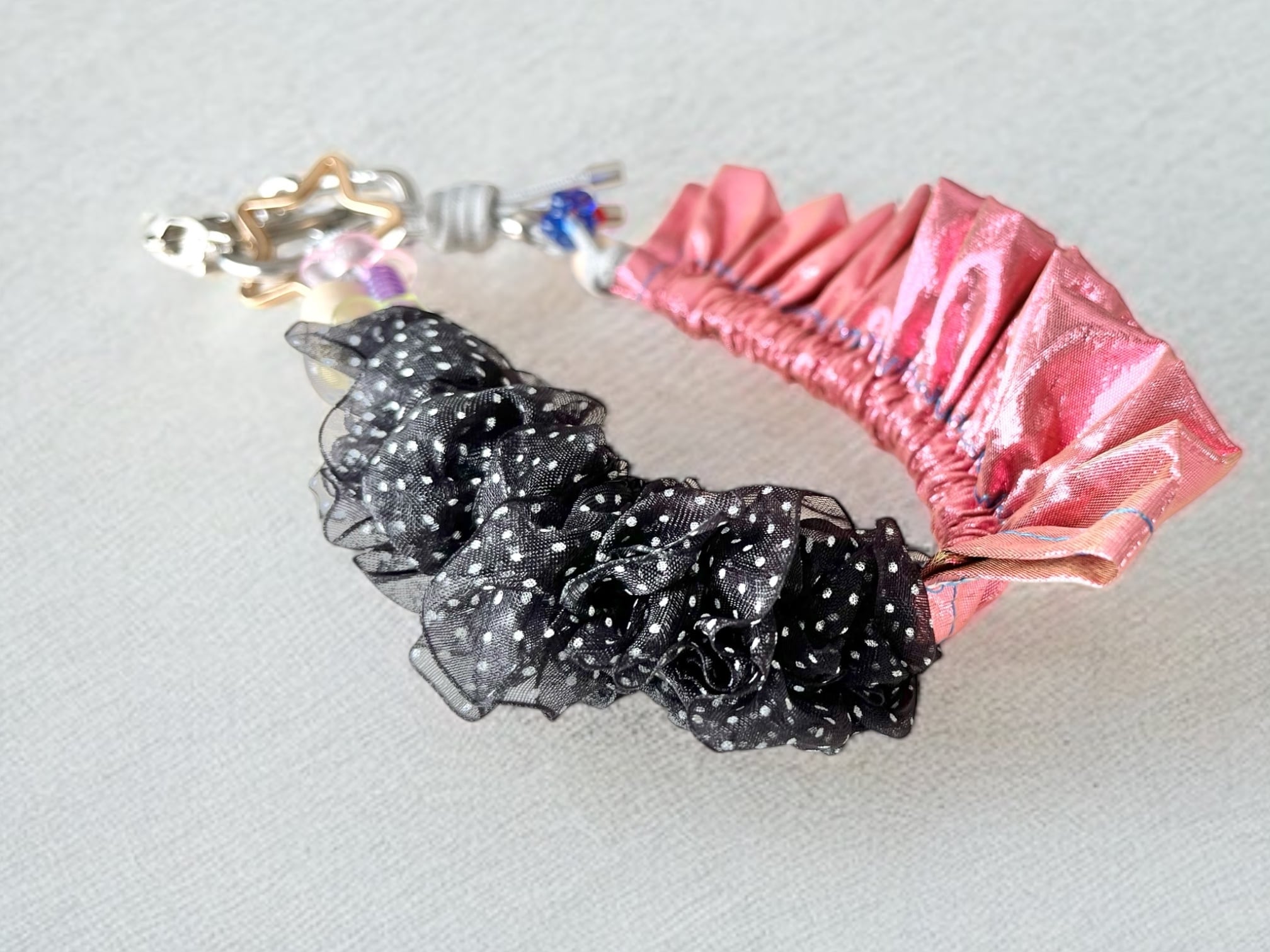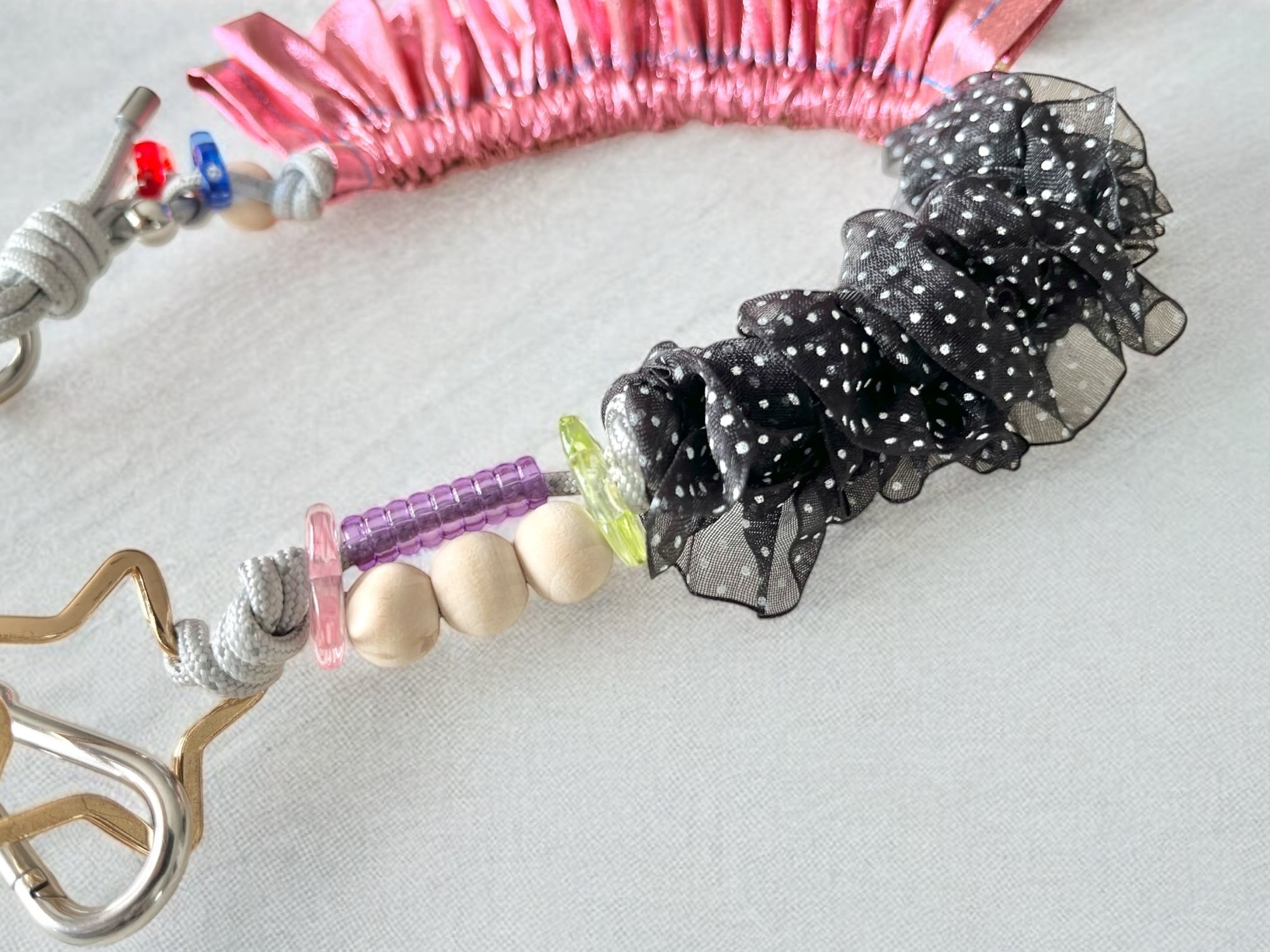 オーガンジーやサテン、くるくるしたチューブのような素材など、カラフルな異素材の組み合わせにプラスチックパーツなども入ったかわいいストラップです。