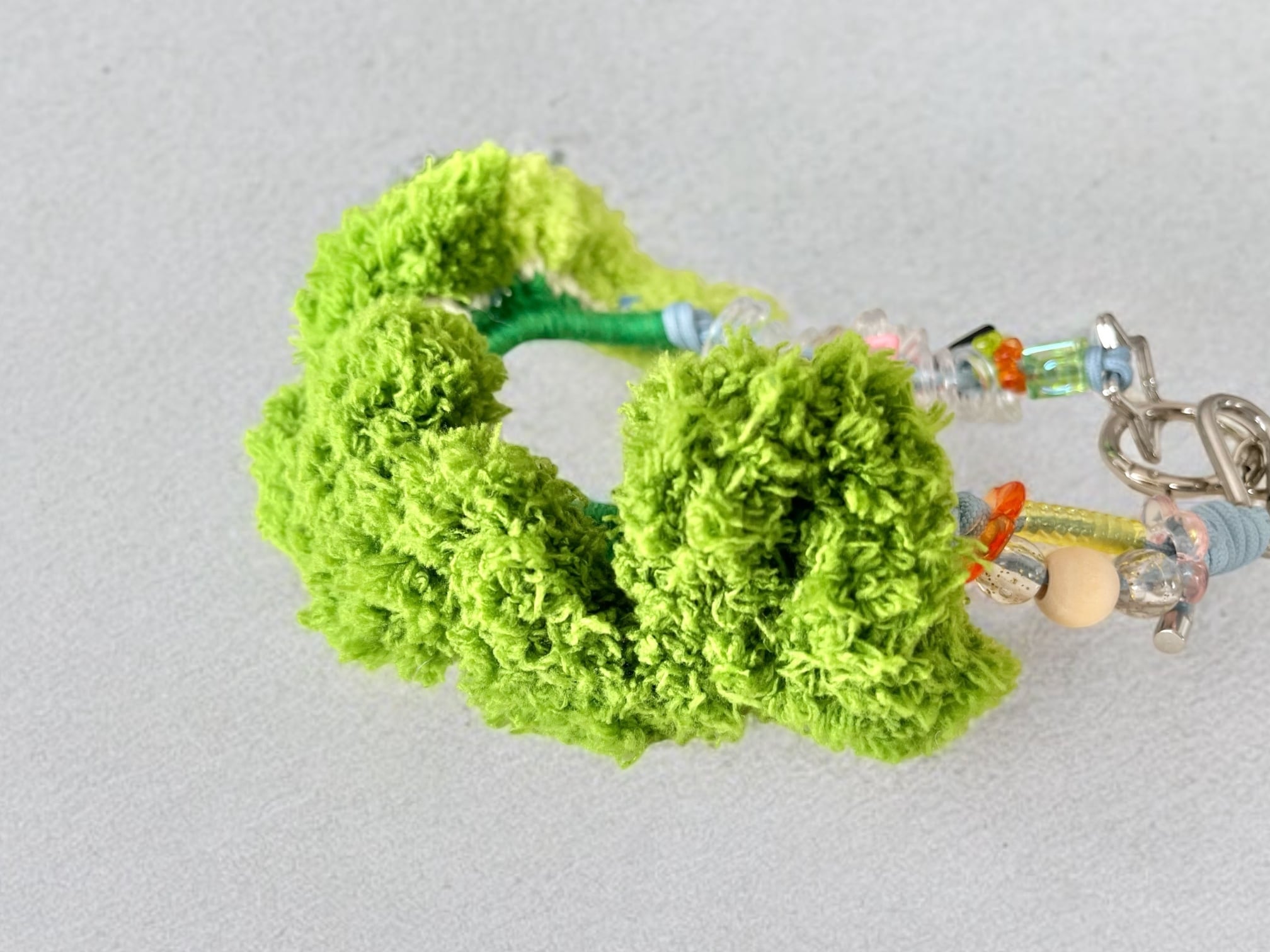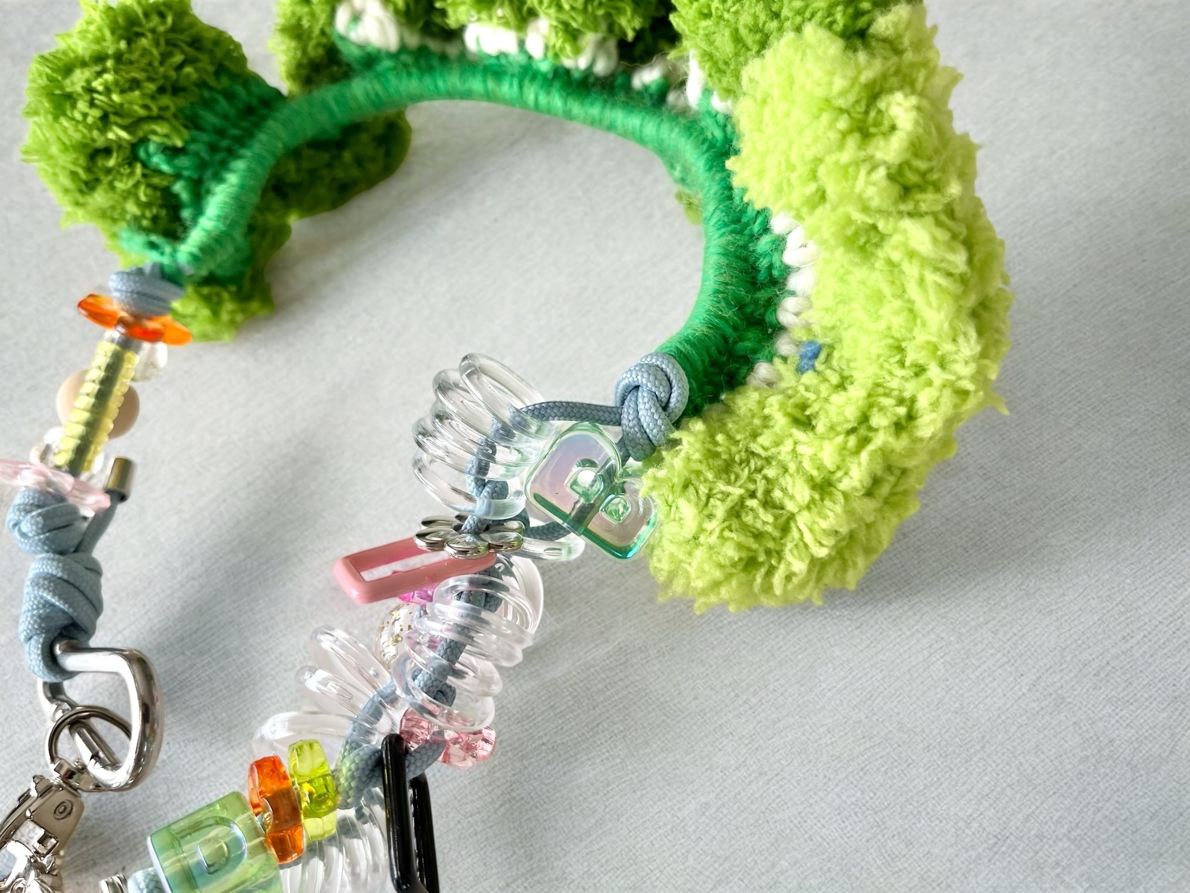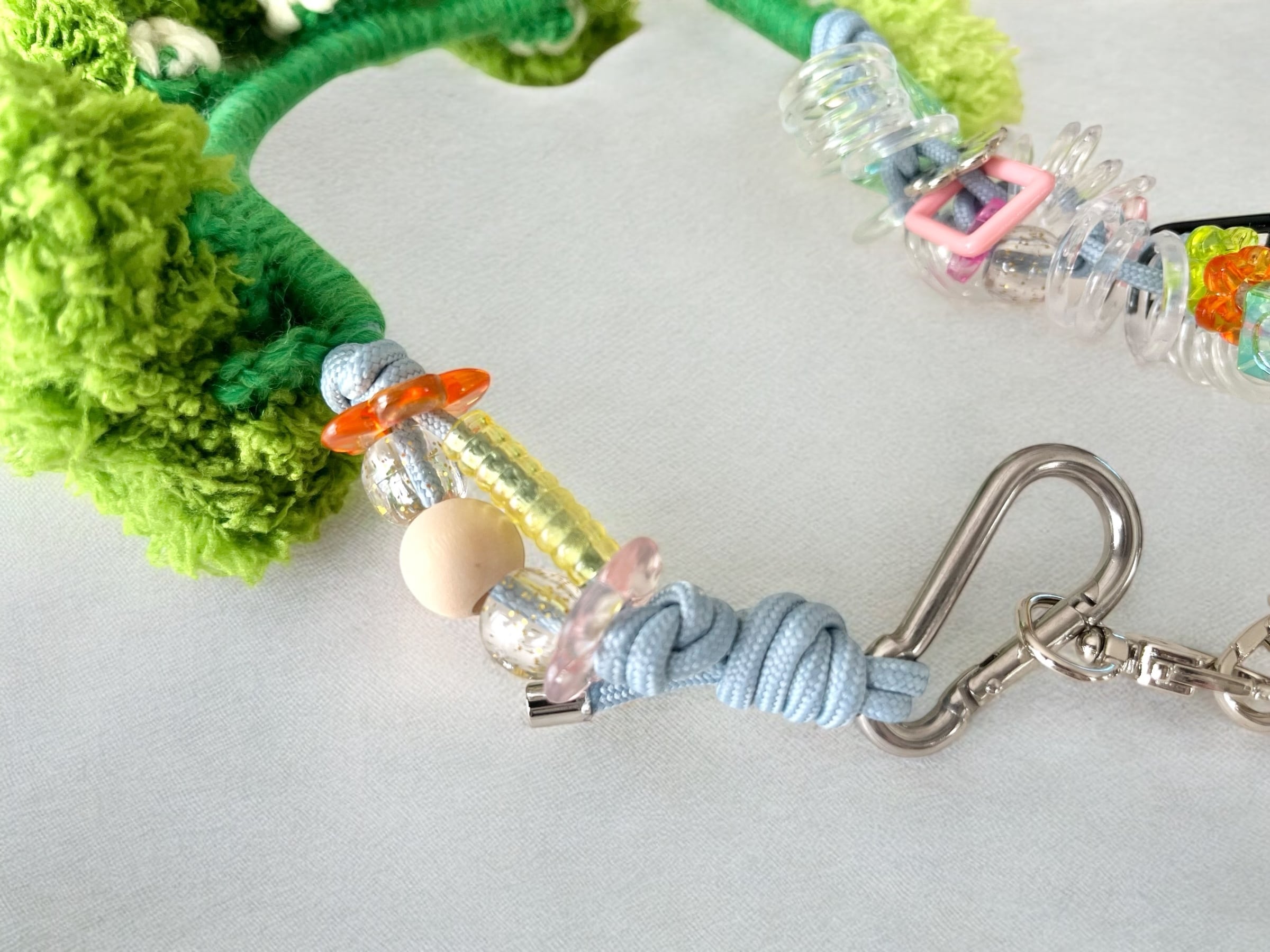 オーガンジーやサテン、くるくるしたチューブのような素材など、カラフルな異素材の組み合わせにプラスチックパーツなども入ったかわいいストラップです。
