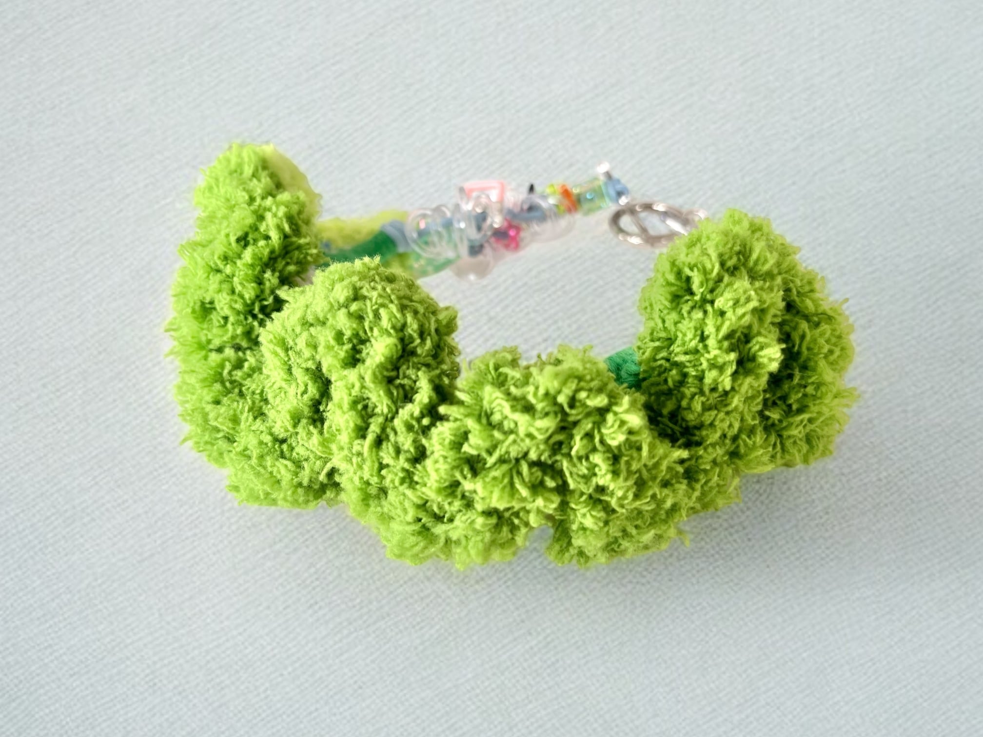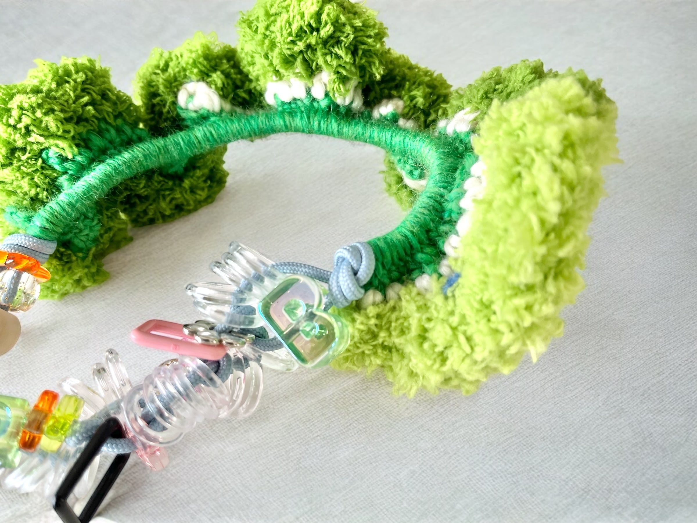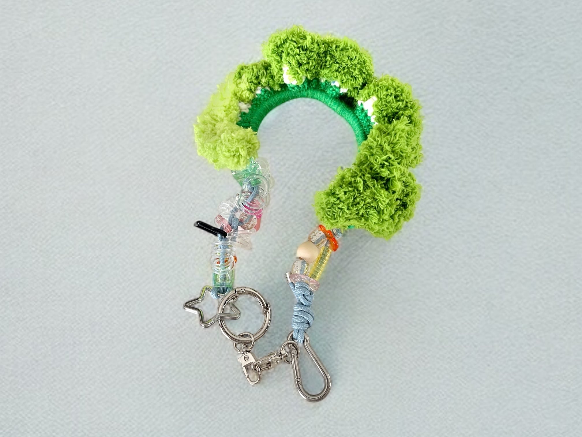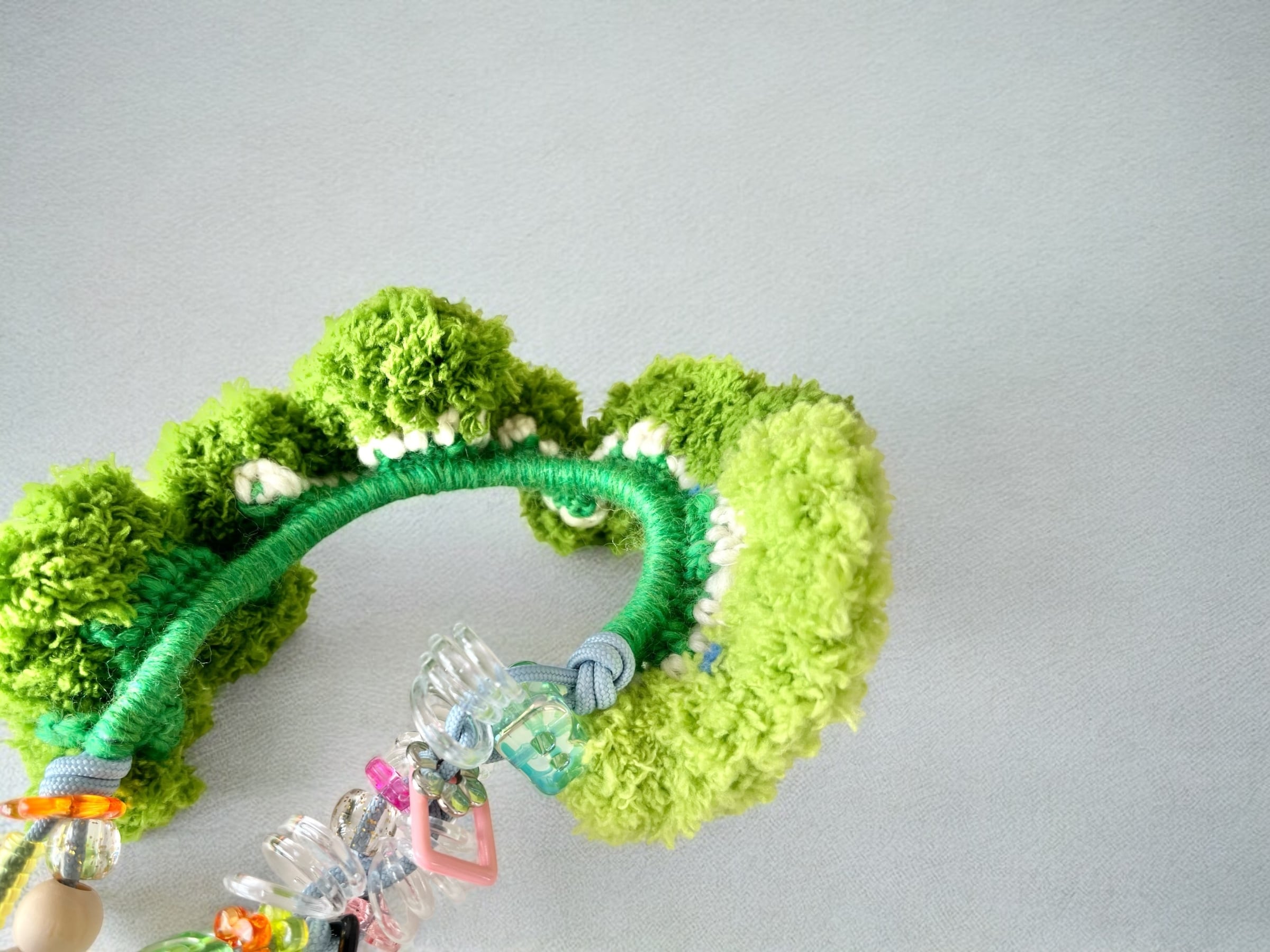 オーガンジーやサテン、くるくるしたチューブのような素材など、カラフルな異素材の組み合わせにプラスチックパーツなども入ったかわいいストラップです。