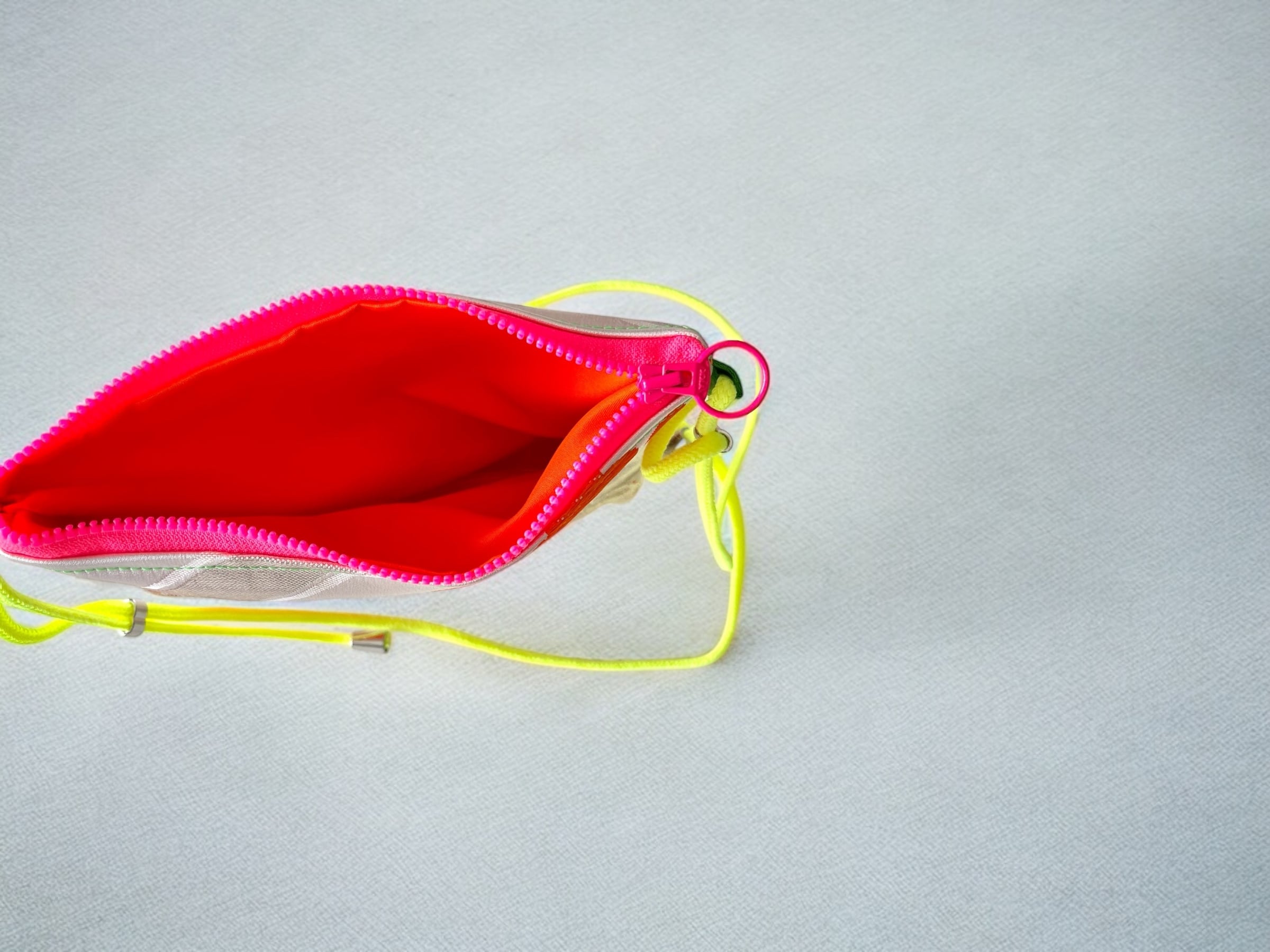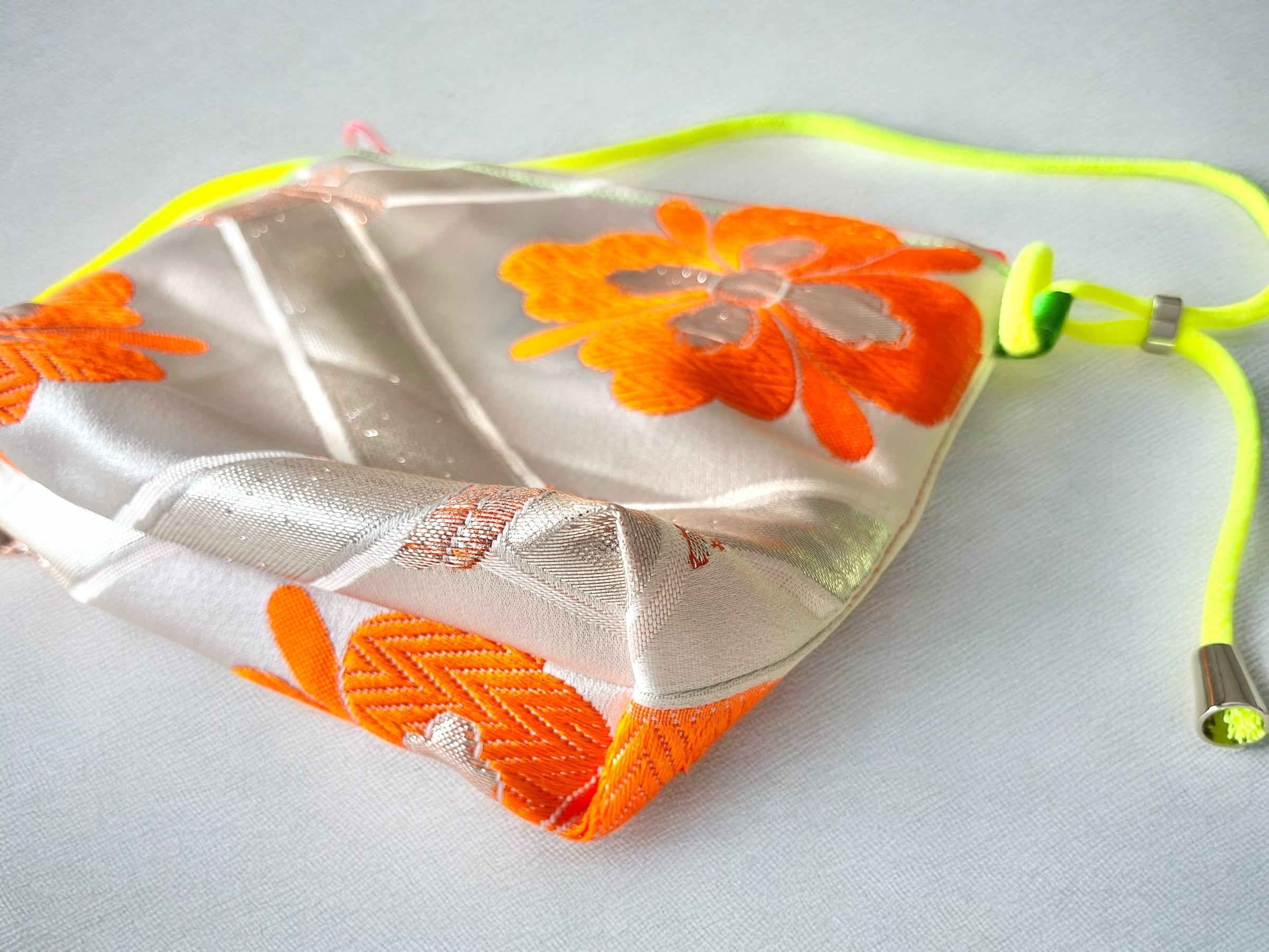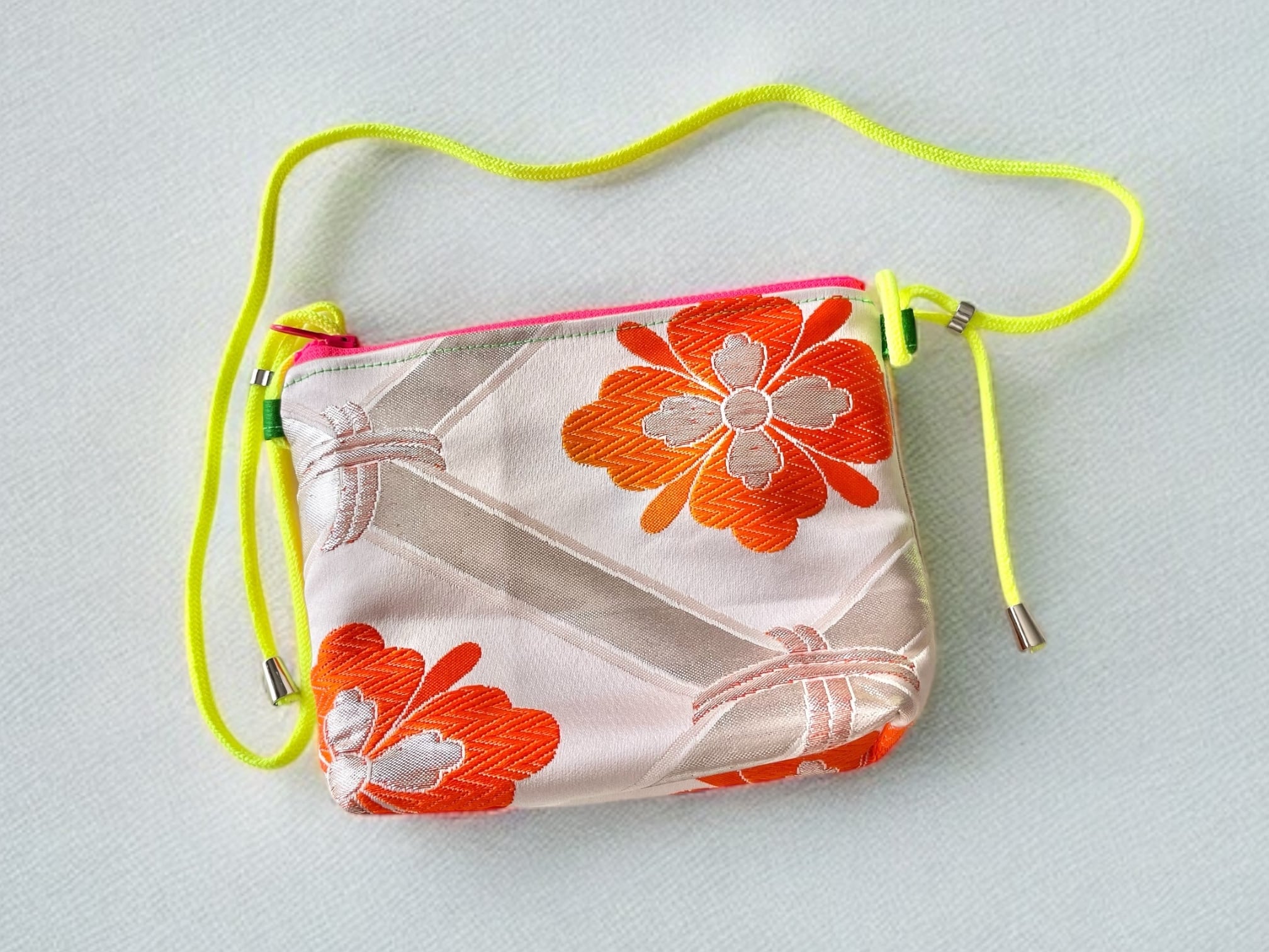 少しピンクががったきれいな色の和柄生地にネオンイエローのショルダー紐、ネオンピンクのジッパーが効いてる!
