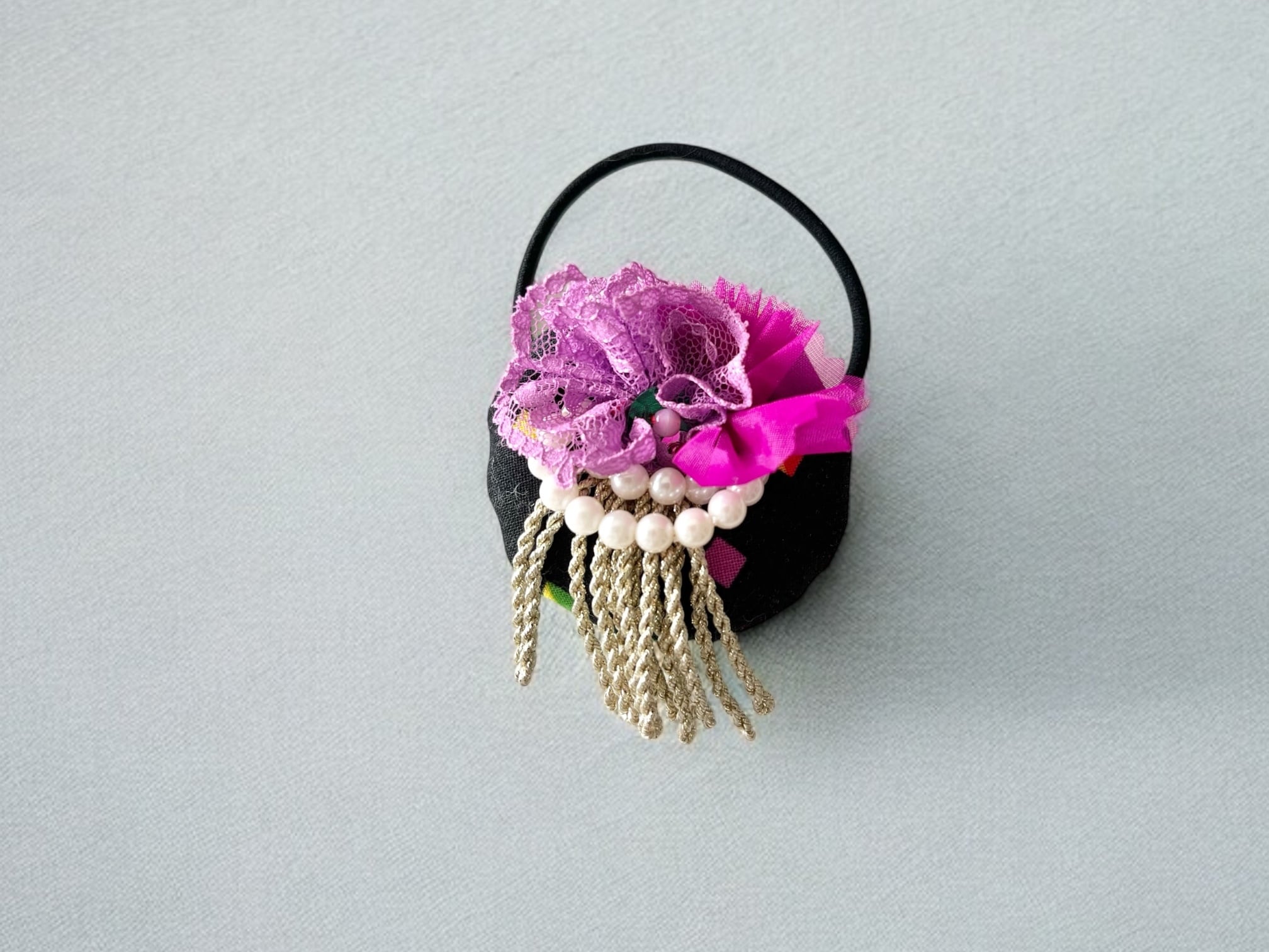 パープルのグラデーションやパール、ゴールドタッセルがボリューミーでおしゃれな一点です。