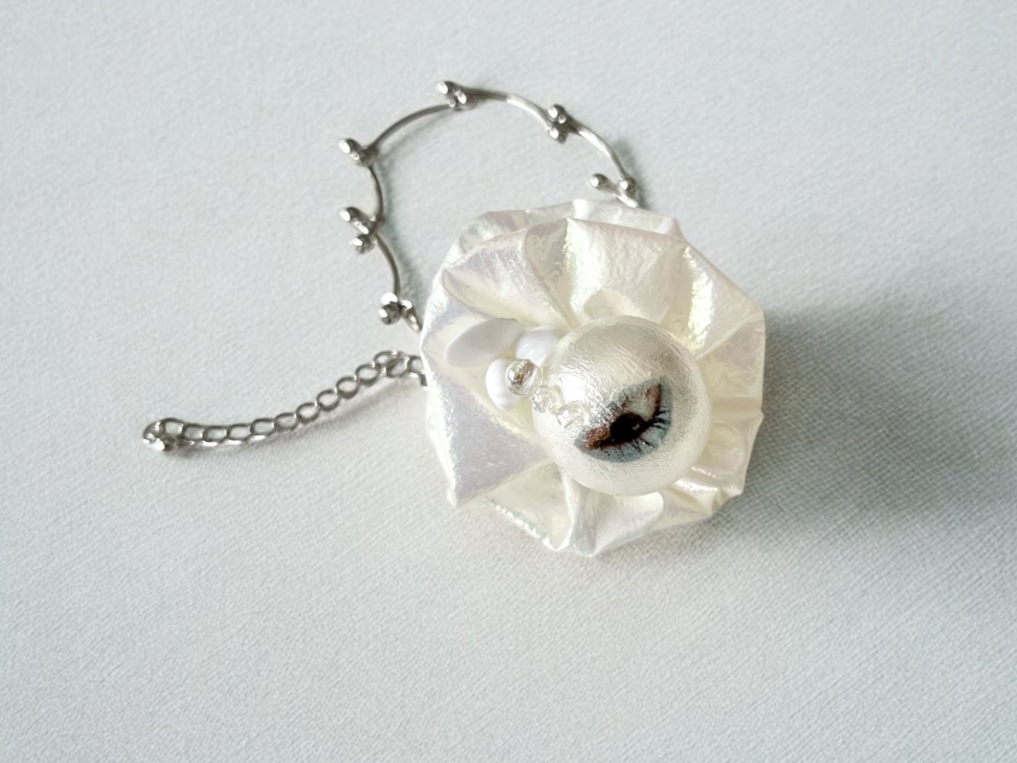 とても華やかなサテンフリルにハンドペイントの目が描かれたパール 涙はミニパールがこぼれ落ち...