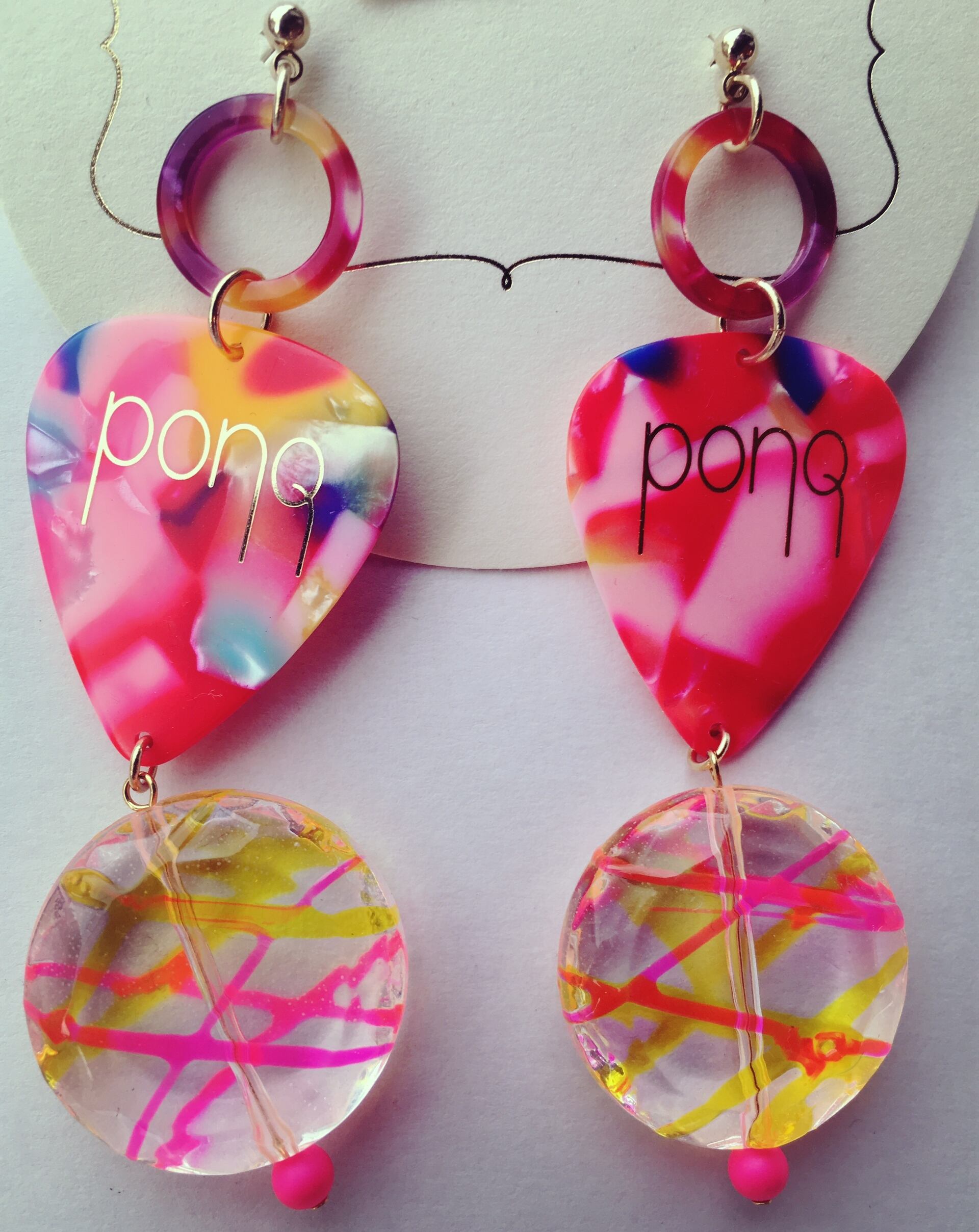 カラフルなピックにキャンディのようなかわいいパーツのユニークなピアスです。