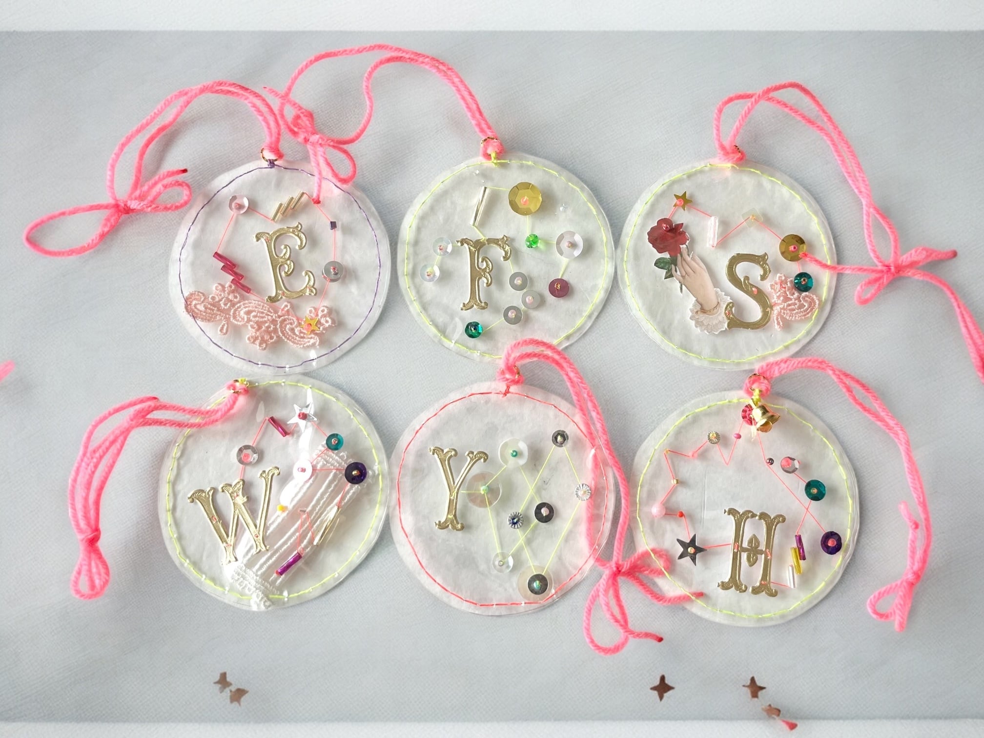 透明な丸の中にFのアルファベット、星座のような配置のピンクの糸ときらきらのスパンコール