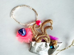 深いブルーのビジューやゴールドのレース、ネオンオレンジのチュールなど、