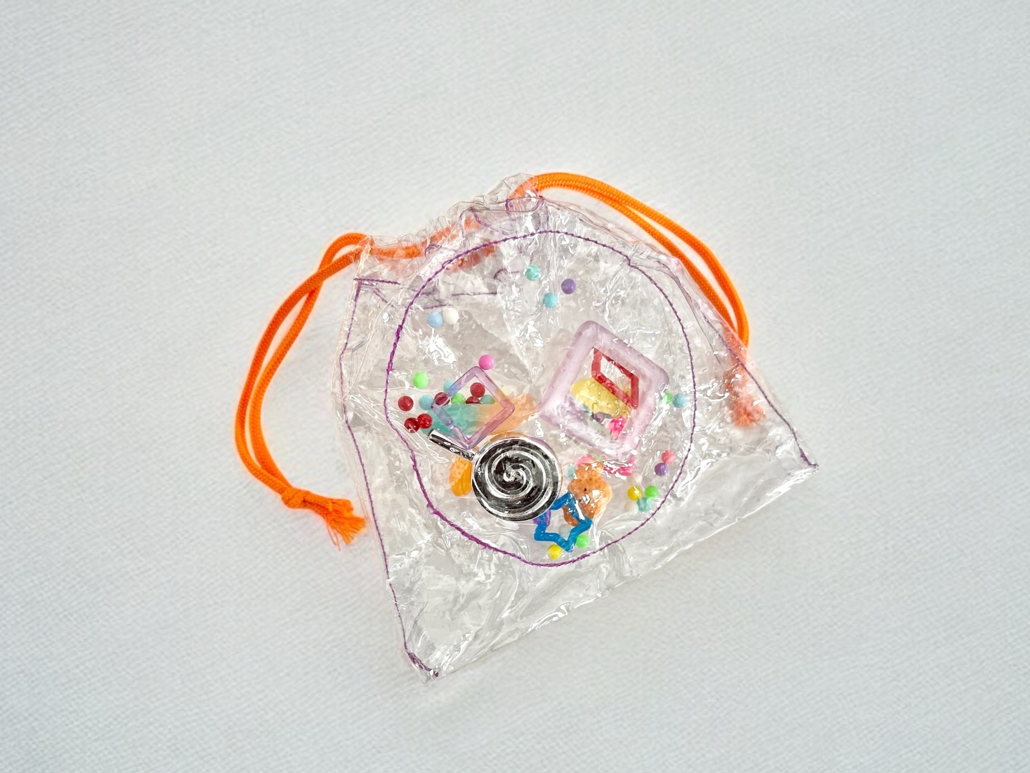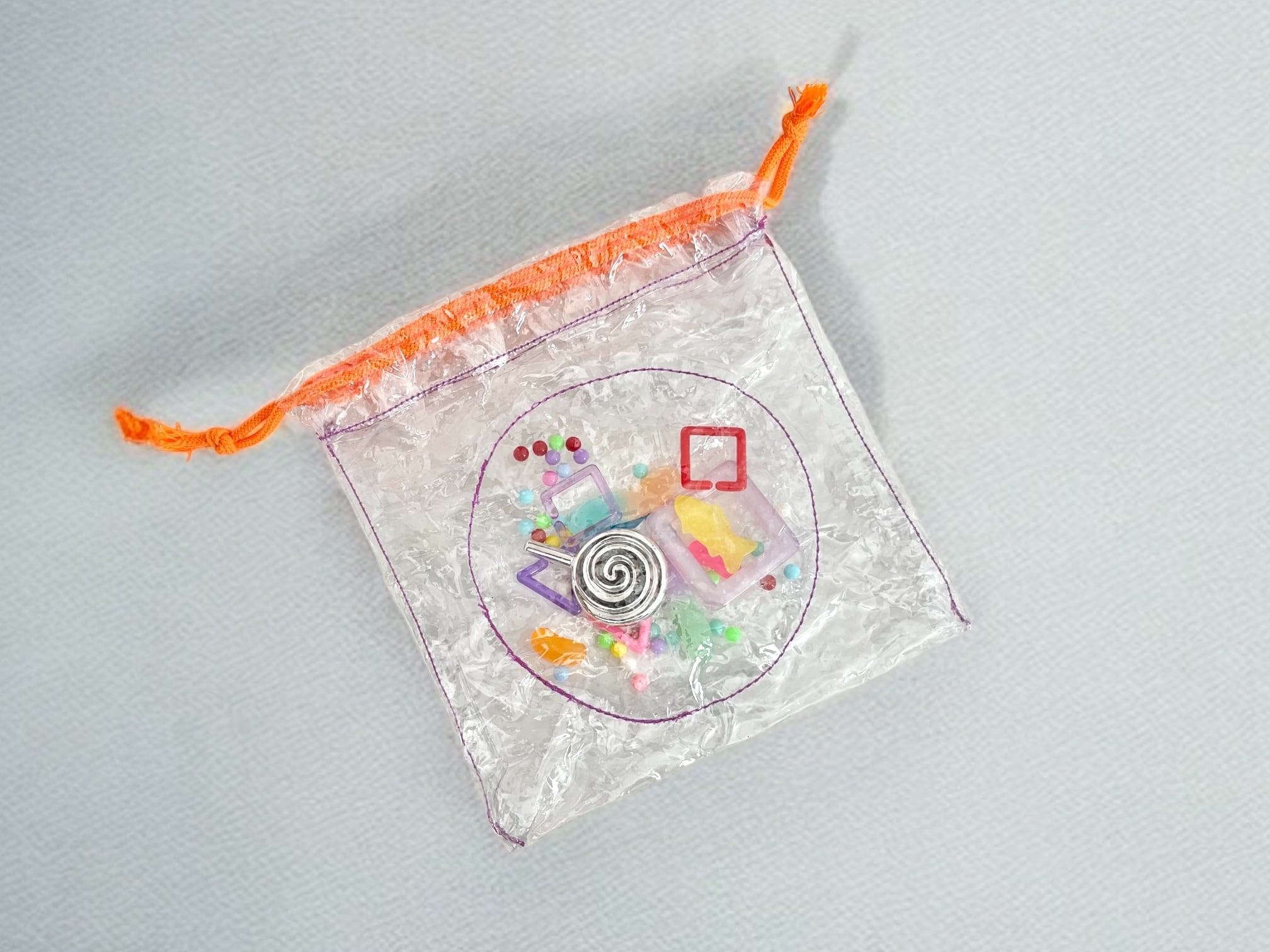 丸の中にはみみずグミパーツ、キラキラキャンディパーツ、ジェリービーンズなど。