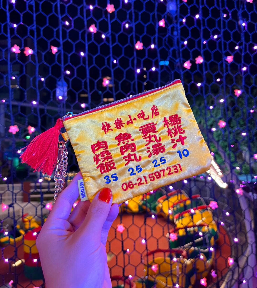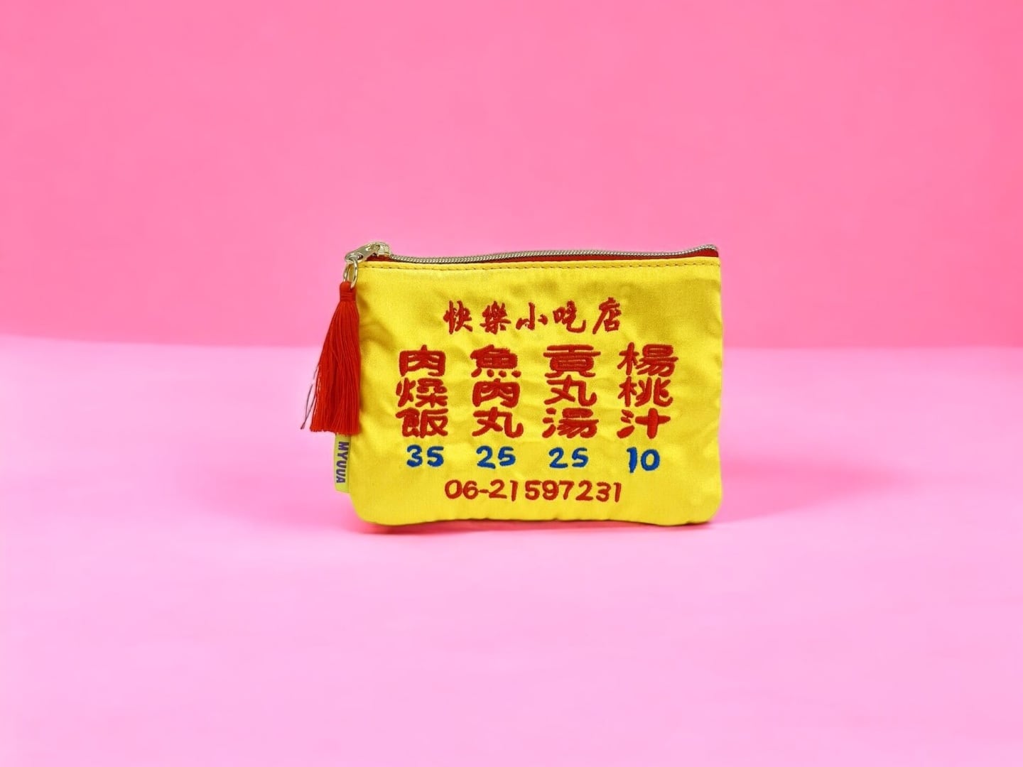鮮やかな黄色に赤い文字のメニューがずらりと並んだ台湾のローカルフード店の看板を刺繍で再現。赤のタッセルがポイントです。