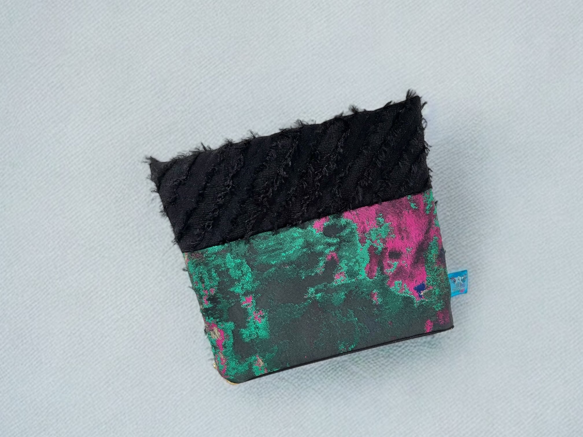 品のあるブラックのジャガード生地にパールや光沢のあるパーツが施されたポーチ