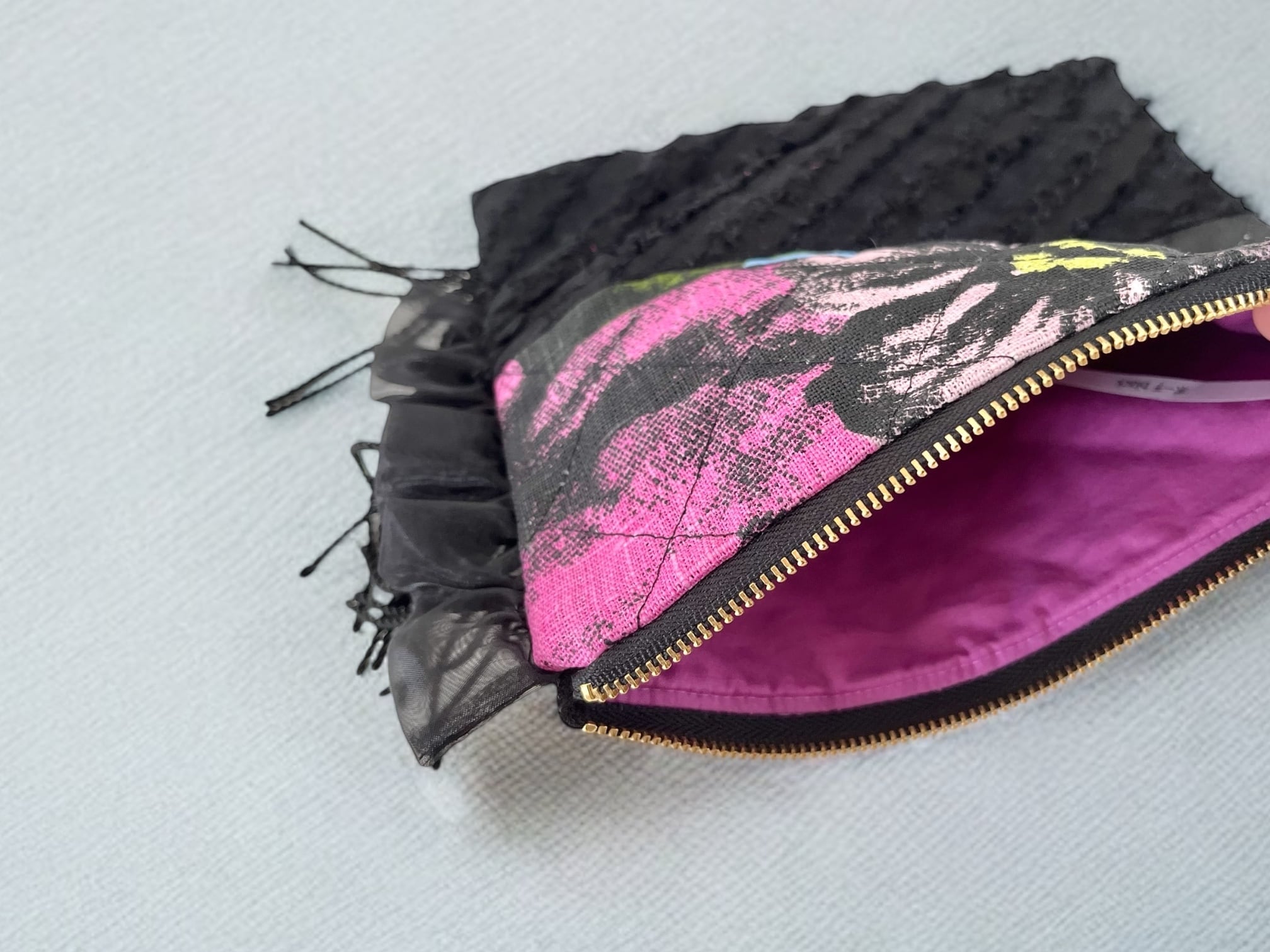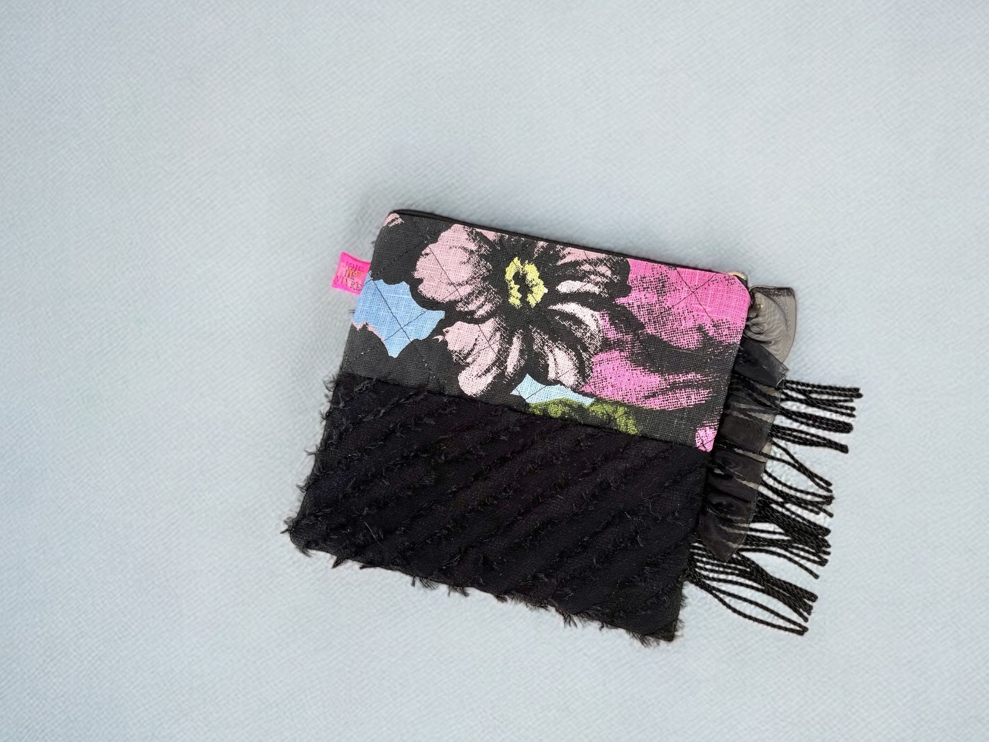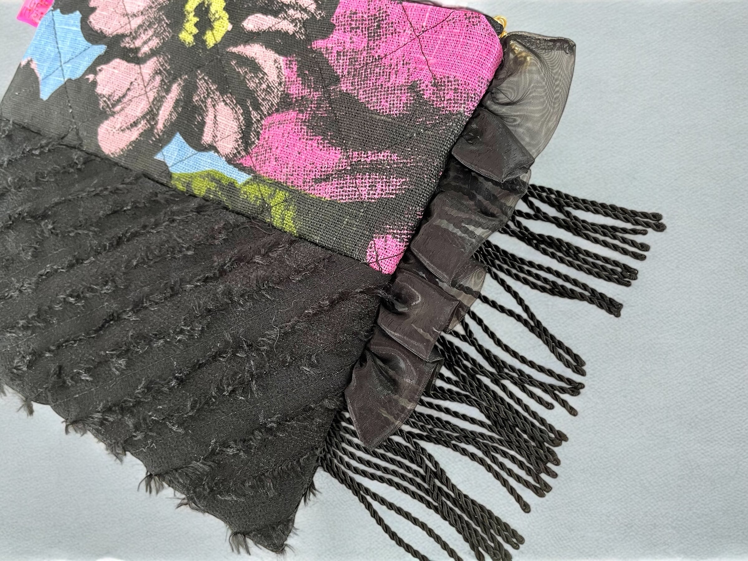 大きな花柄のキルティング地が目を惹くブラックポーチ