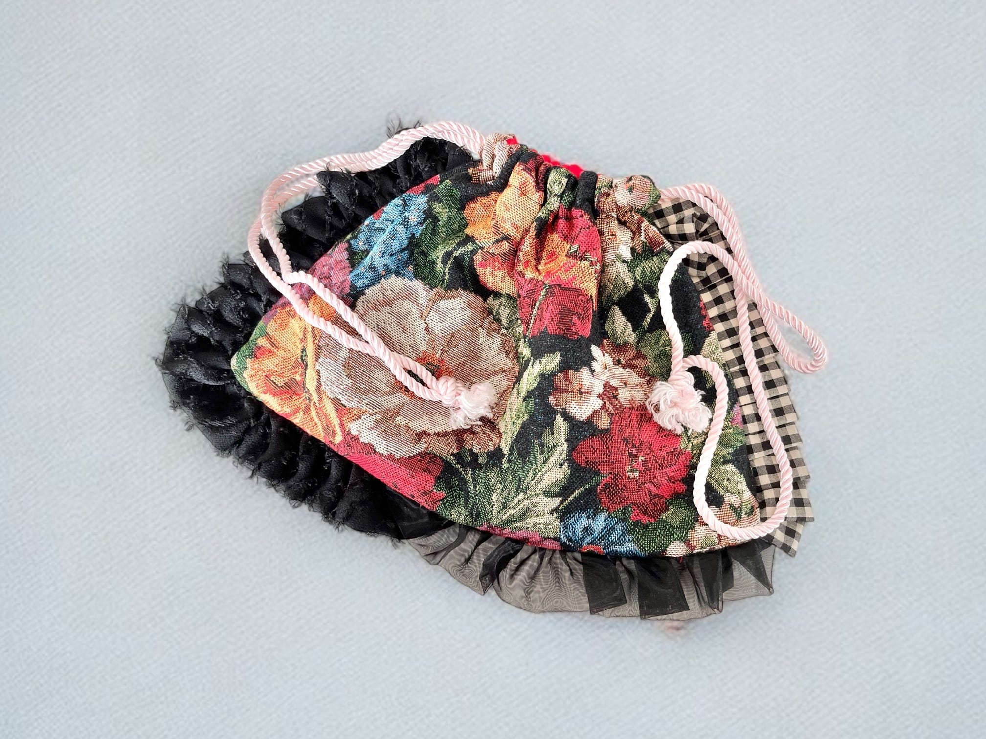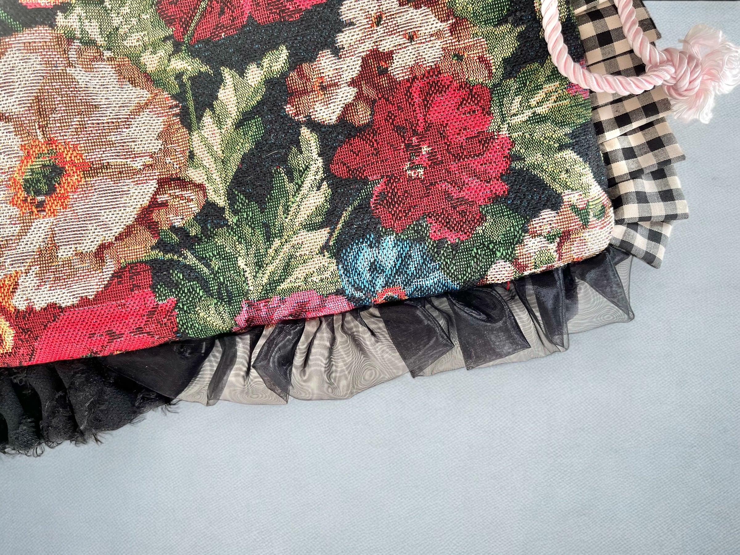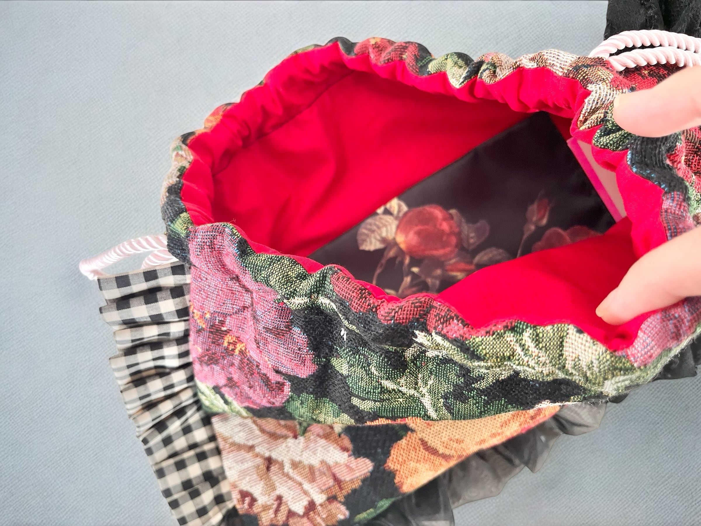 ブラックのチュールフリルやギンガムチェックフリル、品のあるピンクのタッセル紐がかわいい。