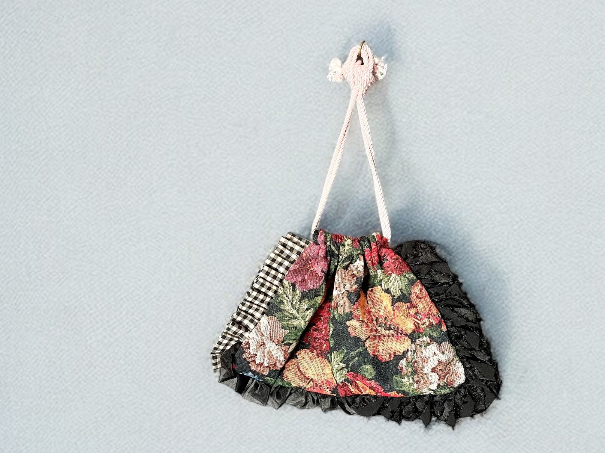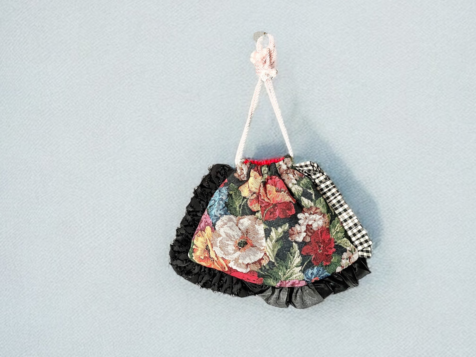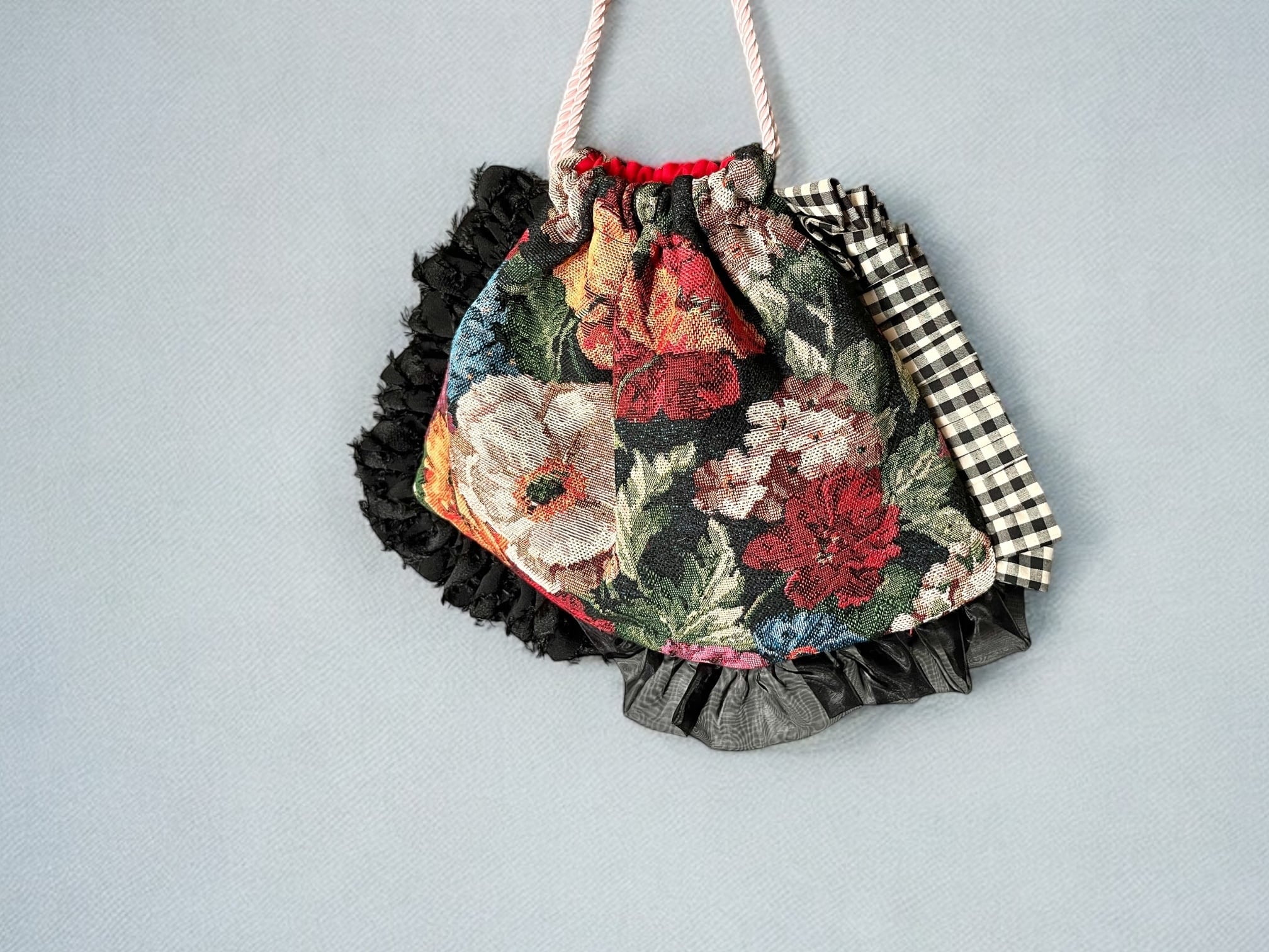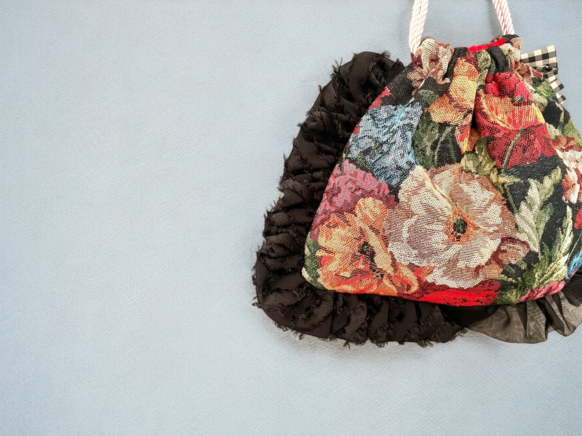 ブラックのチュールフリルやギンガムチェックフリル、品のあるピンクのタッセル紐がかわいい。
