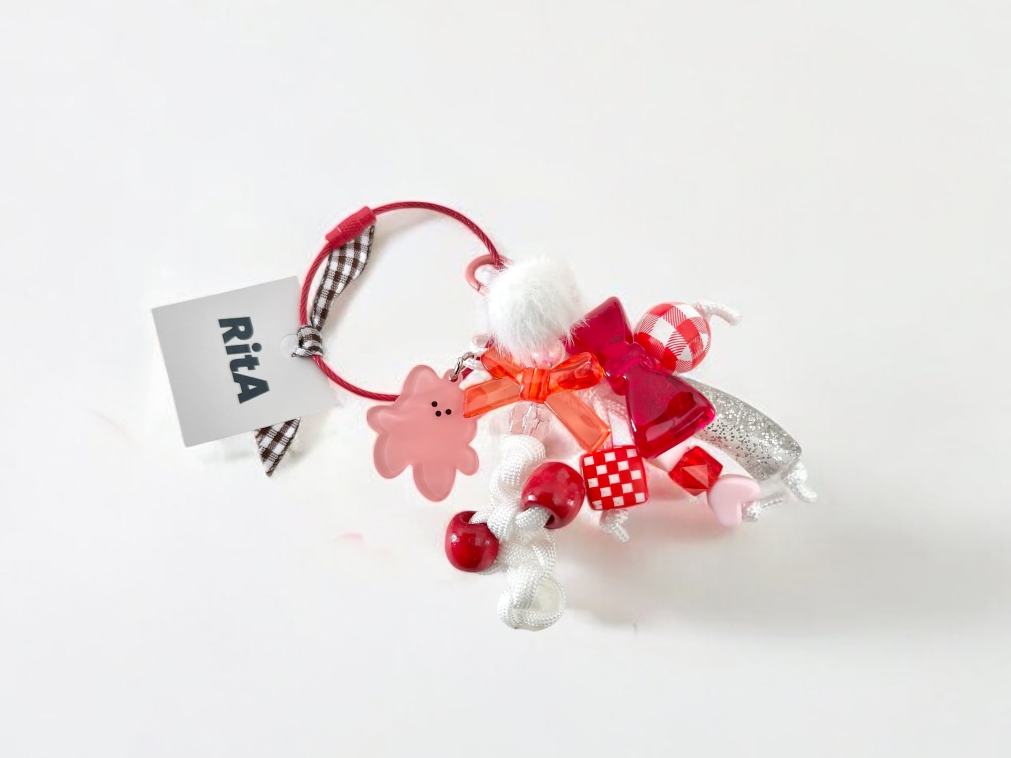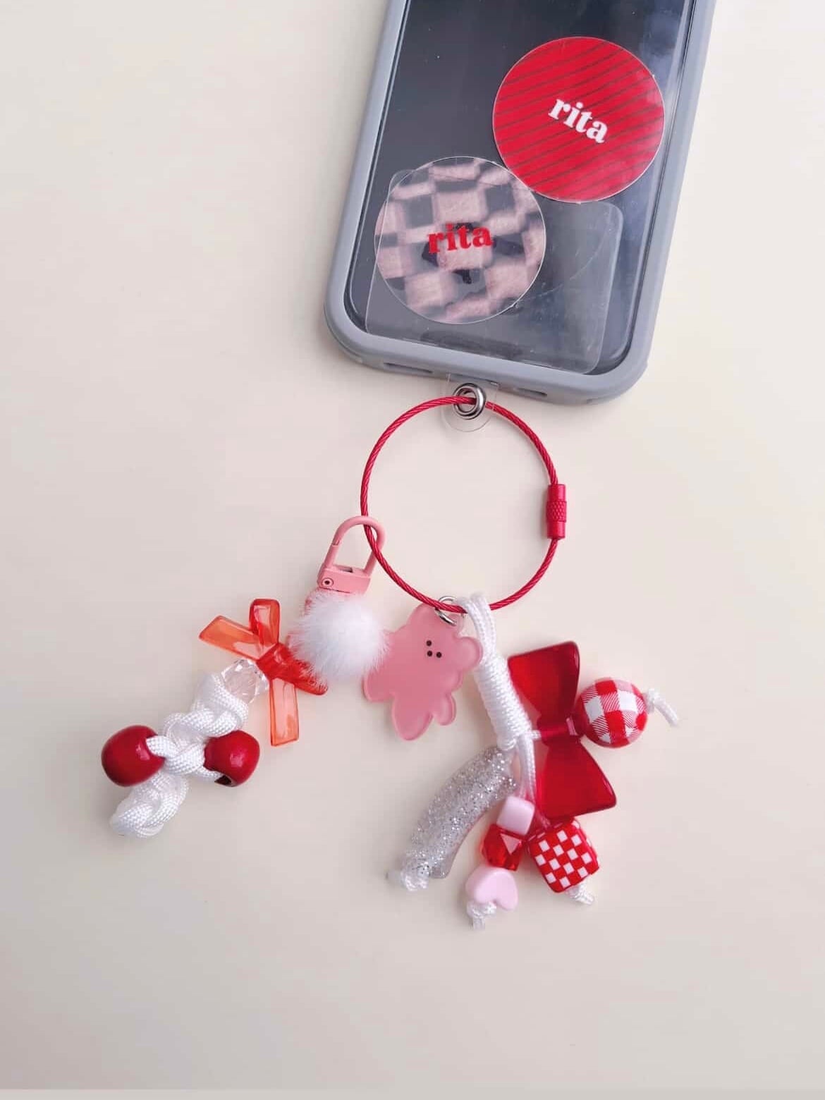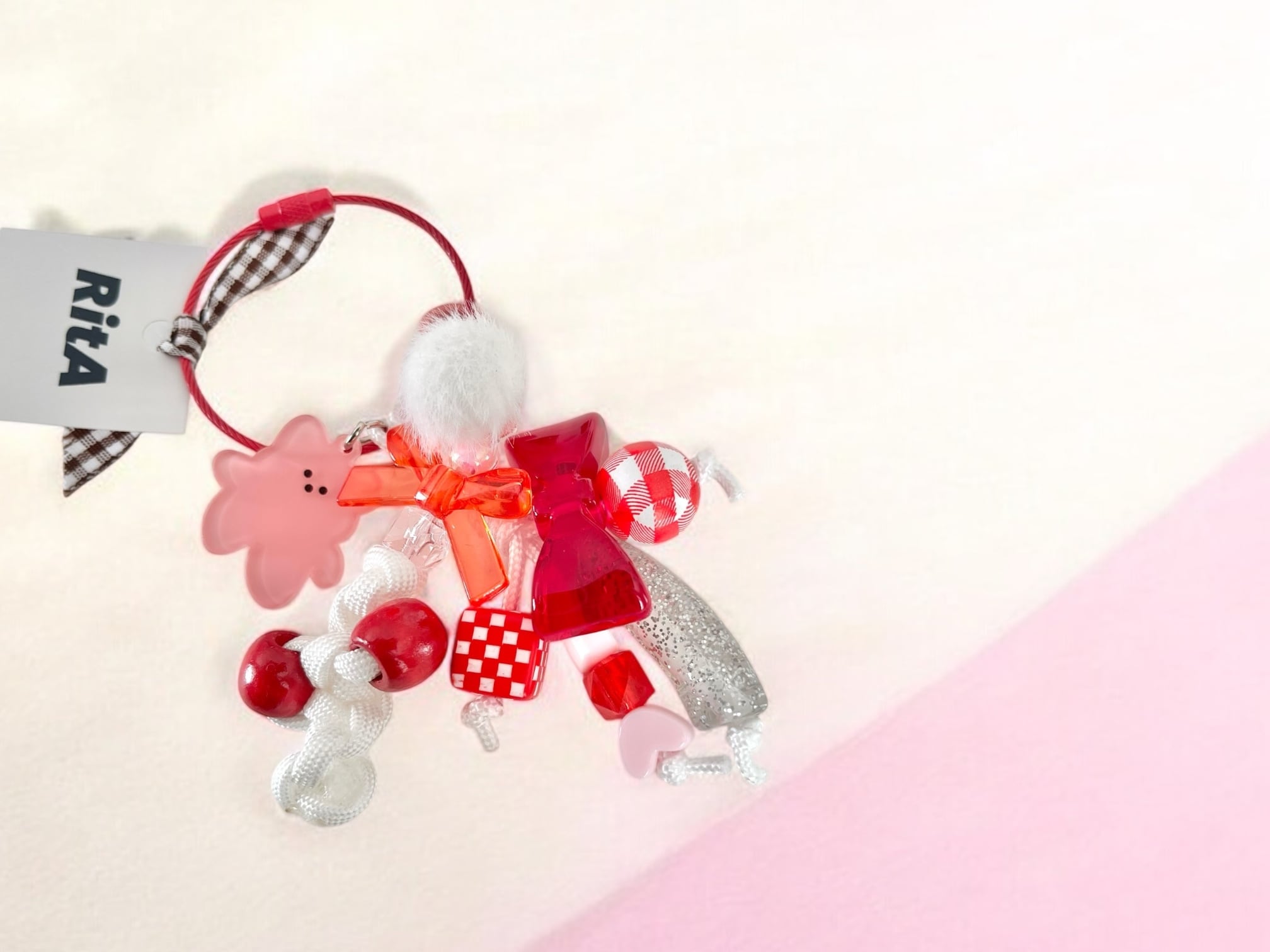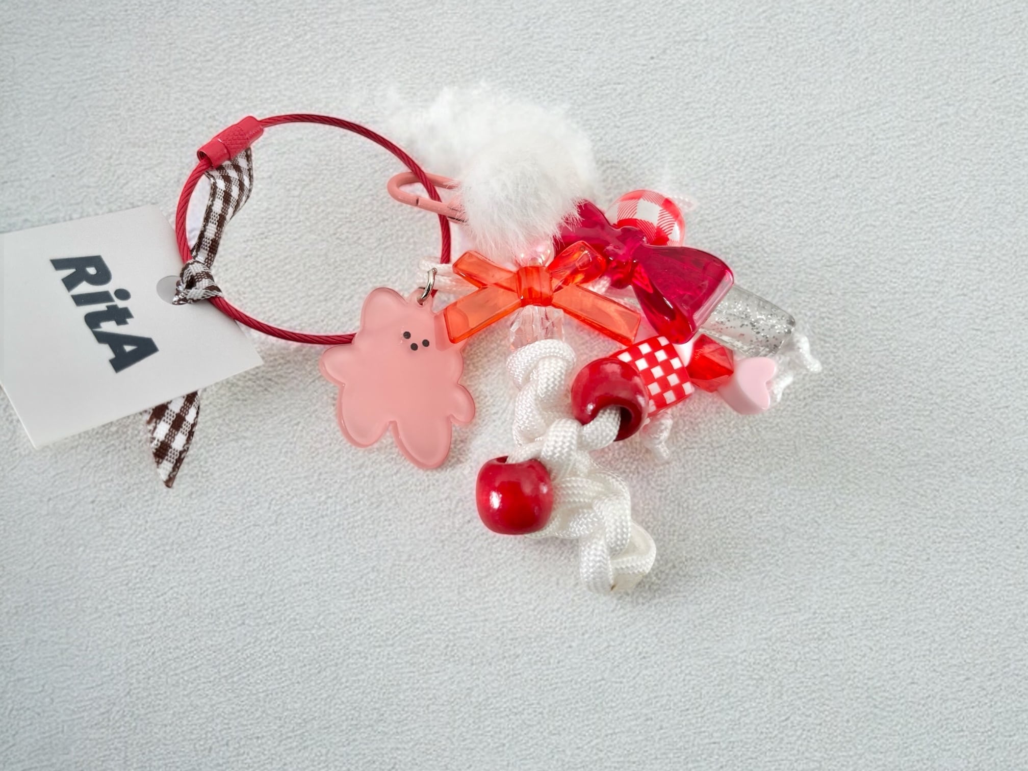 リボンにレッドカラーのパーツ、ピンクのくまさんの組み合わせがかわいい小ぶりなストラップ