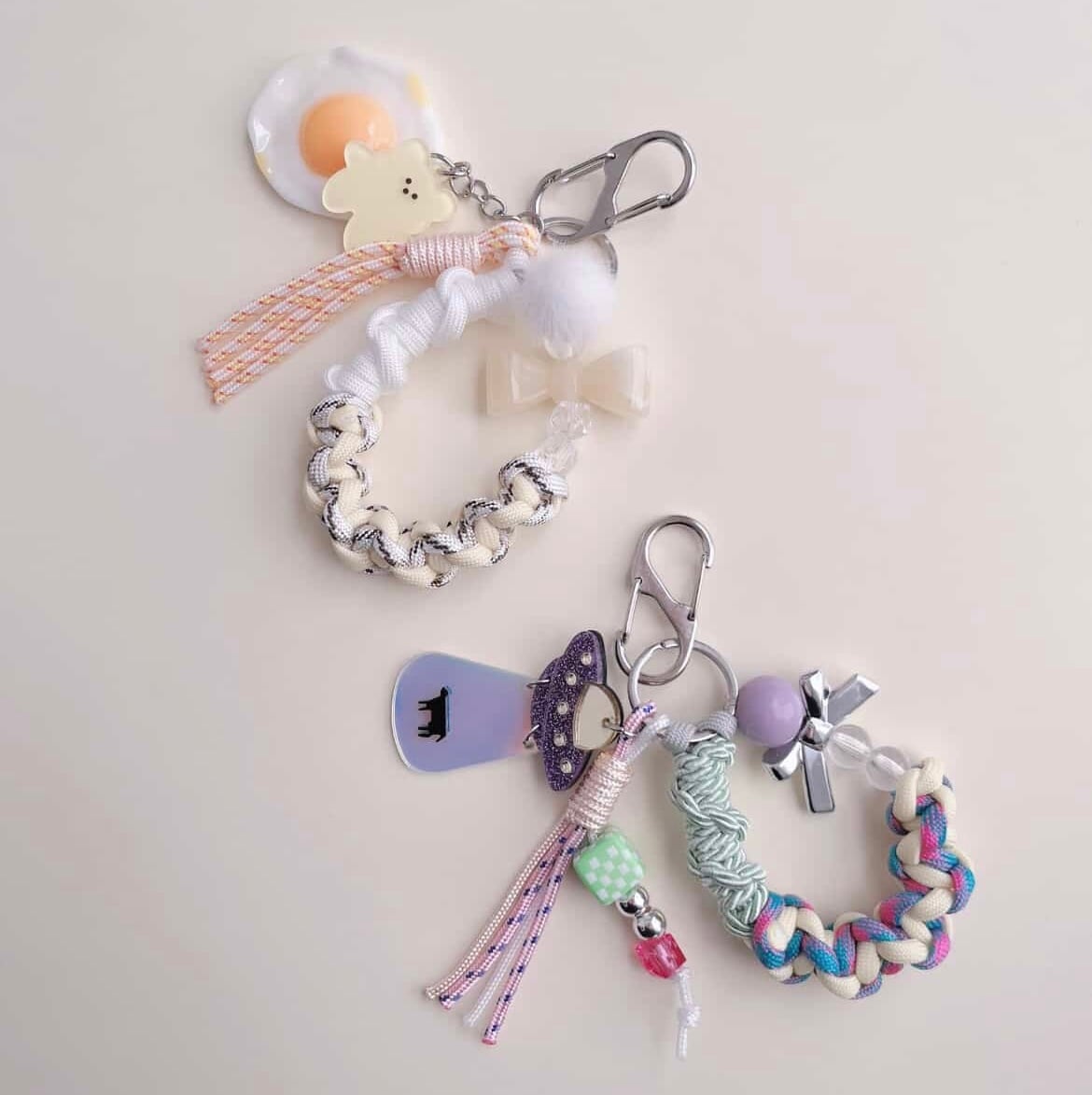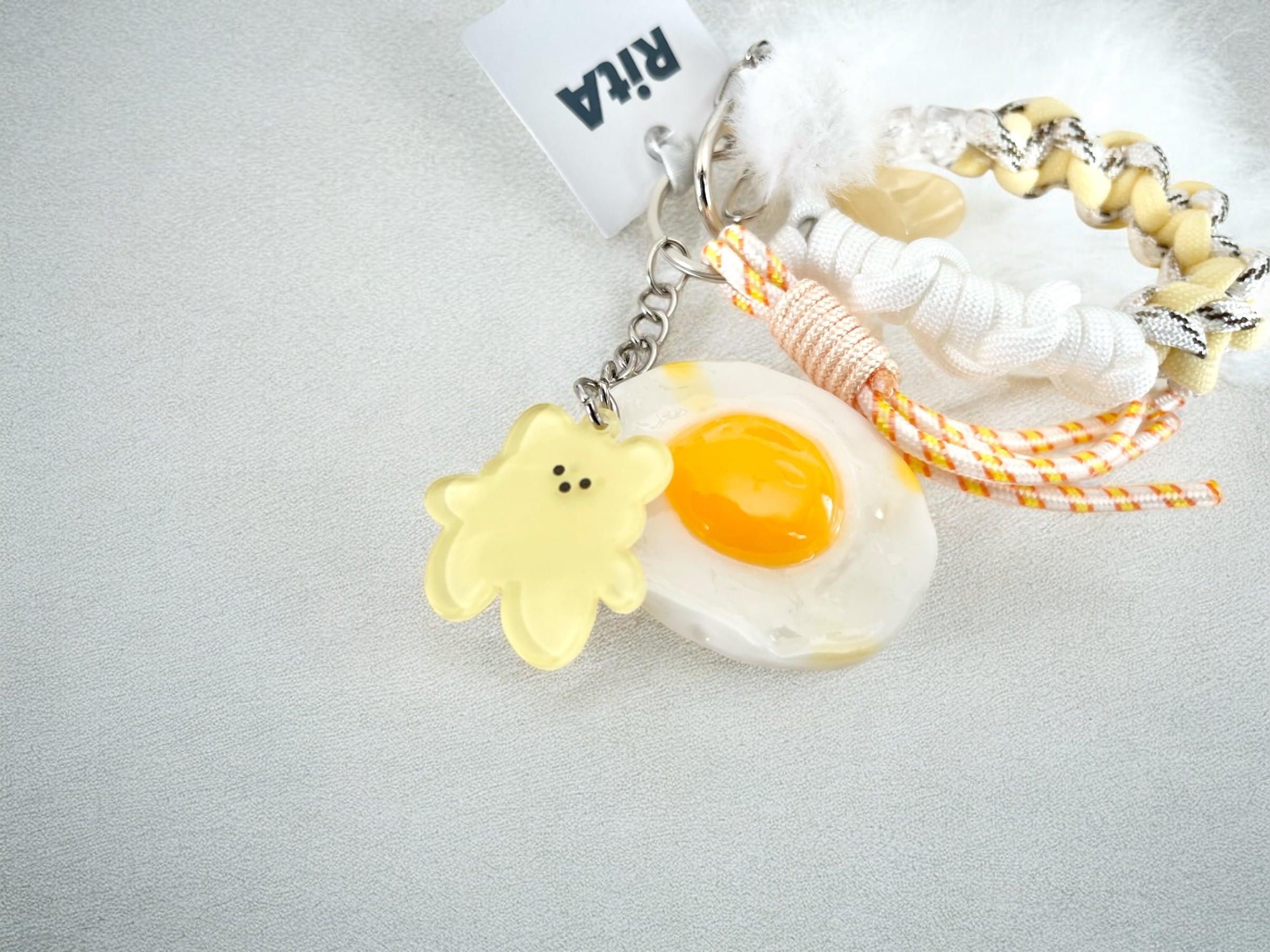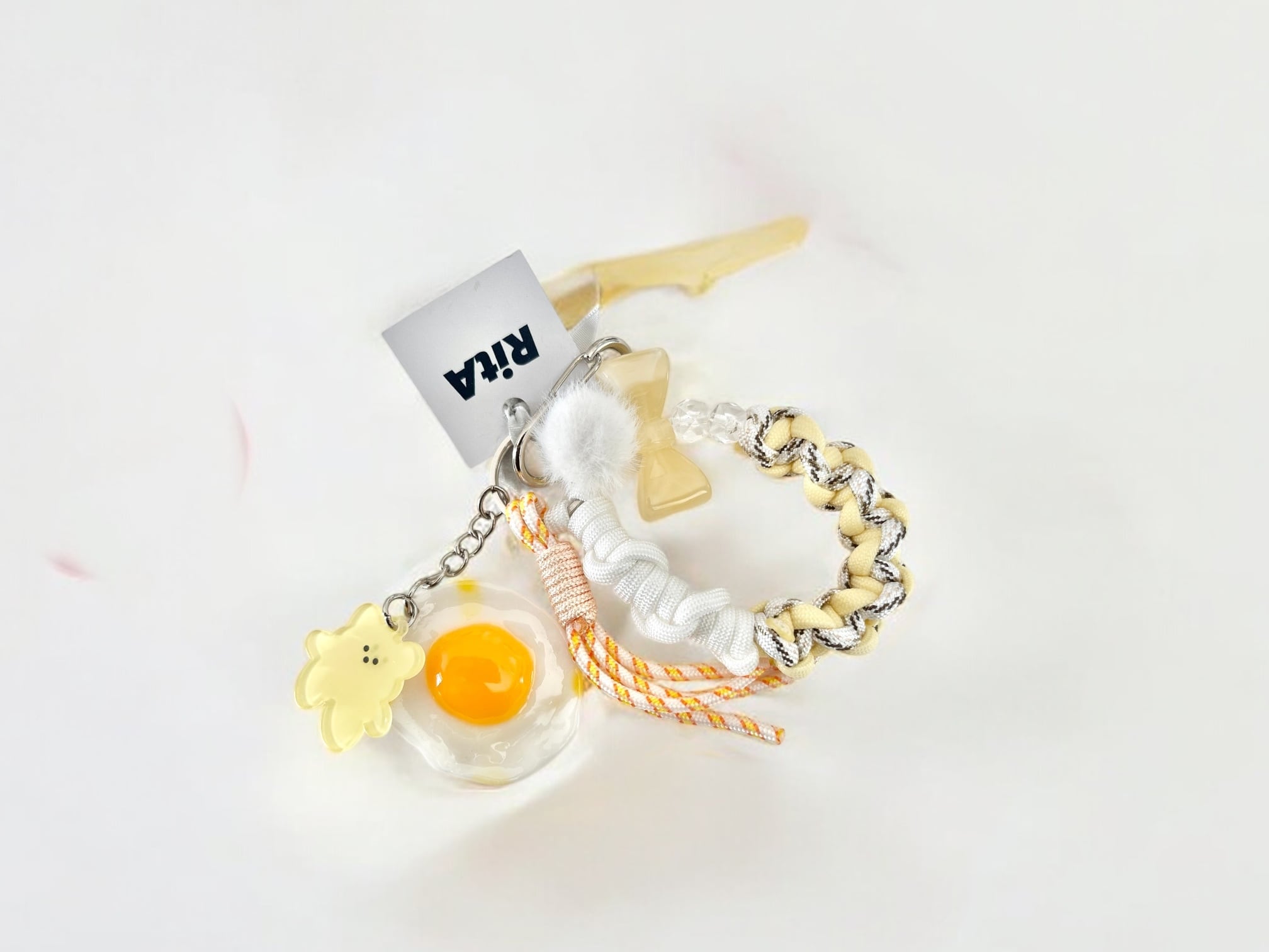 リボンにクリームカラーのグラデーションコード、リアルな目玉焼きに黄色のくまさんの組み合わせがかわいい小ぶりなストラップ