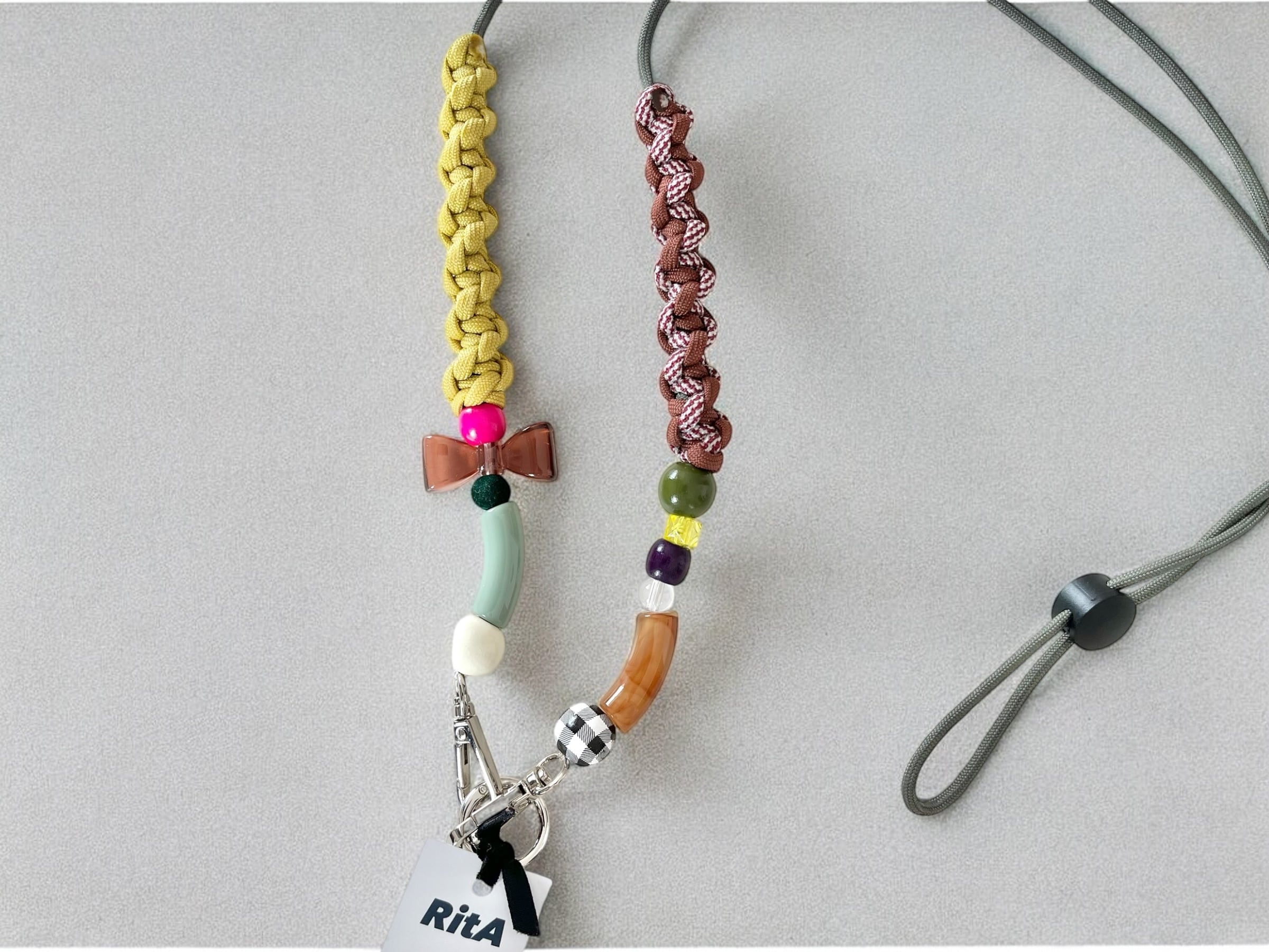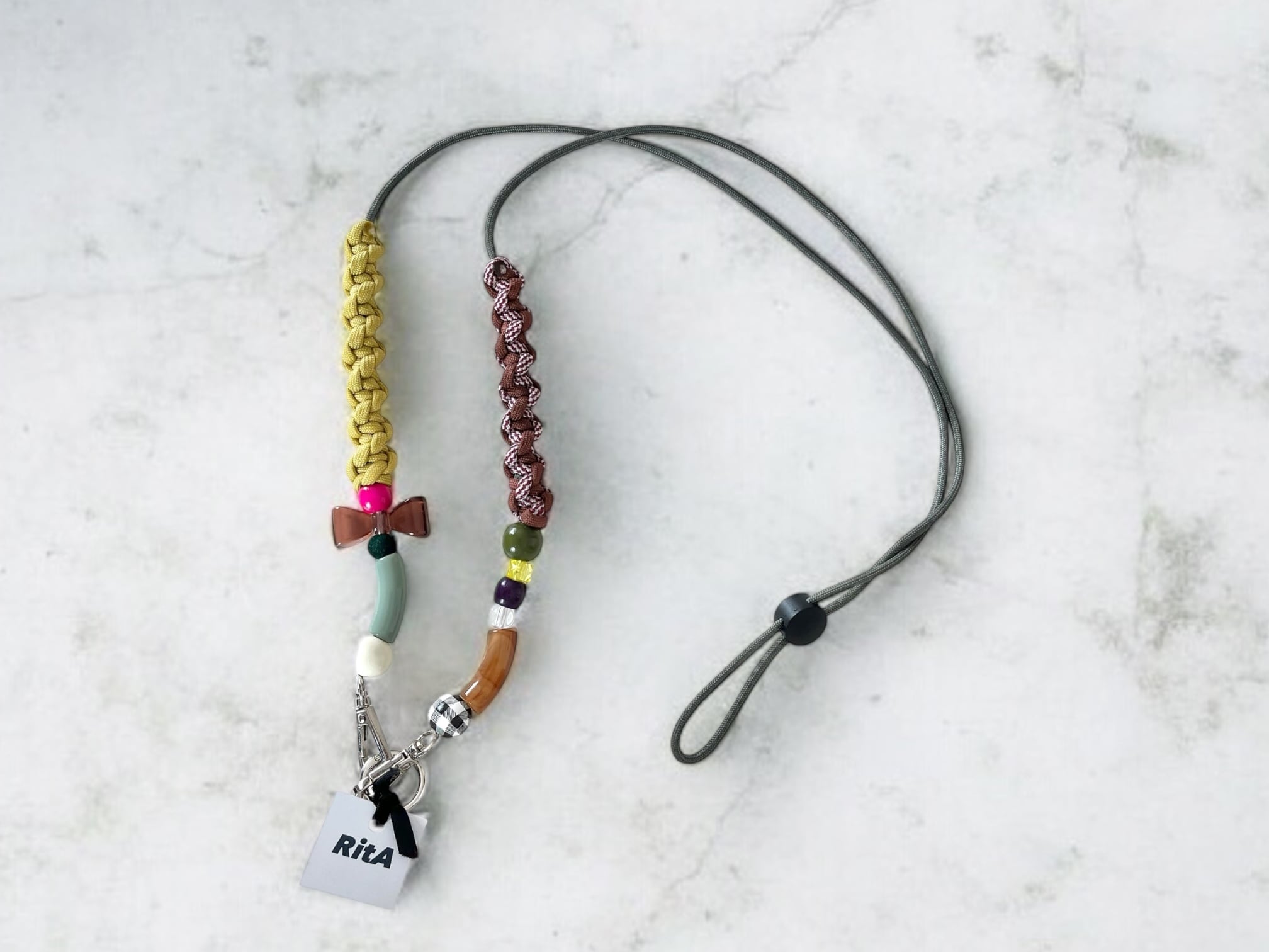 ブラウンのアクリルリボンやおしゃれカラーのウッドビーズ、落ち着いたカラーのコードでおしゃれなまとまりがある一点