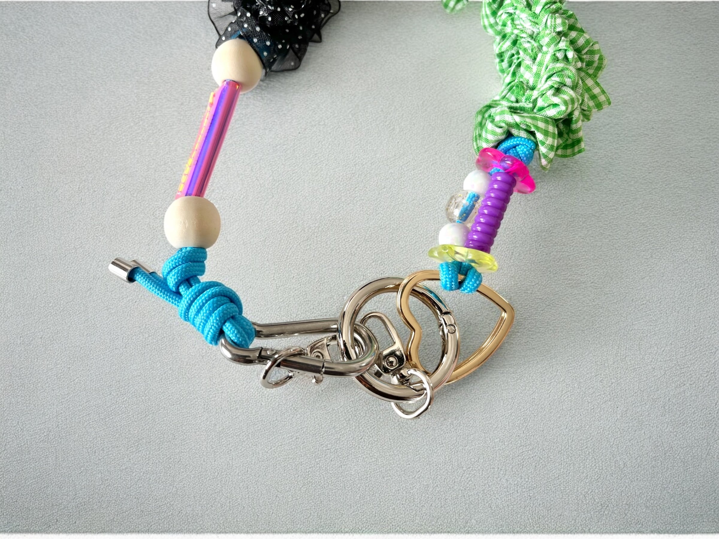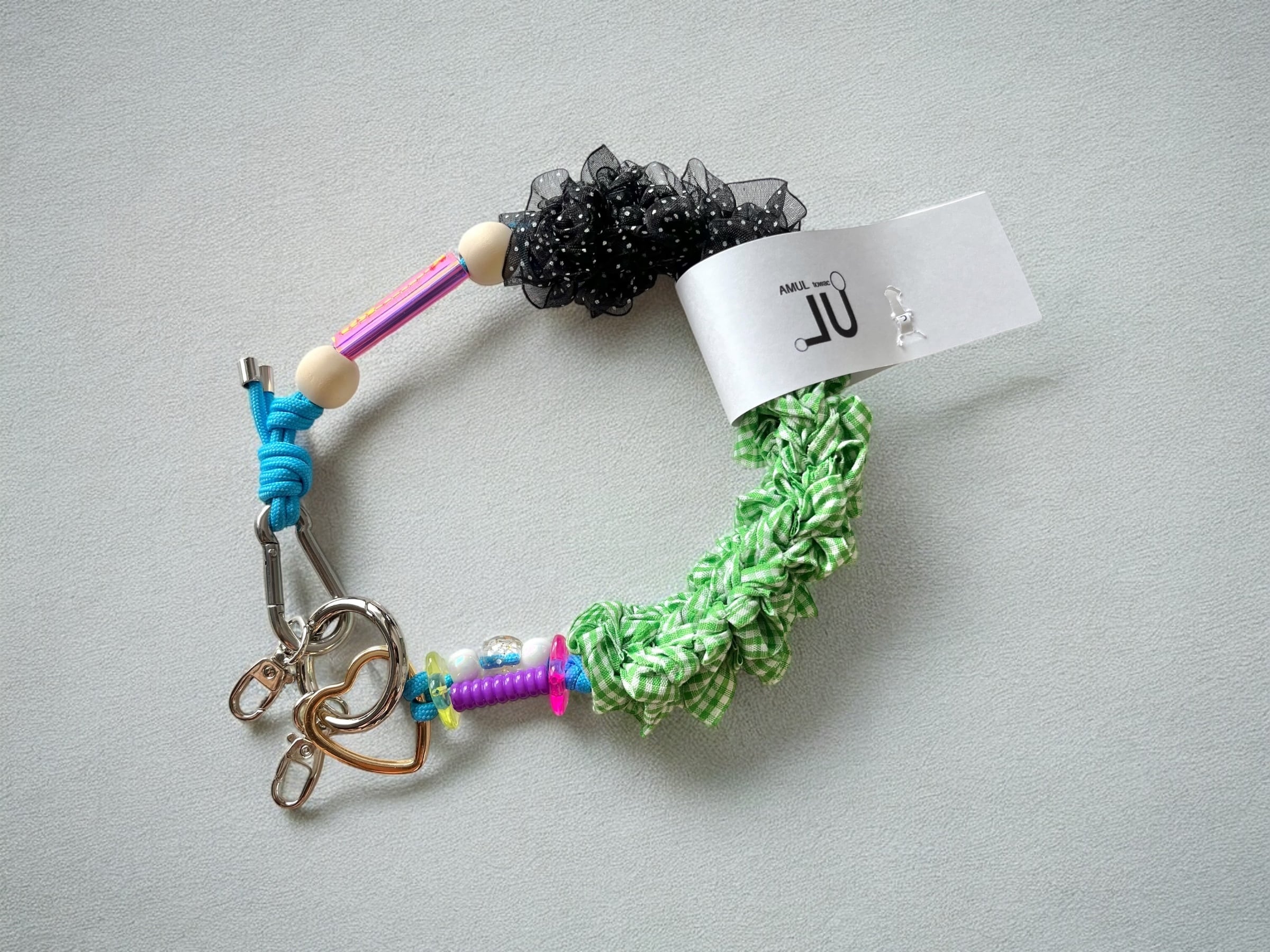 オーガンジーやサテン、ギンガムチェックやドット、くるくるしたチューブのような素材など、カラフルな異素材の組み合わせにプラスチックパーツなども入ったかわいいストラップです。