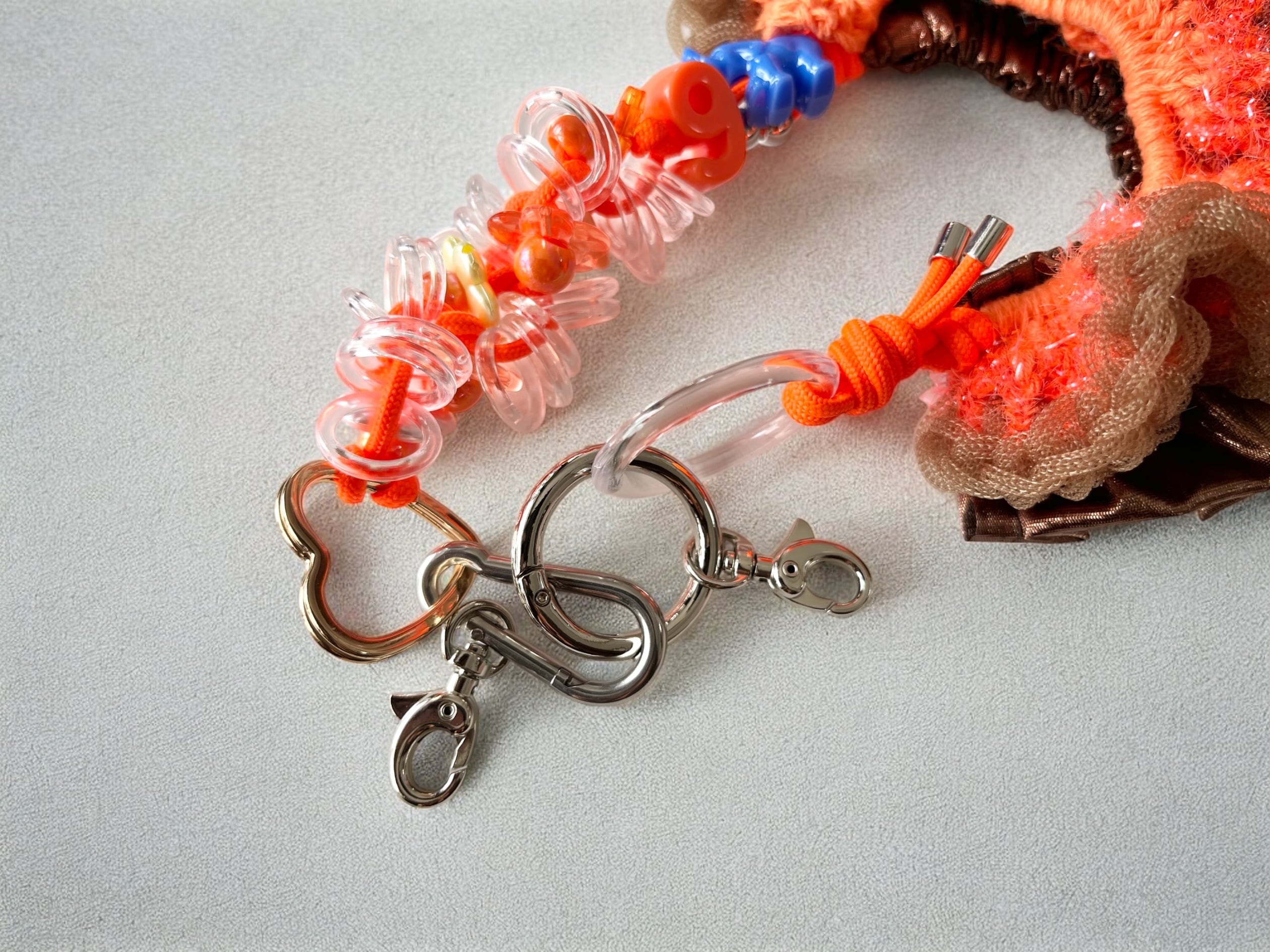 オーガンジーやサテン、ギンガムチェックやドット、くるくるしたチューブのような素材など、カラフルな異素材の組み合わせにプラスチックパーツなども入ったかわいいストラップです。