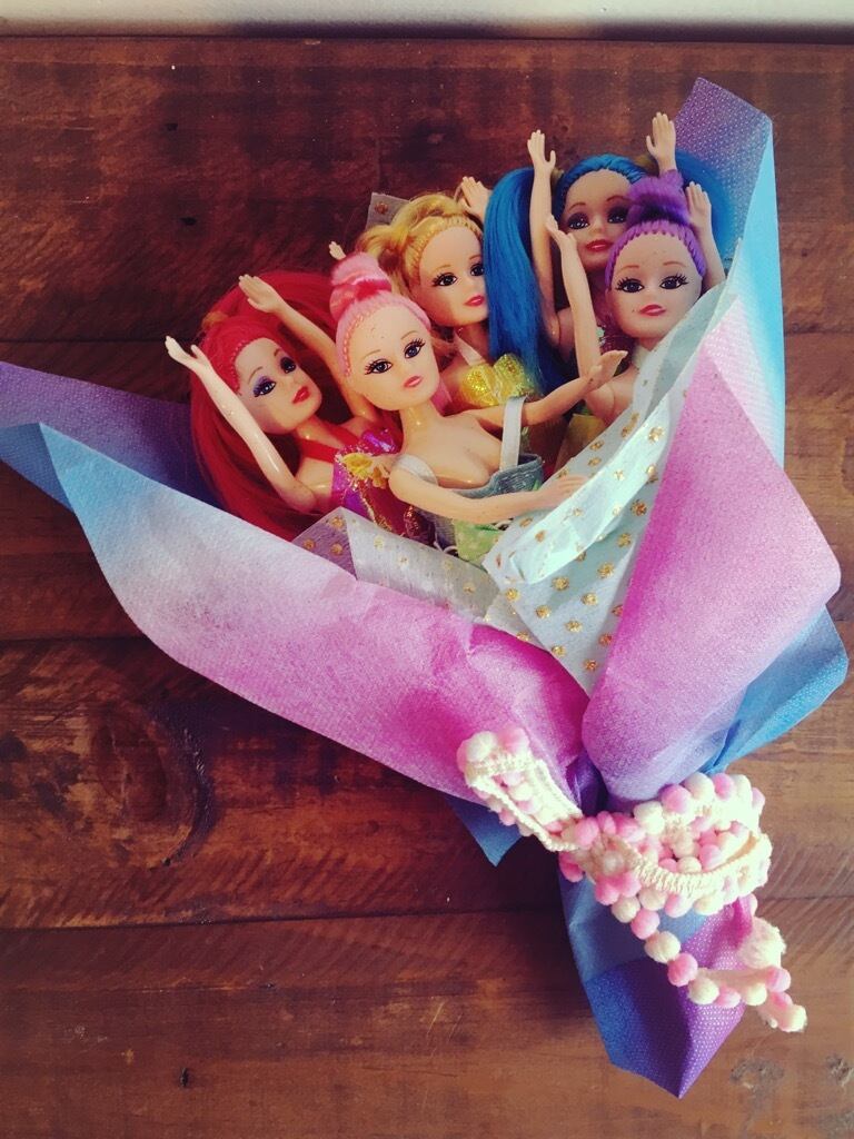 ミニサイズのお人形さん5体がブーケになったユニークなドールブーケ