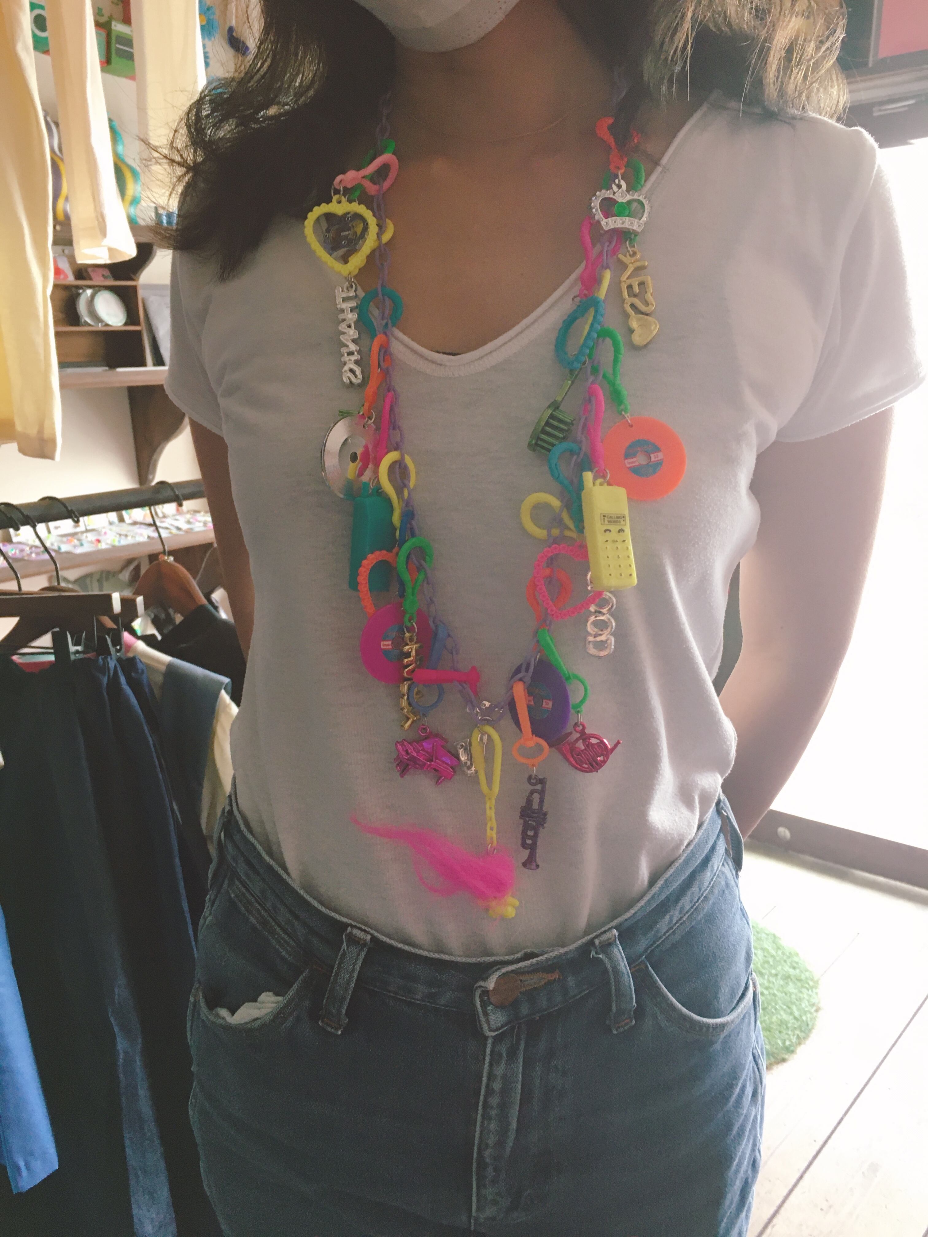 80年代風のかわいいチャームがたくさんついたロングネックレス