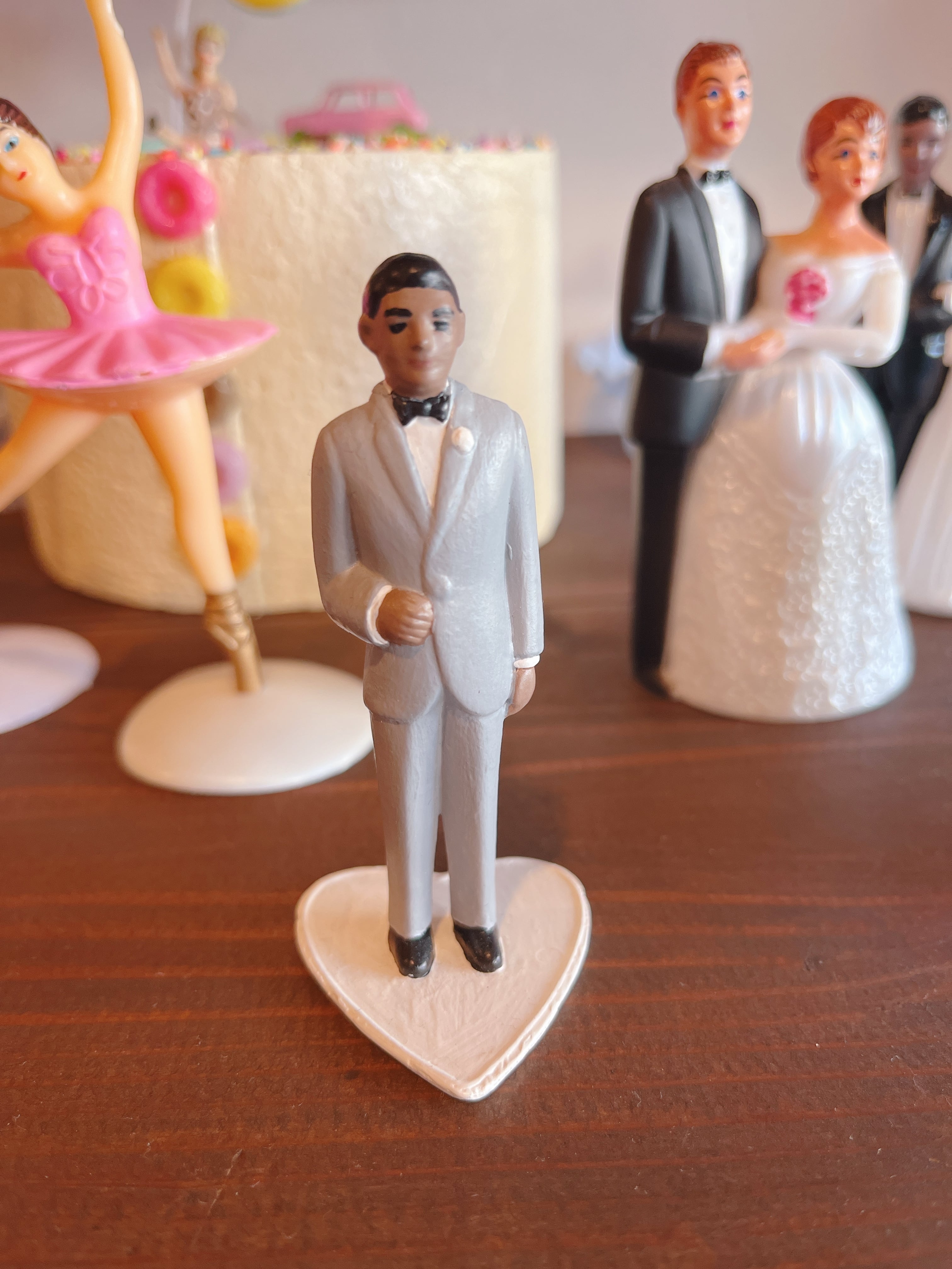 ハートの土台がかわいい新郎のケーキトッパーです。