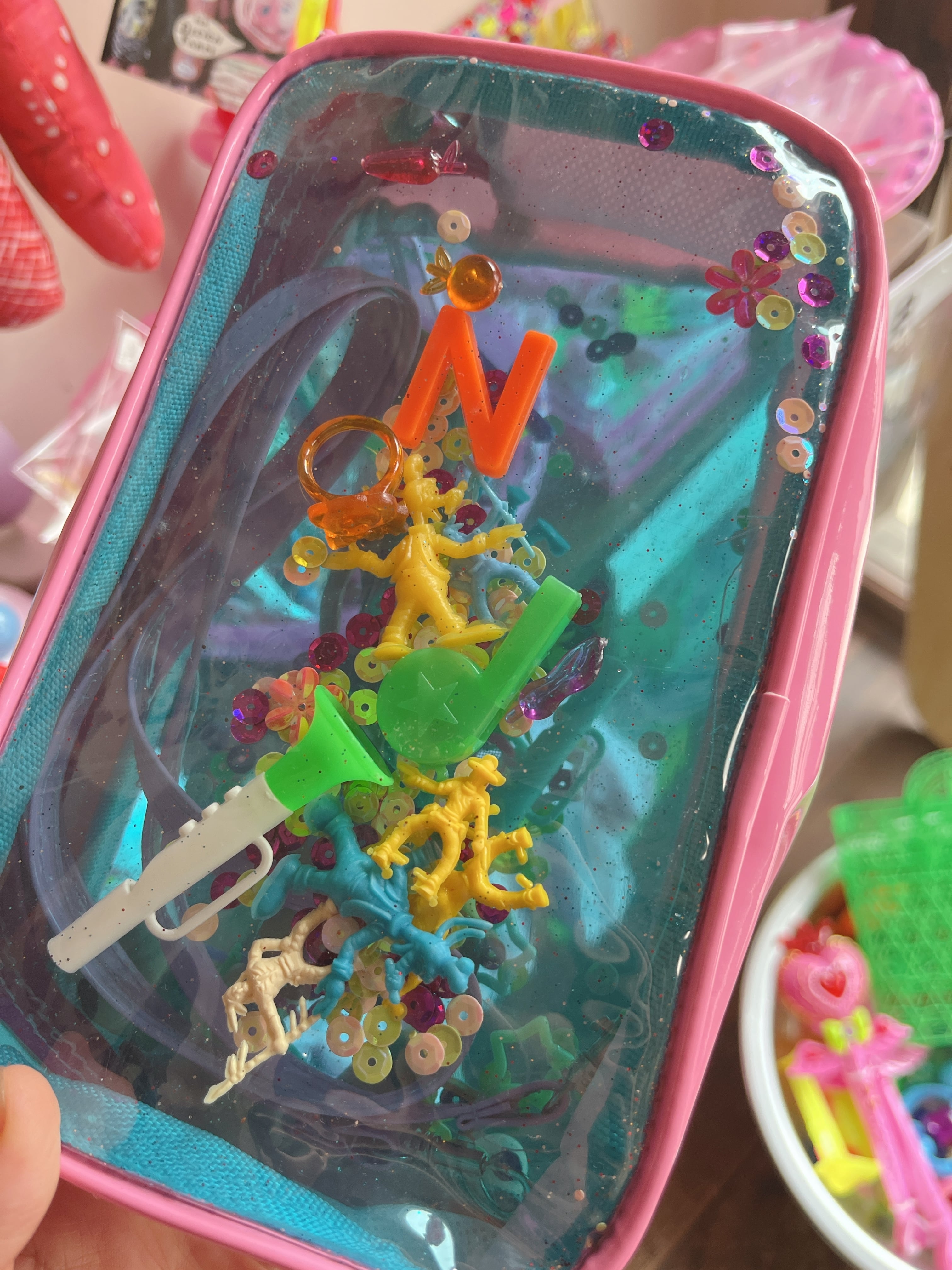 オリジナルカラーで作って貰いました。小さなお人形やスパンコール、パーツが閉じ込められたかわいいポーチです。ショルダー紐もあり、ショルダーにもなります。