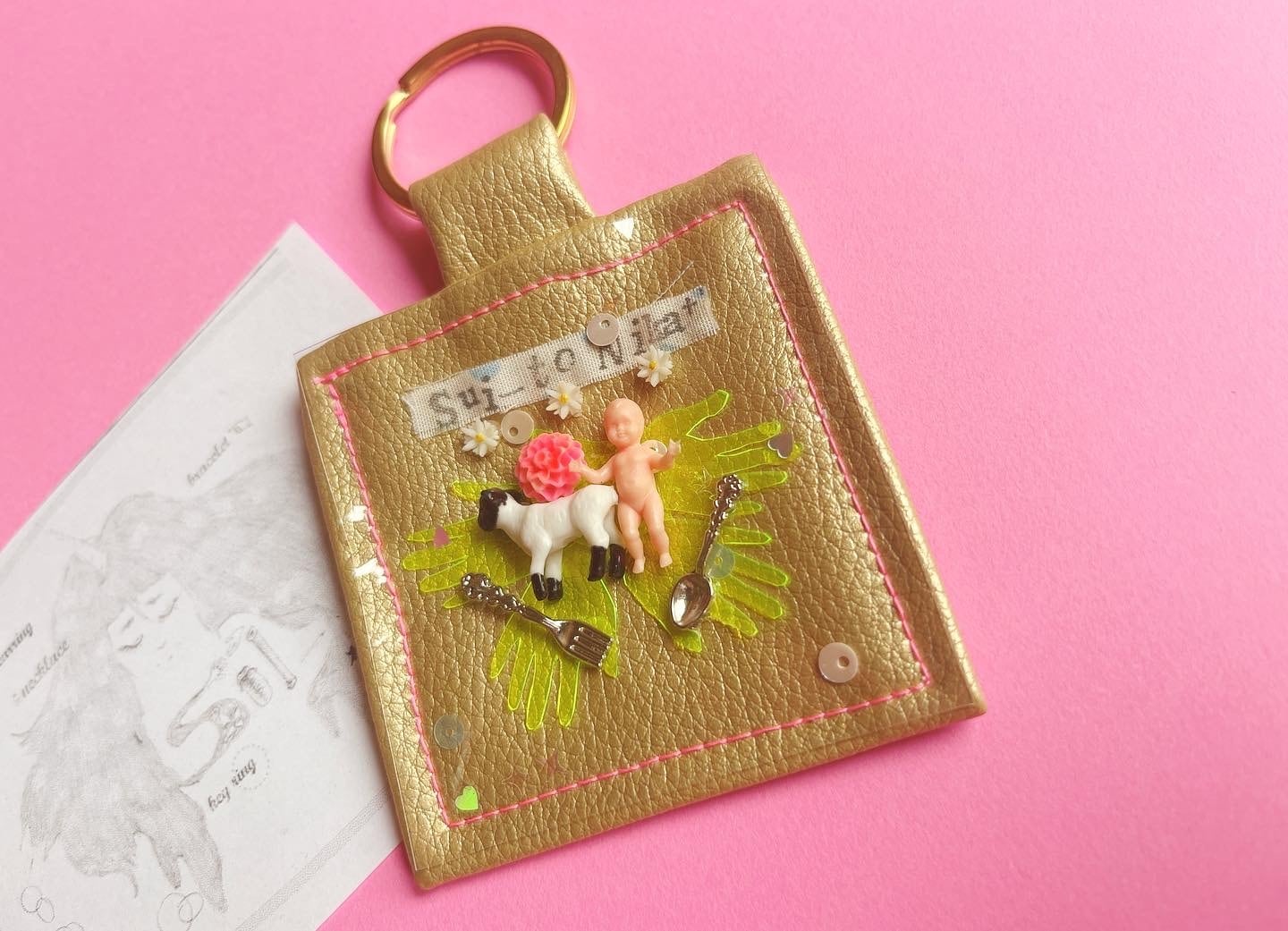 ゴールドのボディに、羊さんとベイビーが閉じ込められたキーホルダー