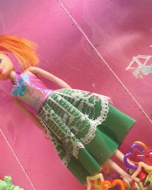 小さなおもちゃパーツやお人形さんが入ったかわいいデザインのビニールバッグです、