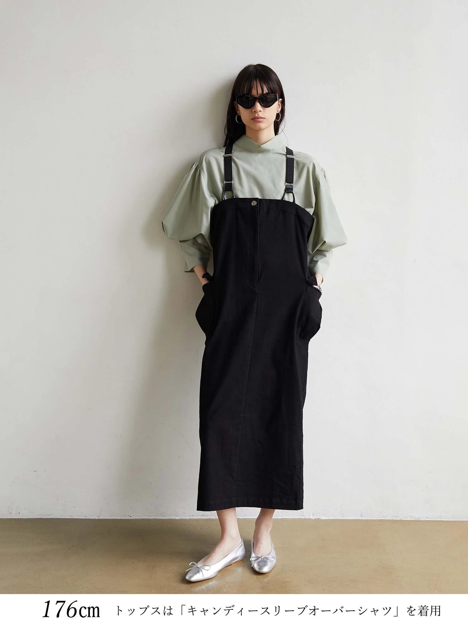 大人っぽいジャンパースカートとしてコーディネートが完成します。