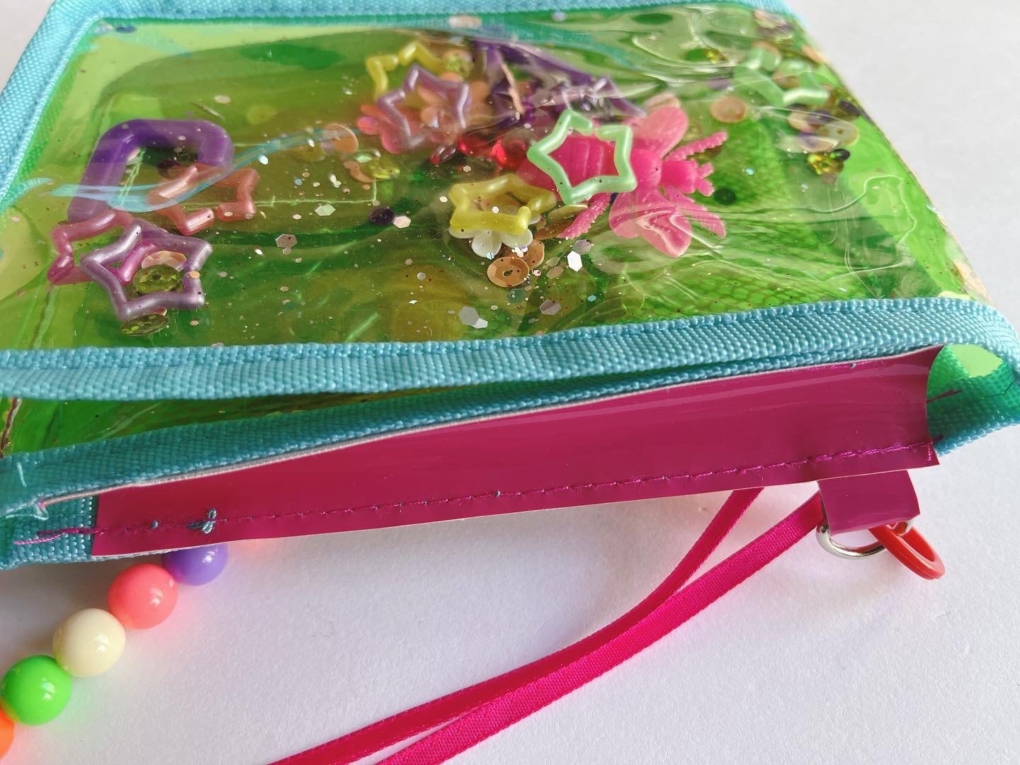 小さいおもちゃパーツが入ったビニール素材のミニポシェット。