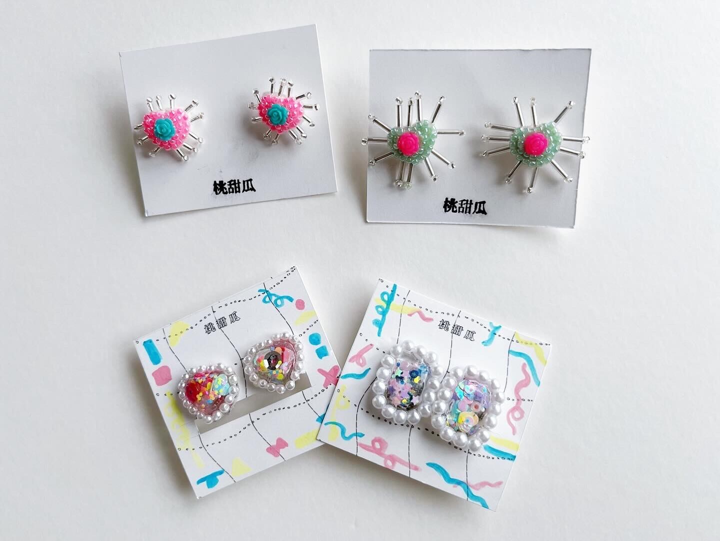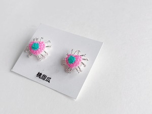 ピンクのハートに突き出しているシルバーの筒ビーズがかわいいピアス